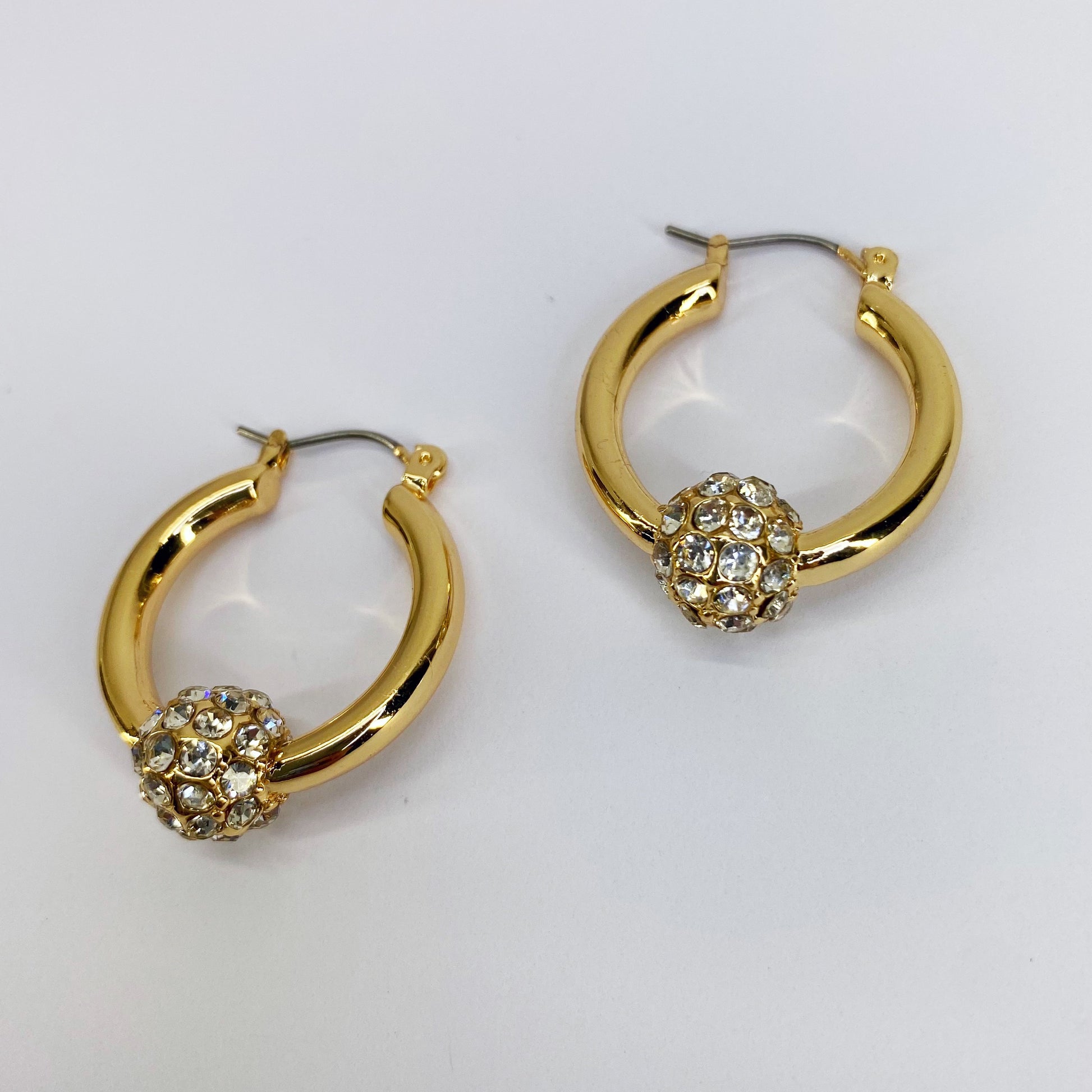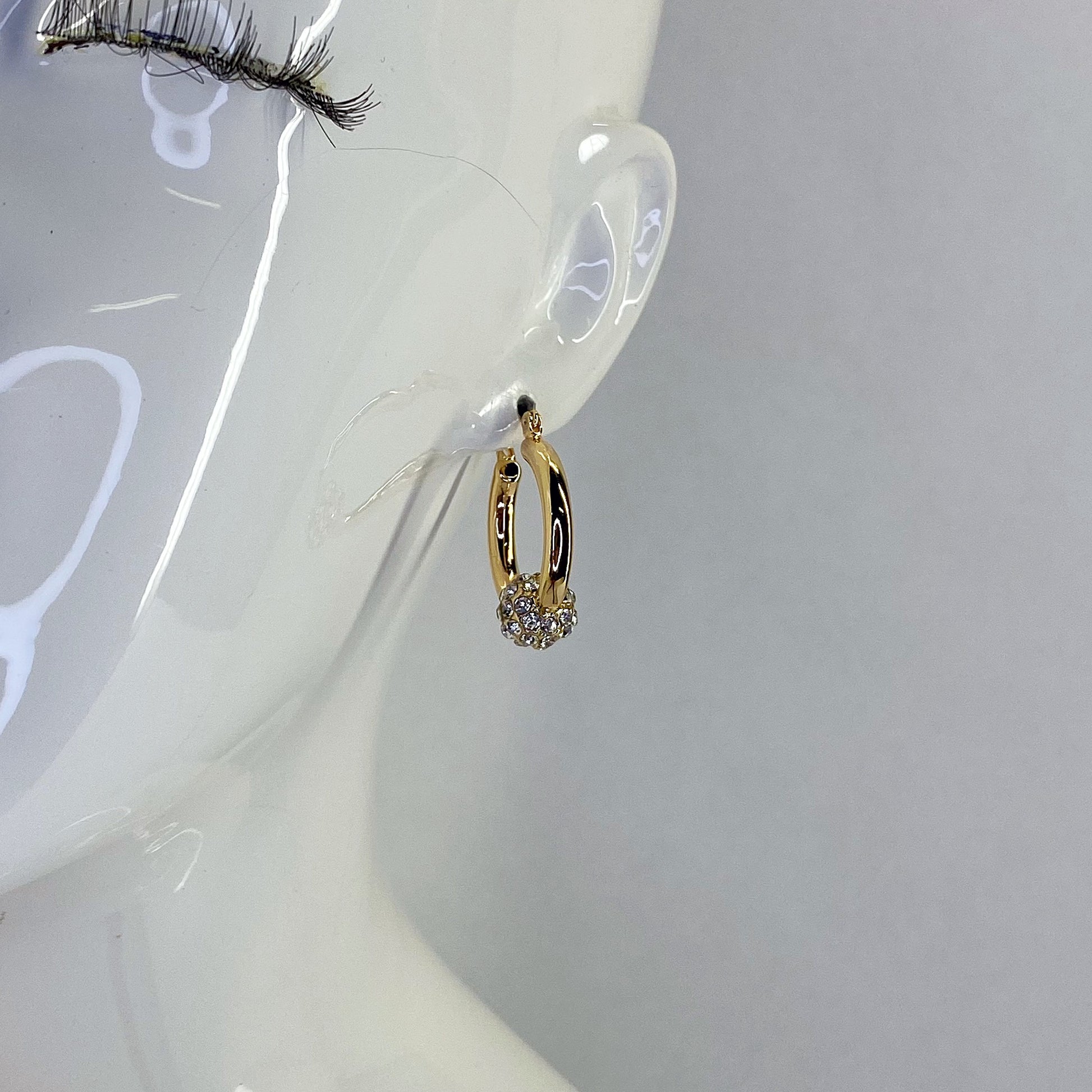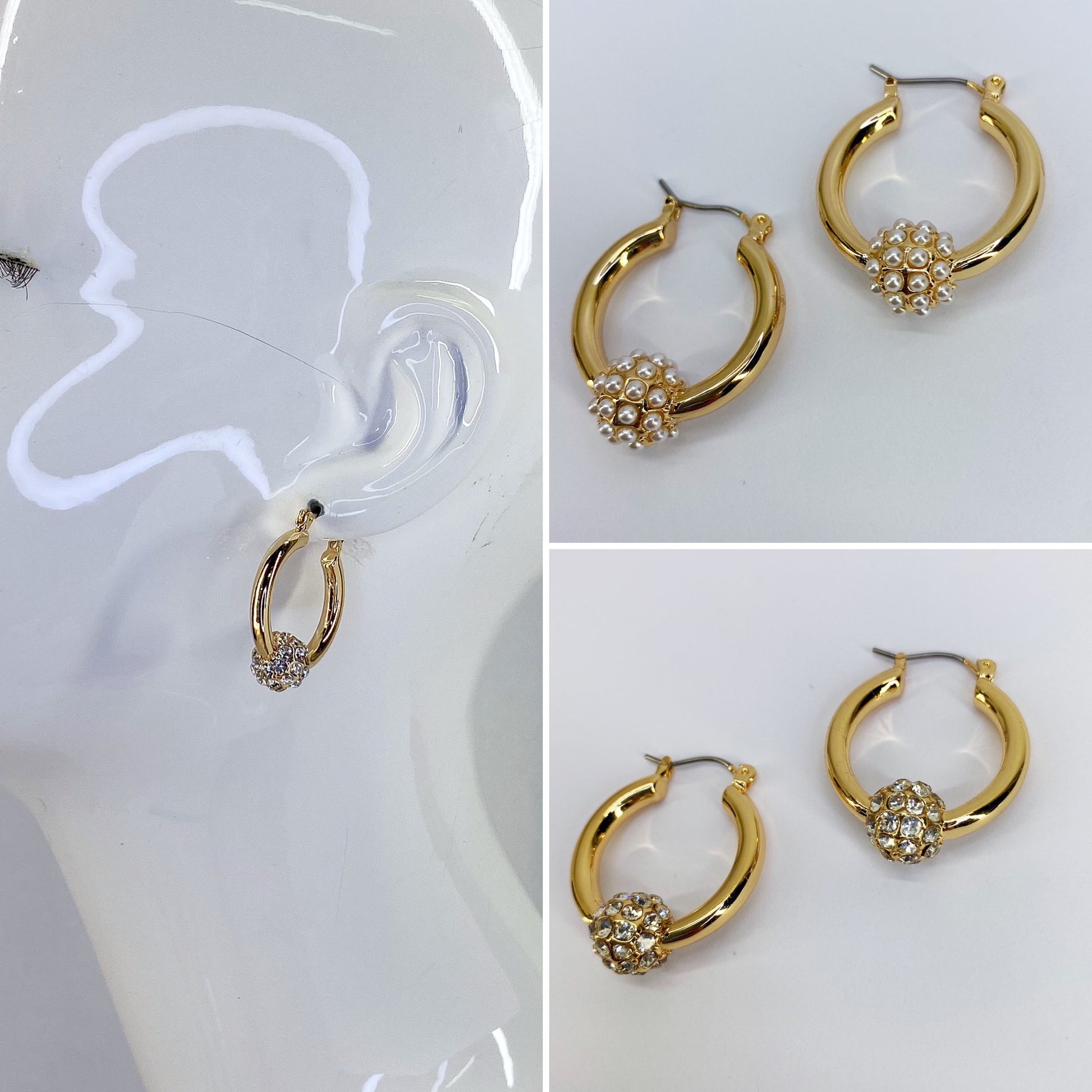 These earrings feature small hoops adorned with either rhinestones or pearls for a touch of elegance and sophistication.