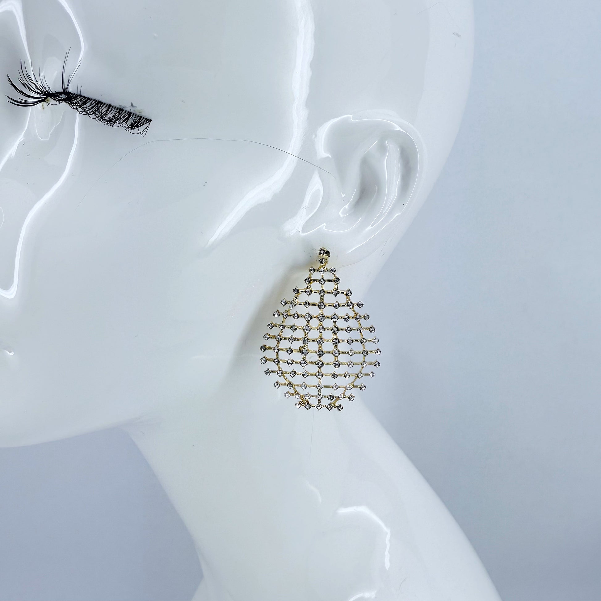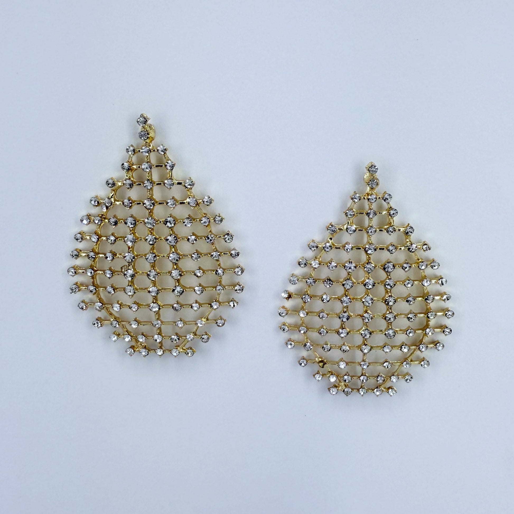 Elevate your style with these teardrop-shaped earrings featuring a delicate gold finish mesh adorned with sparkling rhinestones for a touch of elegance.