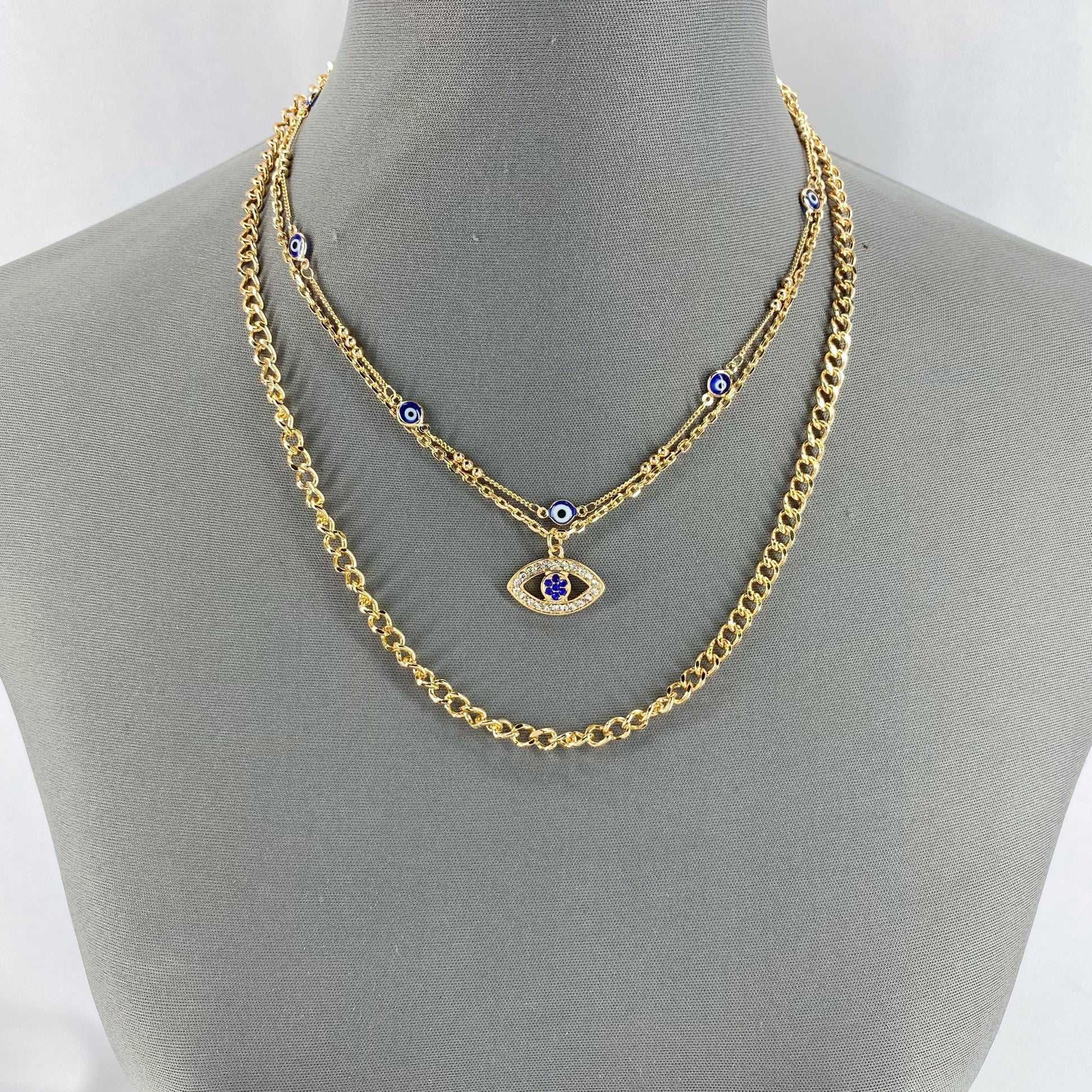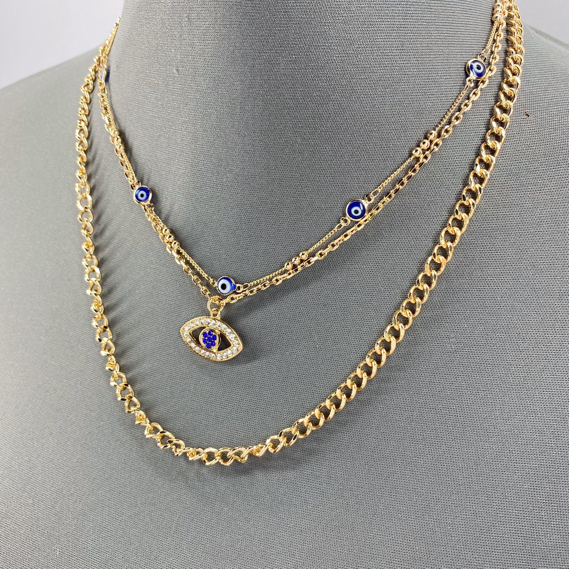 Multi Chains Necklace With Evil Eye And Rhinestone Pendant
