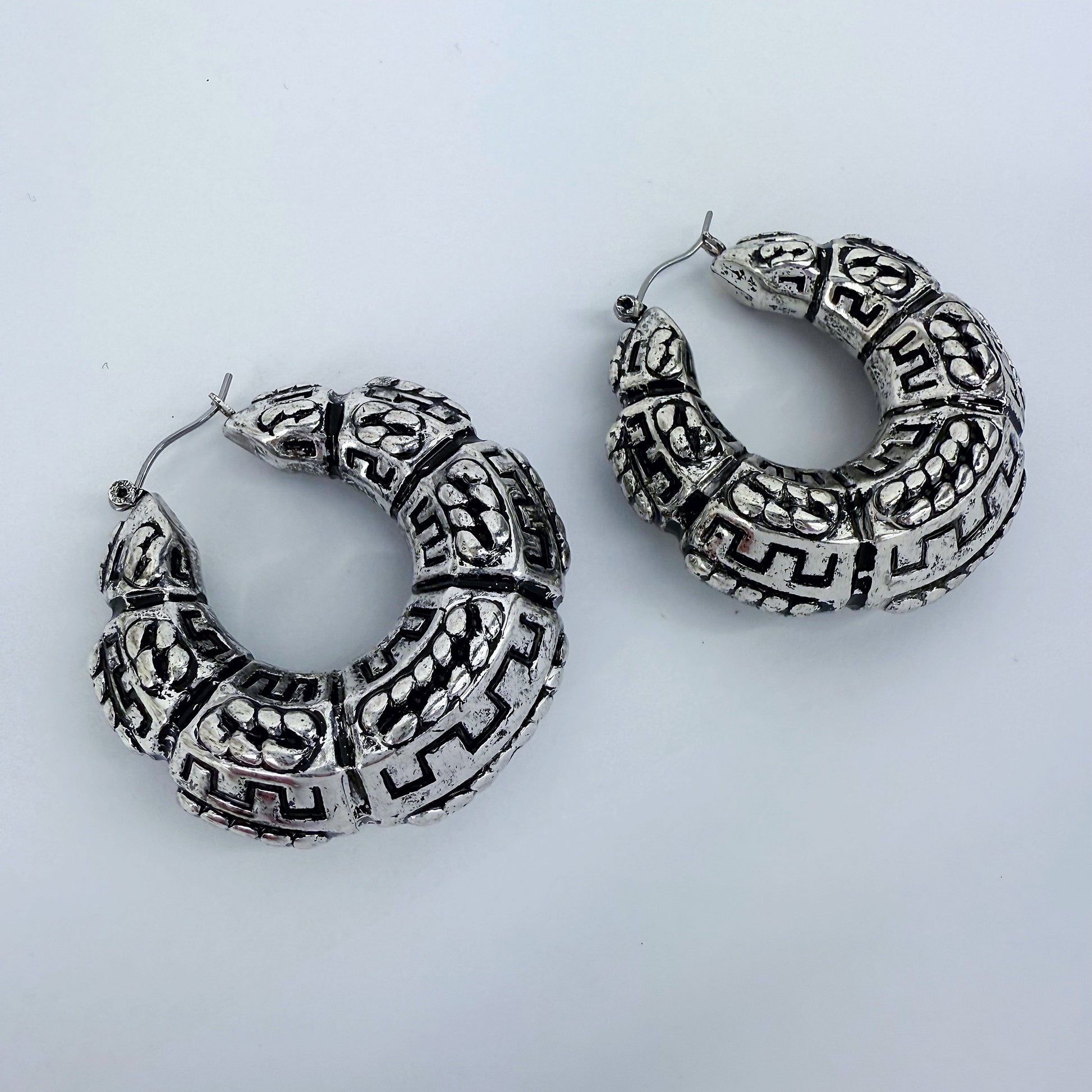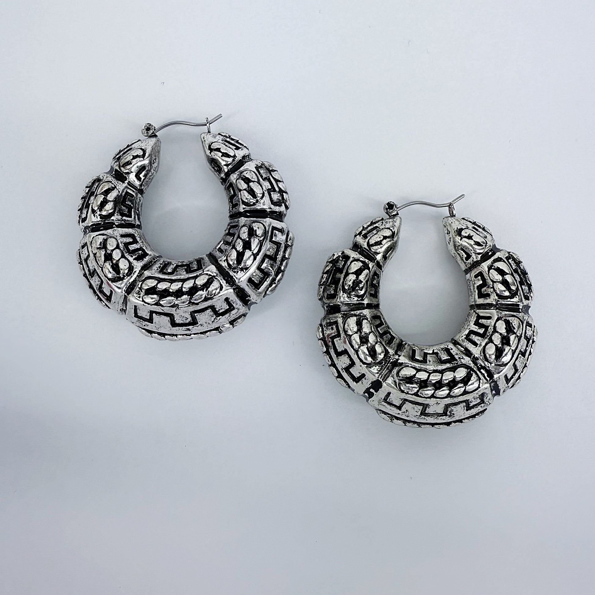 Enhance your outfit with these stunning Silver Finish Tailored Hoop Earrings featuring a classic Western pattern. These earrings are the perfect addition to any jewelry collection, providing a modern twist on a timeless design. Perfect for any occasion, these earrings are sure to make a statement and add a touch of sophistication to your look.