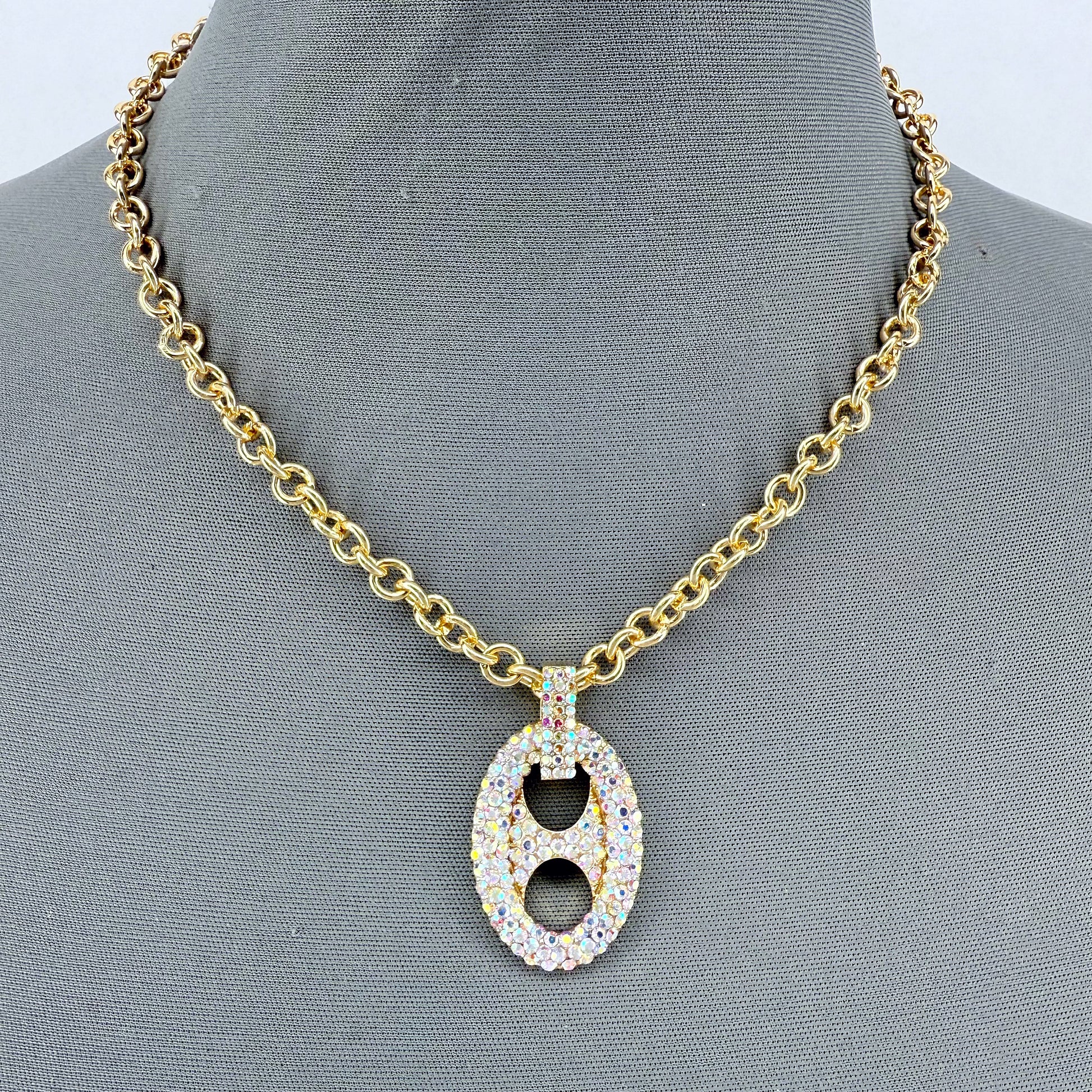 Elevate your style with our stunning Gold Finish Ring Chain Necklace featuring a dazzling Rhinestone Pendant. Experience luxury and sophistication with every wear.