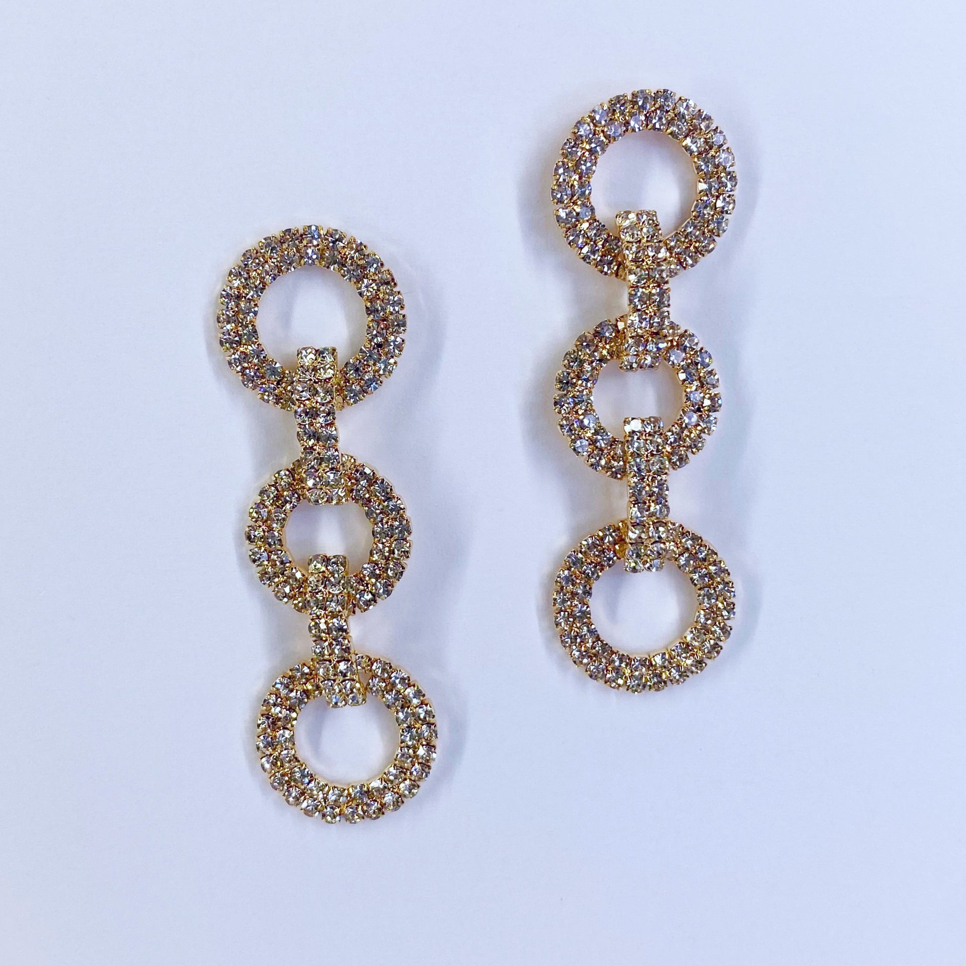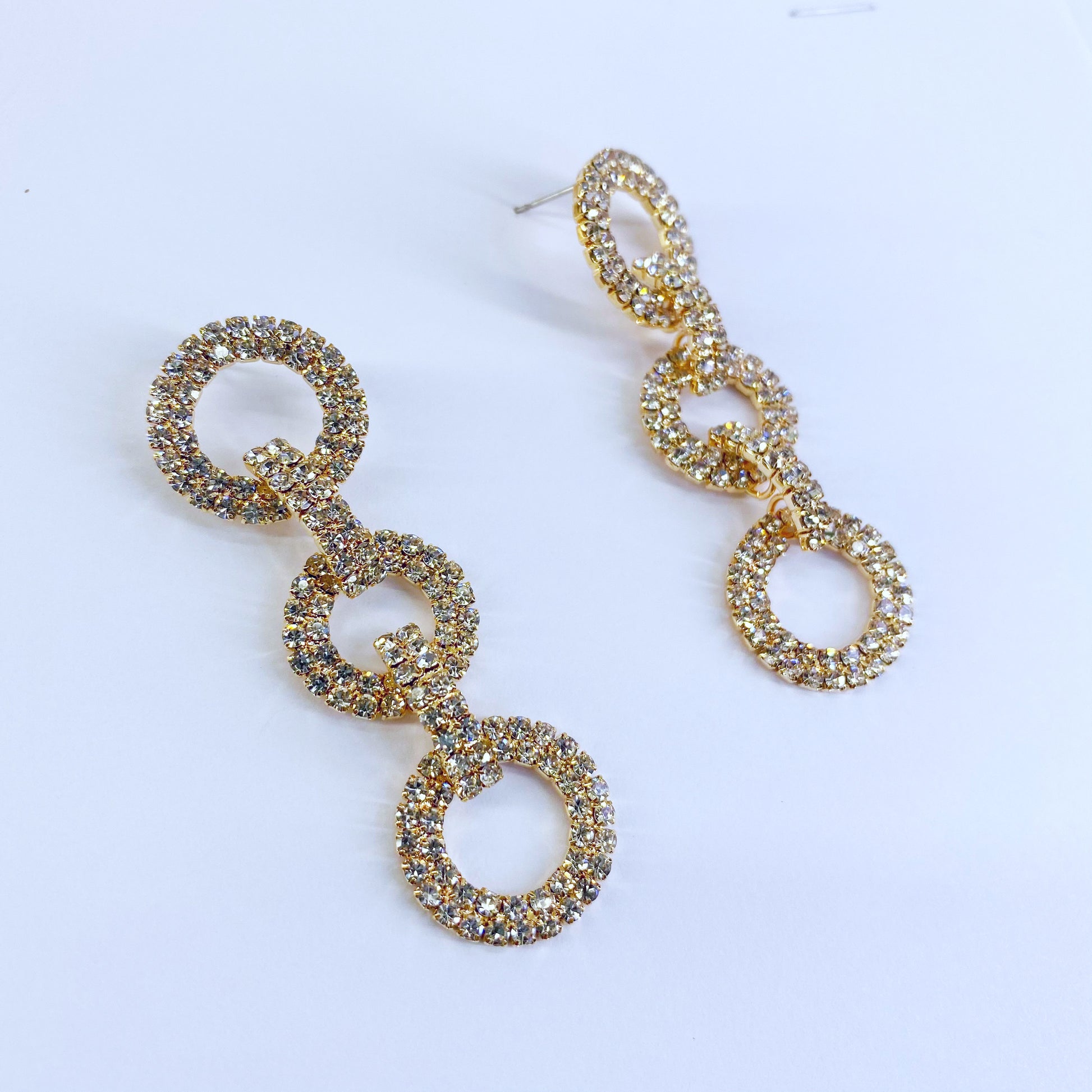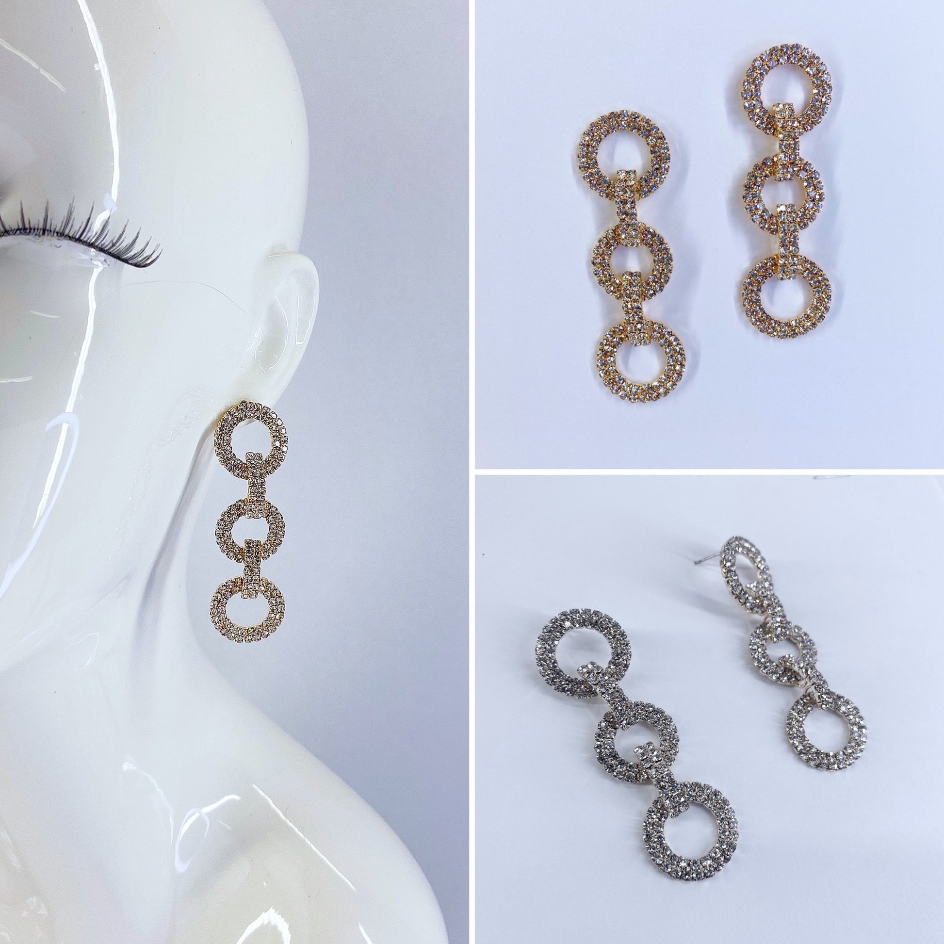 Choose between a Gold or Silver Finish adorned with Clear Rhinestones, and complete your look with our Drop Dangle Post Back Triple Circle Earrings.