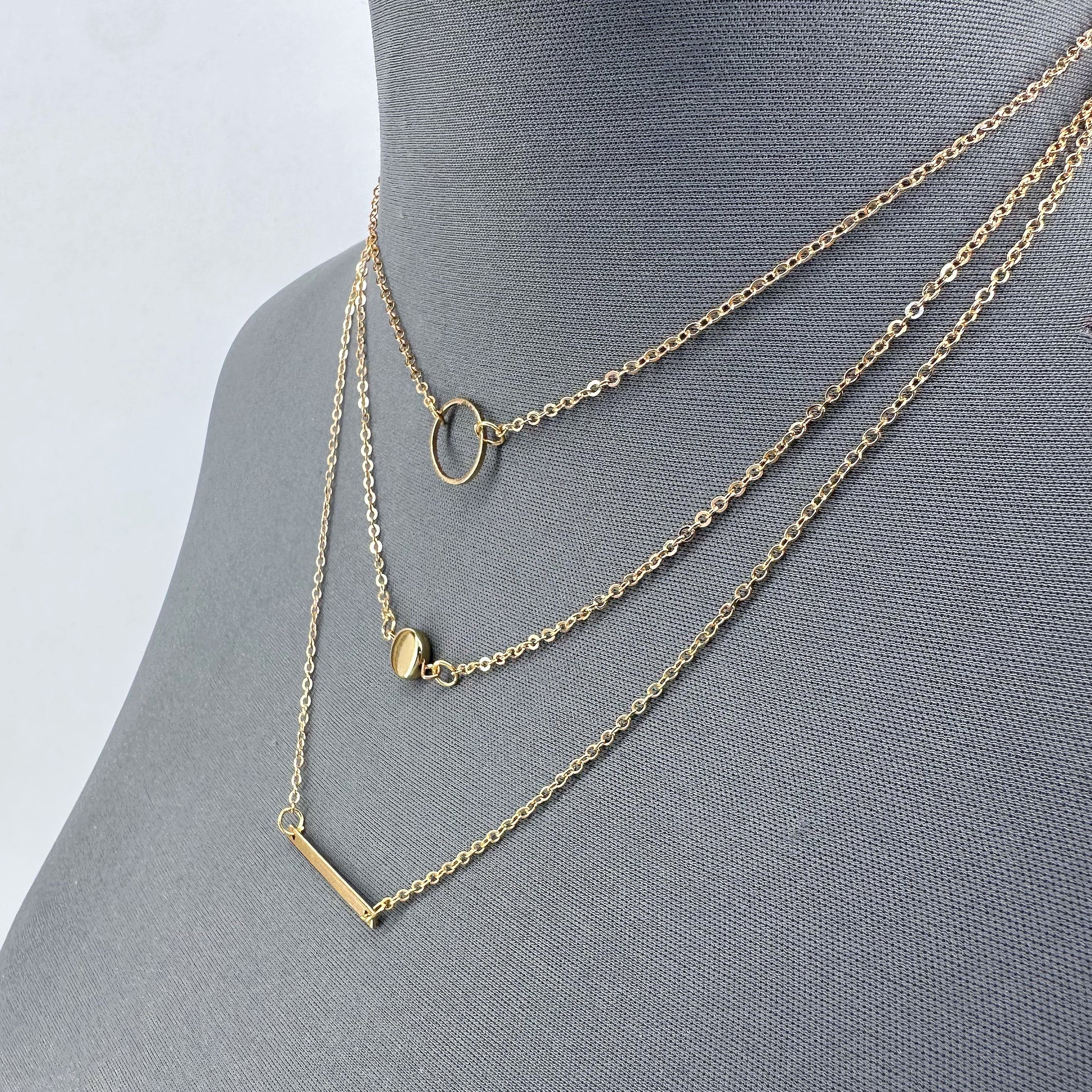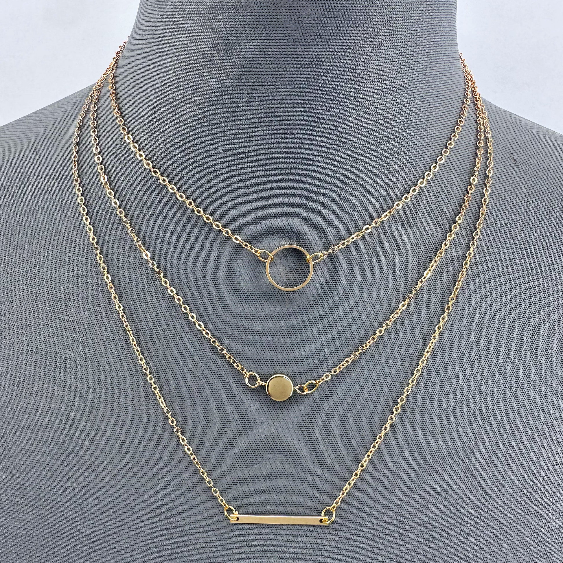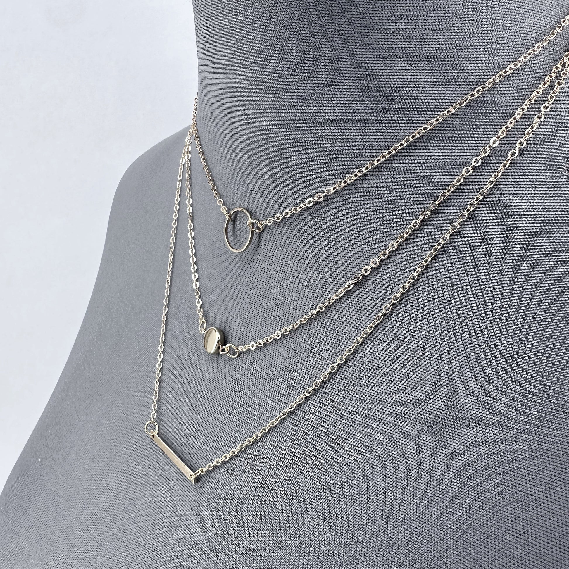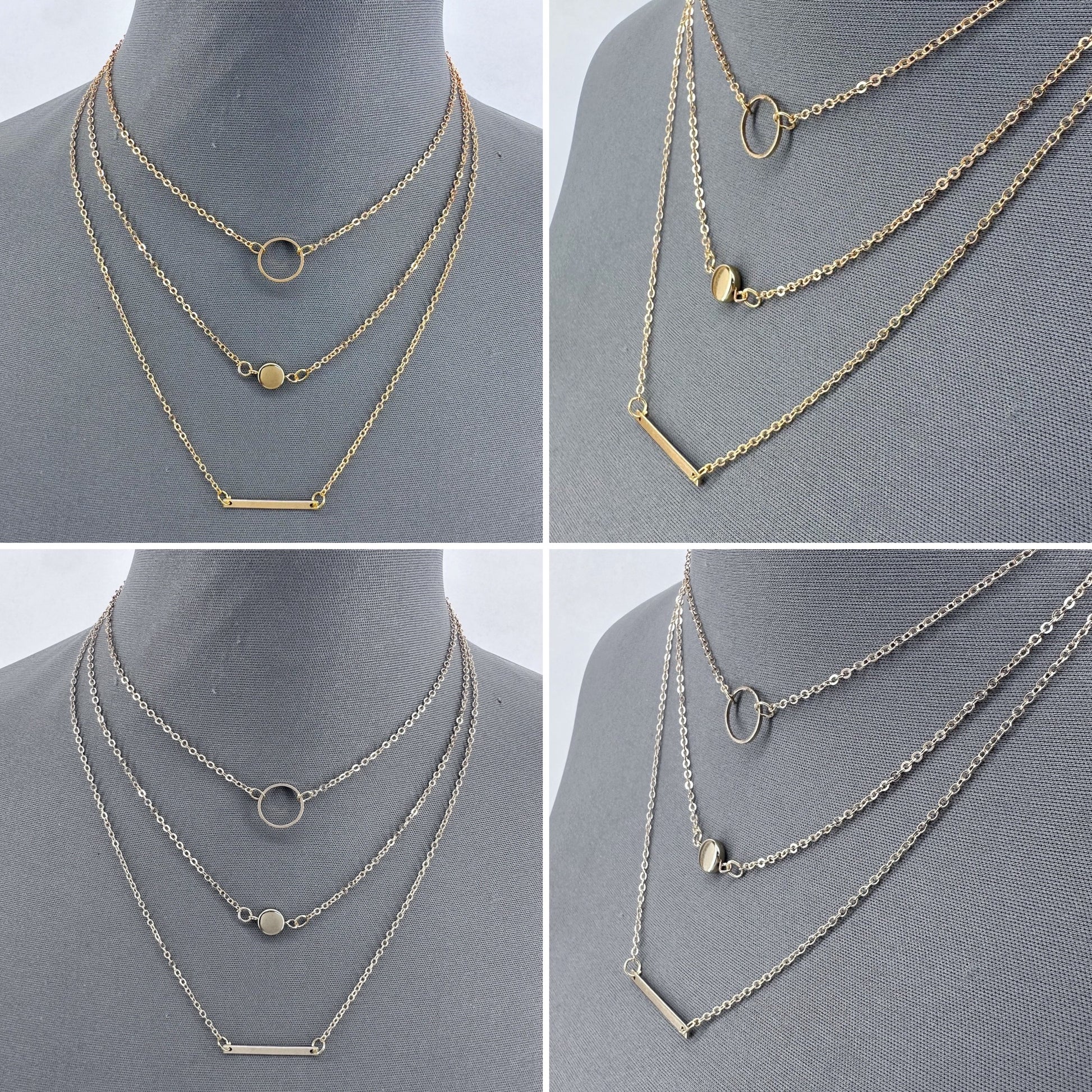 This elegant necklace offers a choice of gold or silver finish and features three layers with varying pendants including a bar, round, and plain coin.