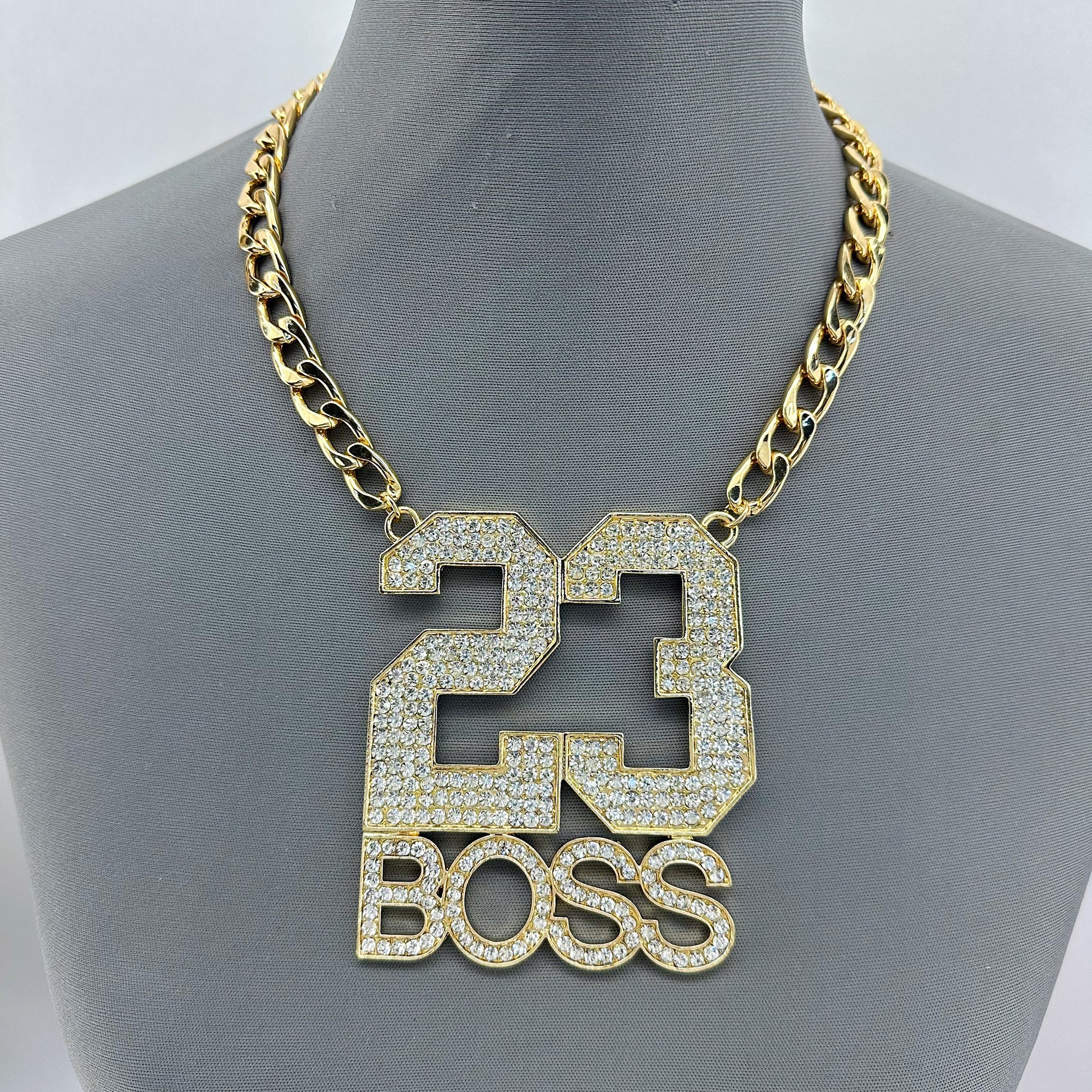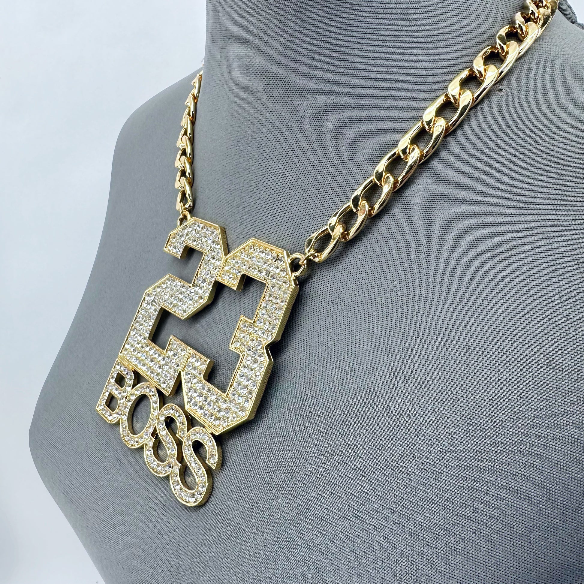 Gold Finish Cuban Link Chain Necklace With 23 And Boss Rhinestone Pendant