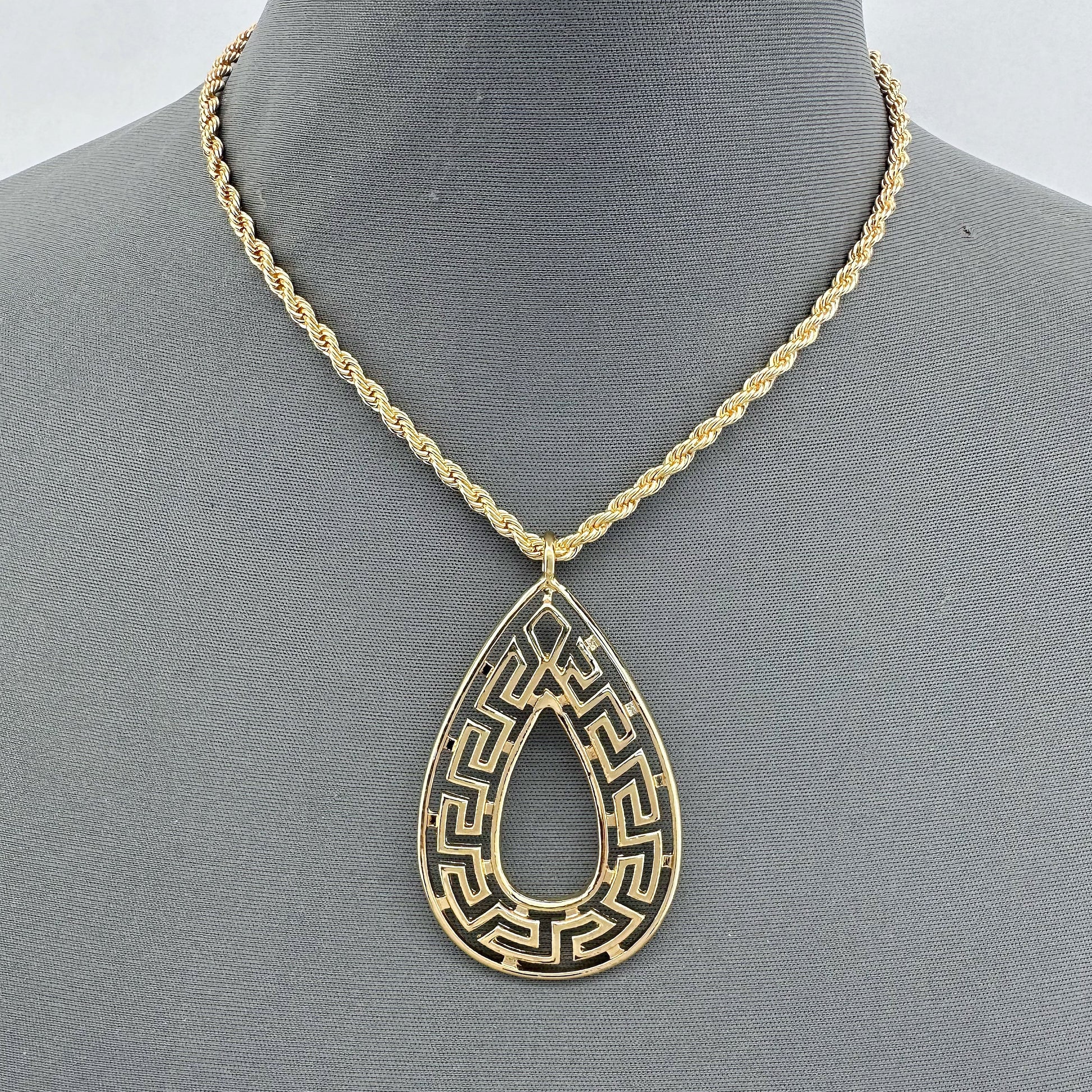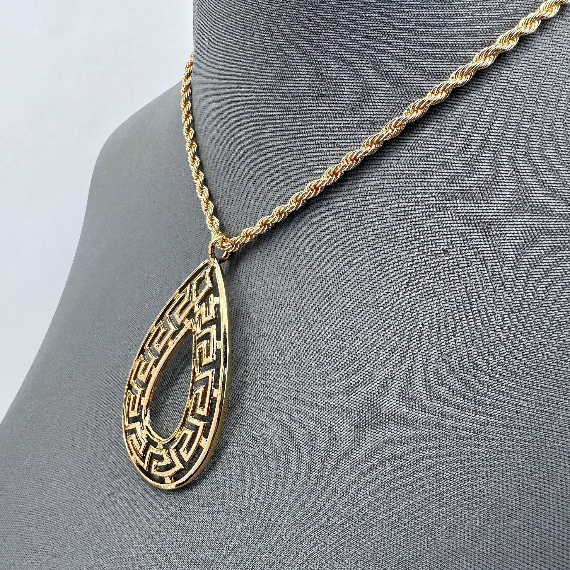 Gold Finish Rope Chain Necklace With Teardrop Greek Symbol Pendant
