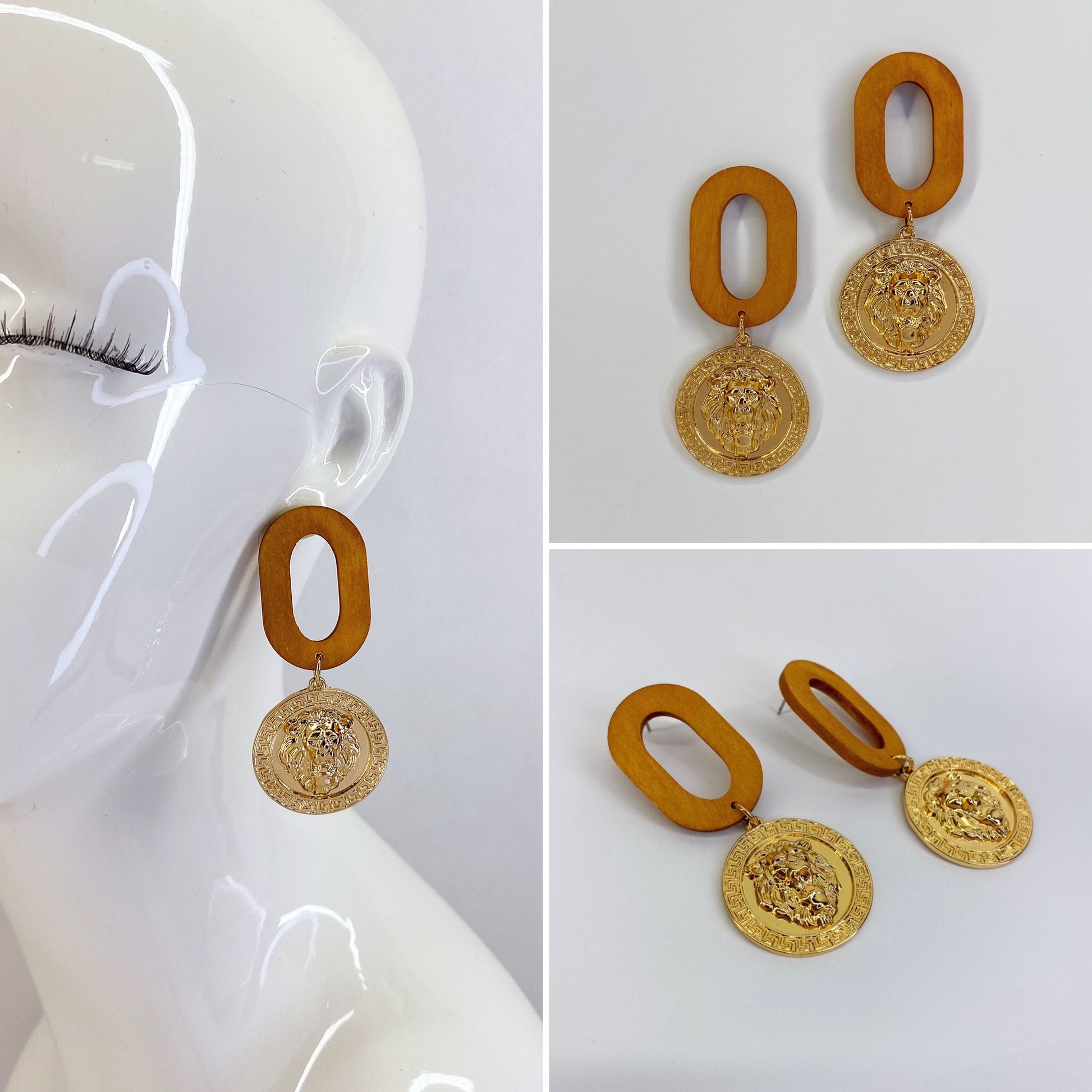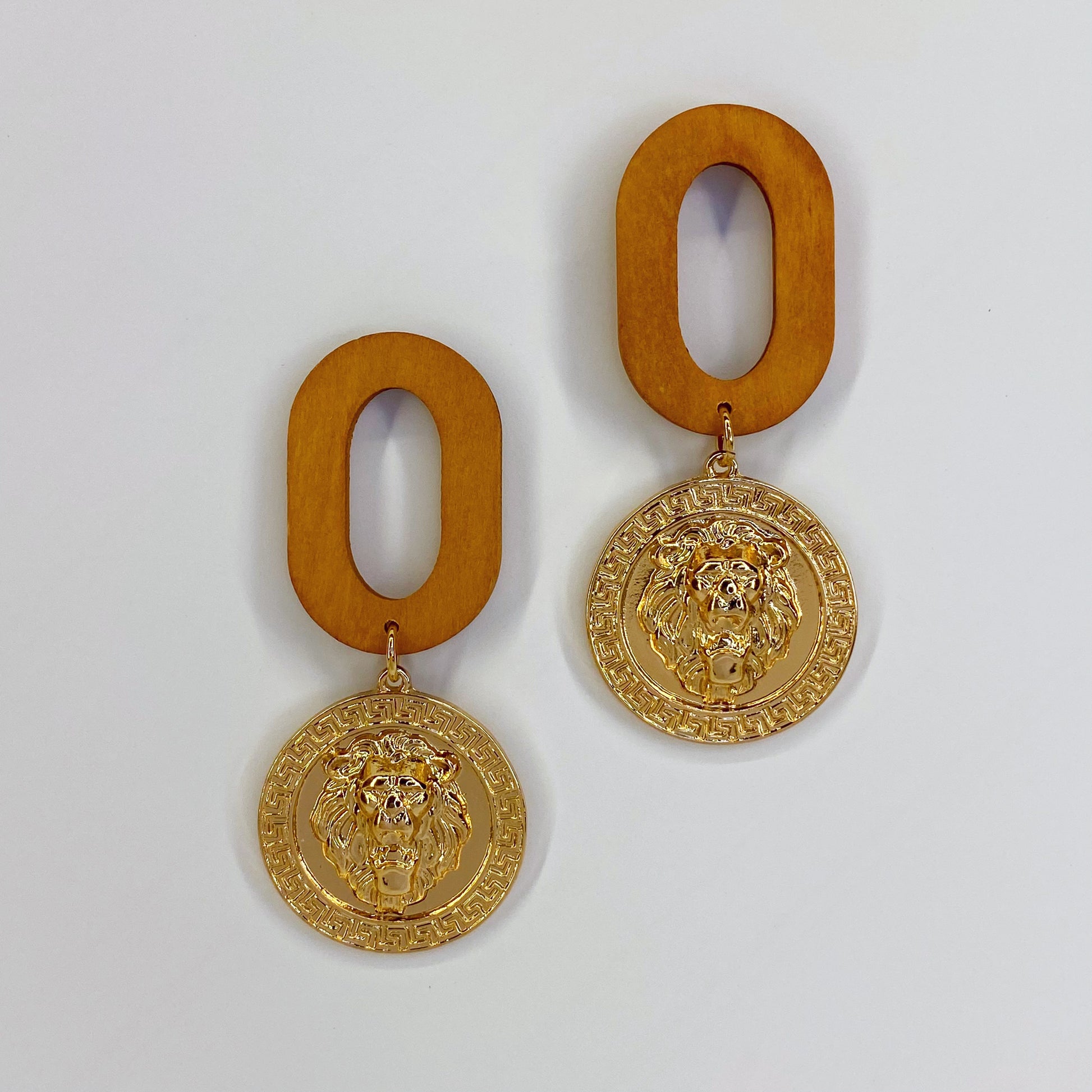 Oval Wood Post Earring With Gold Finish Round Lion Head