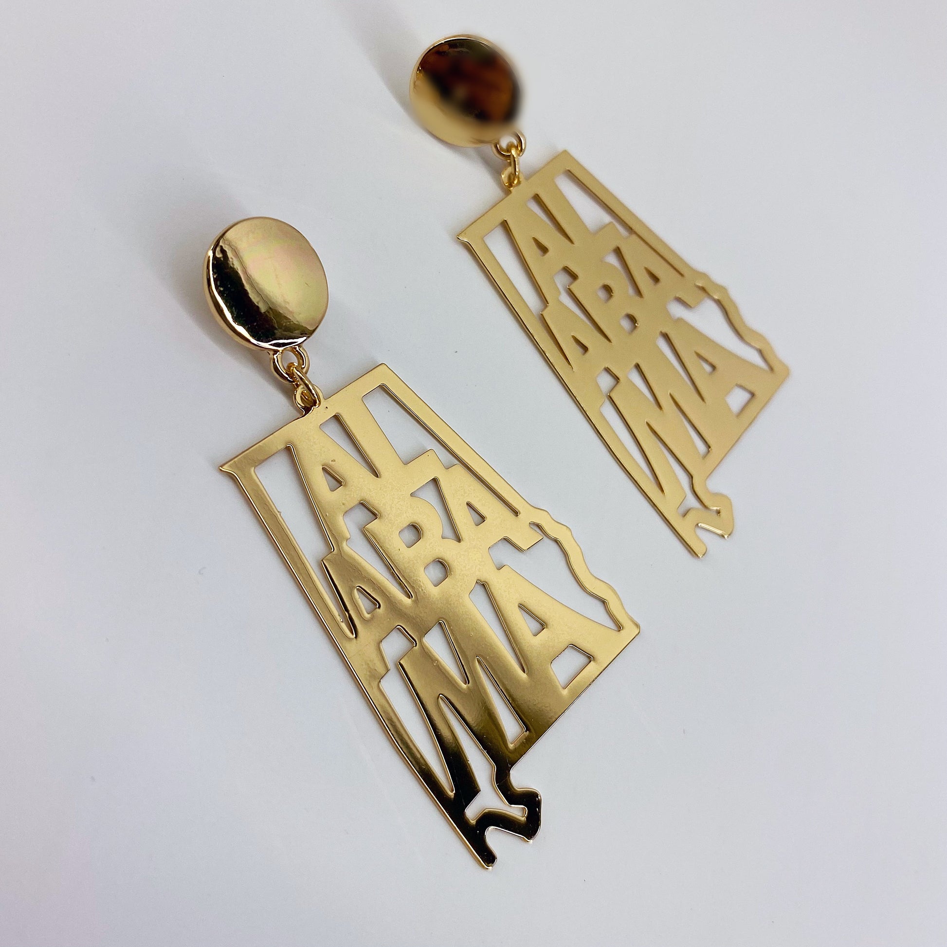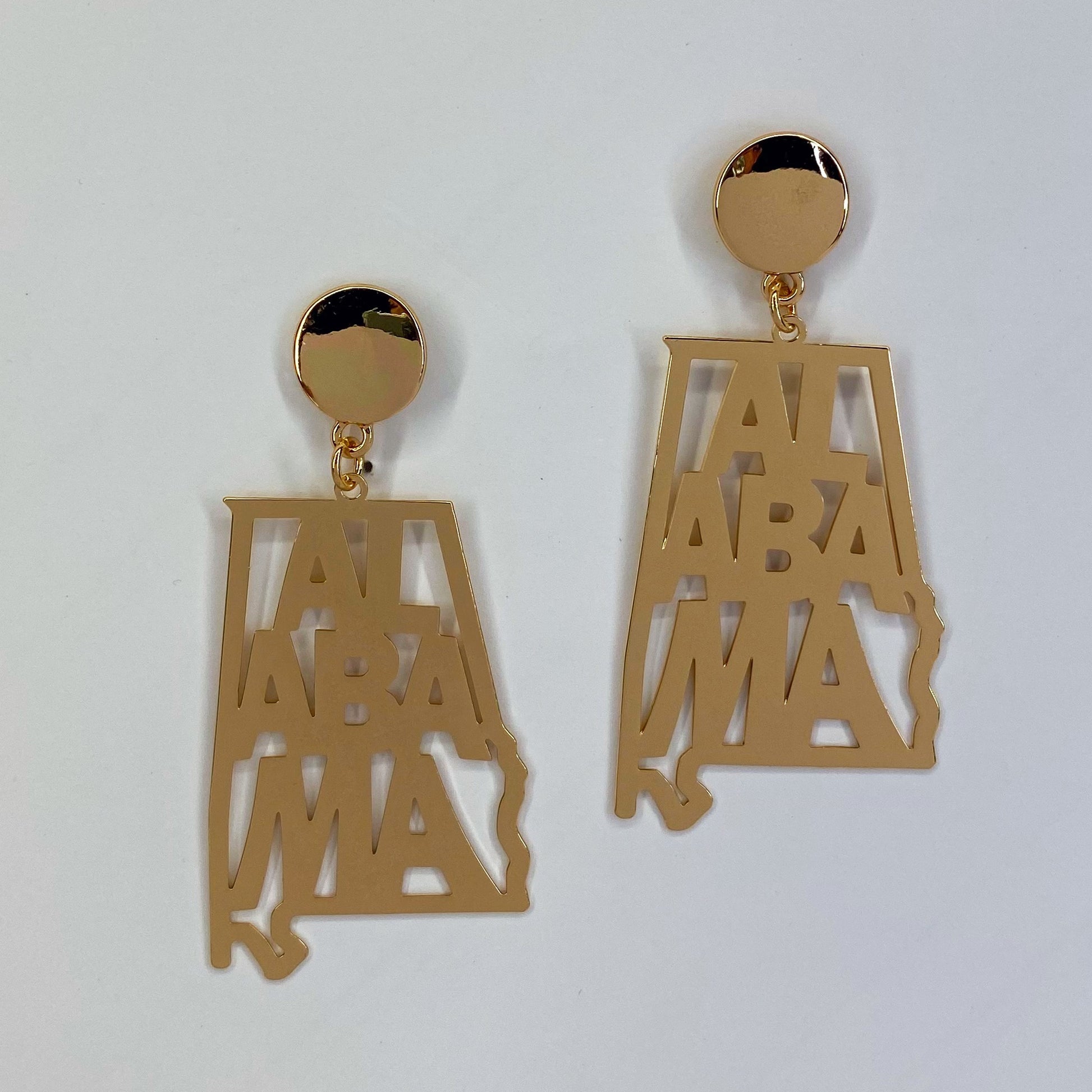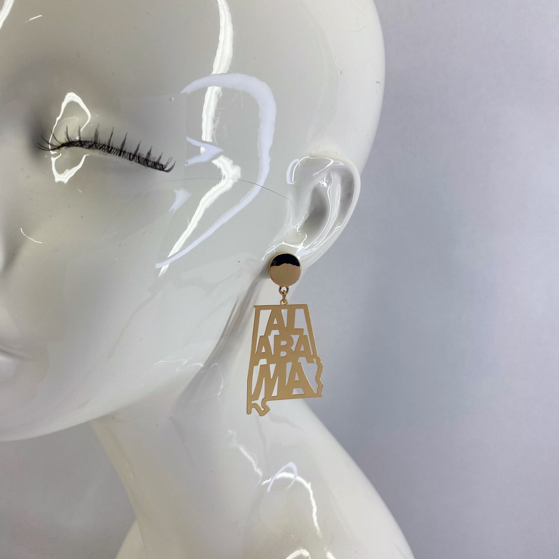 Gold Finish Post Back Earring With Alabama State Outline Dangle