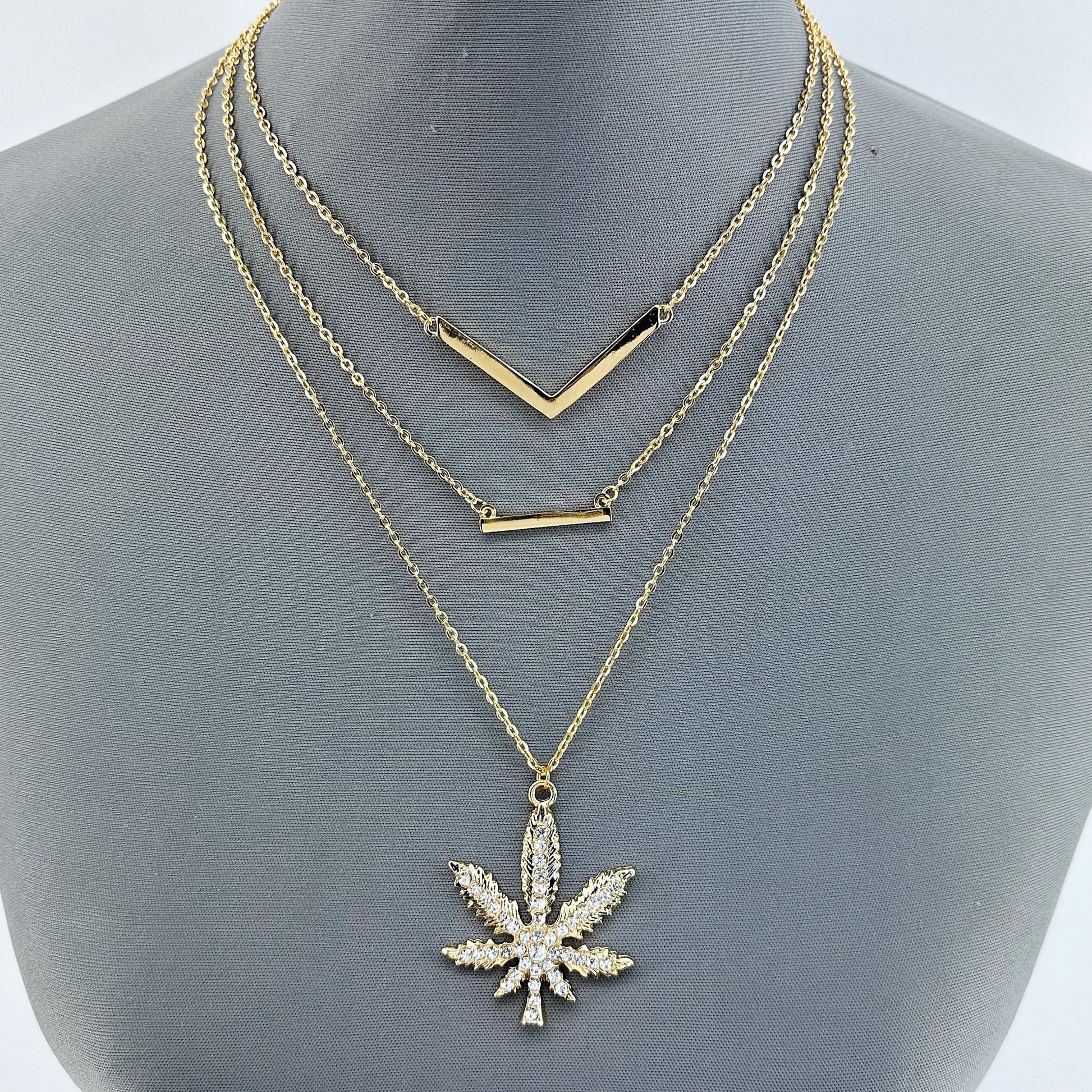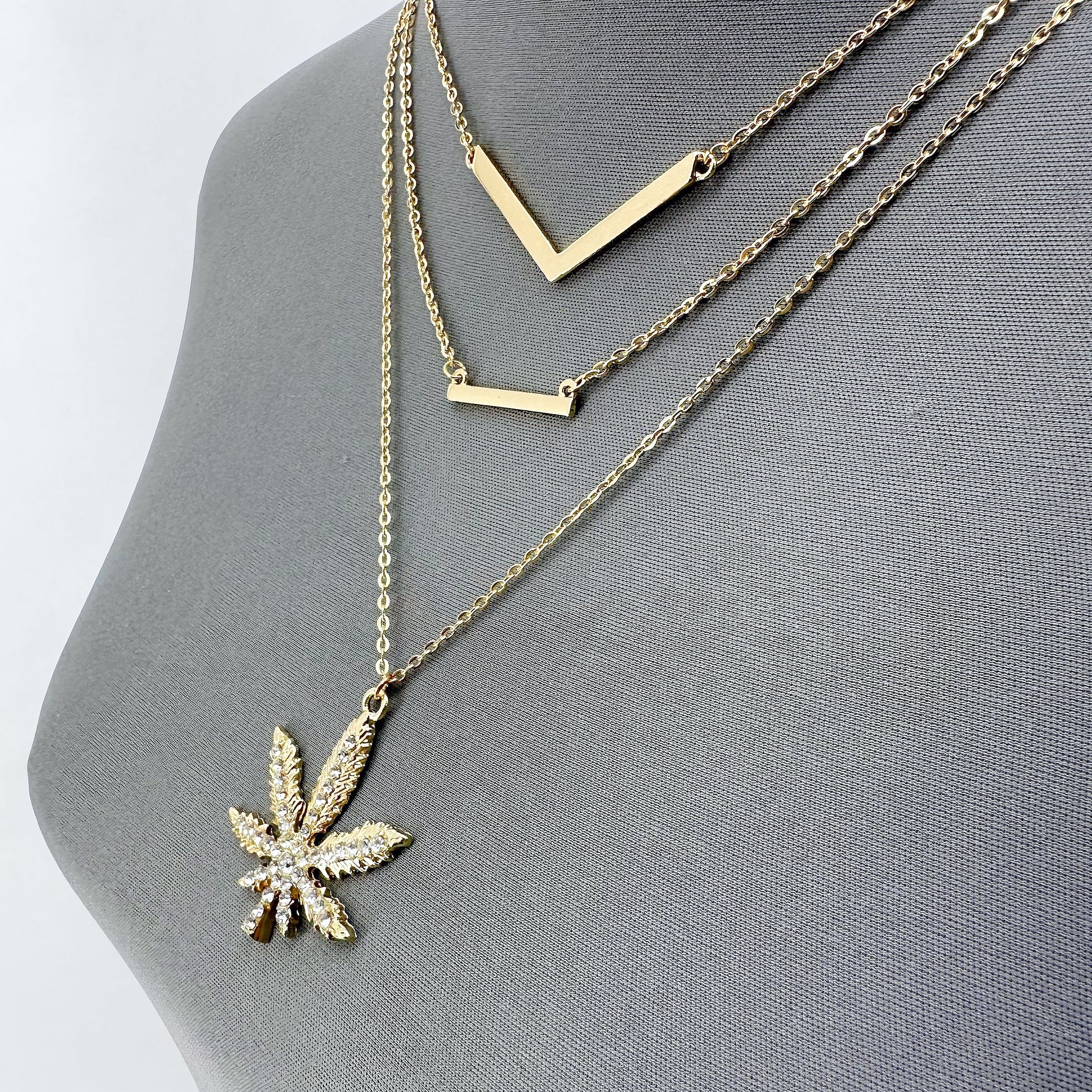 Gold Finish Multi Layered Link Chain Necklace With Rhinestone Leaf Pendant
