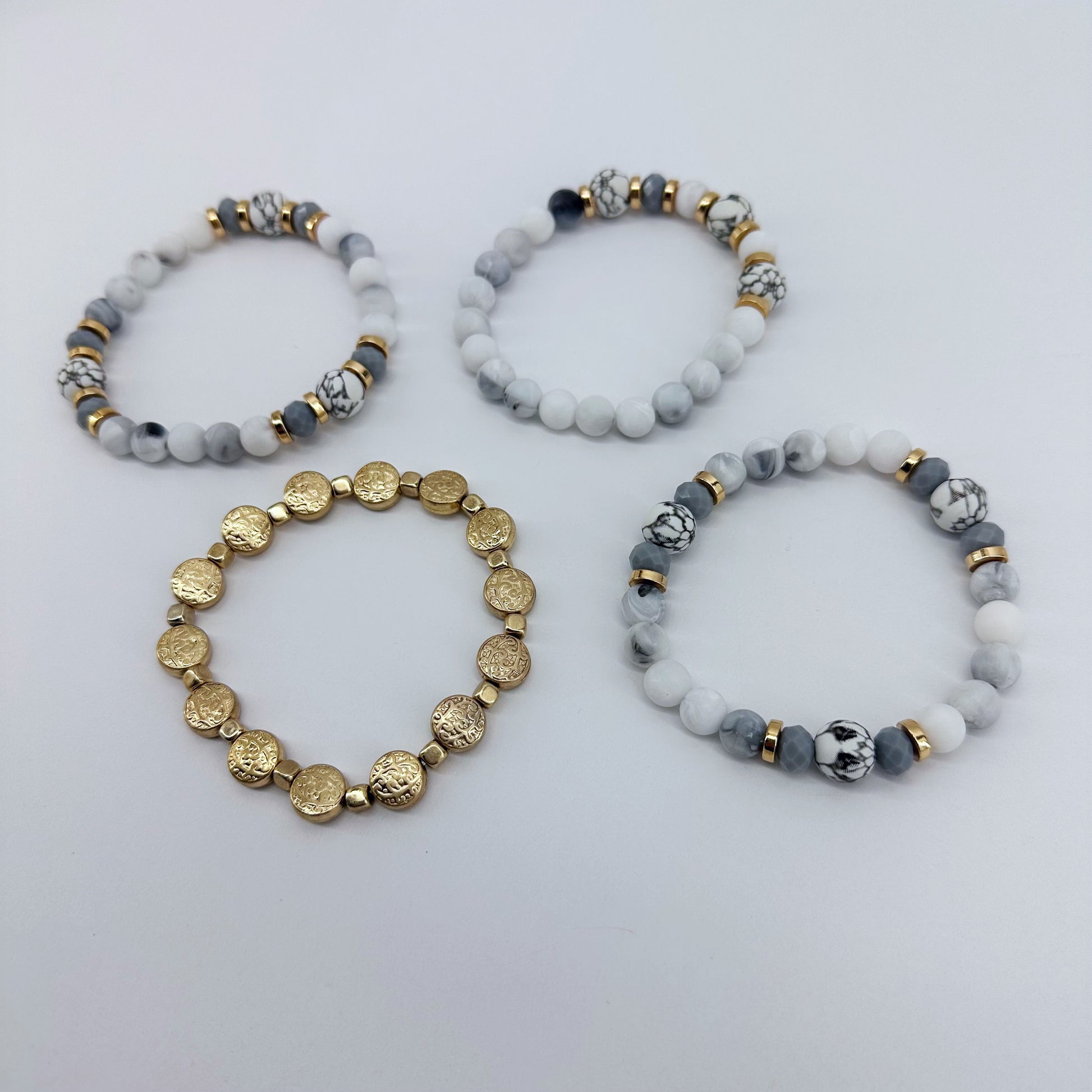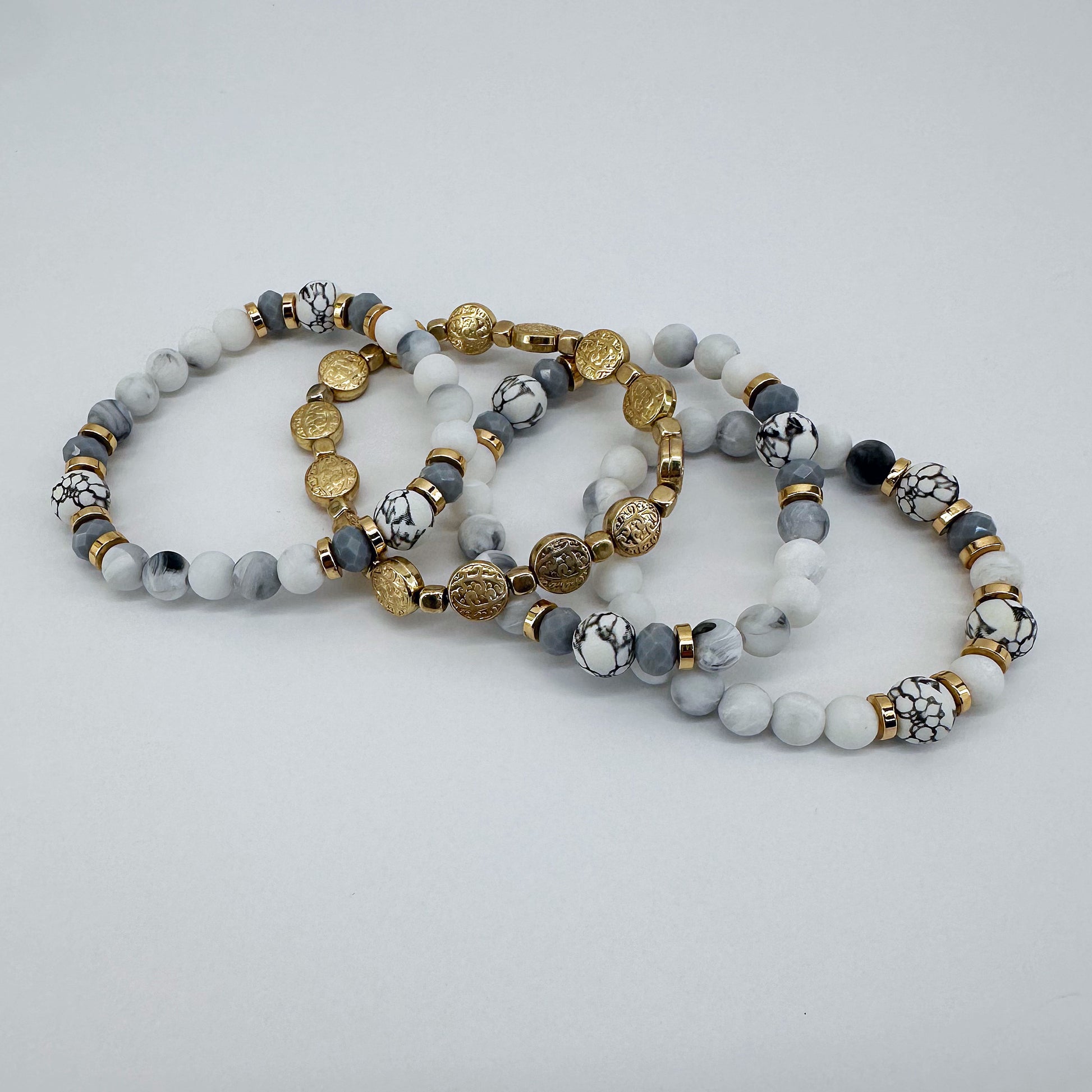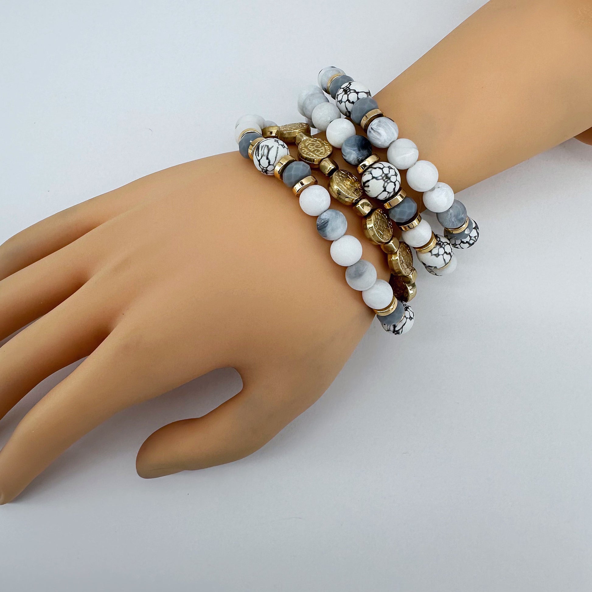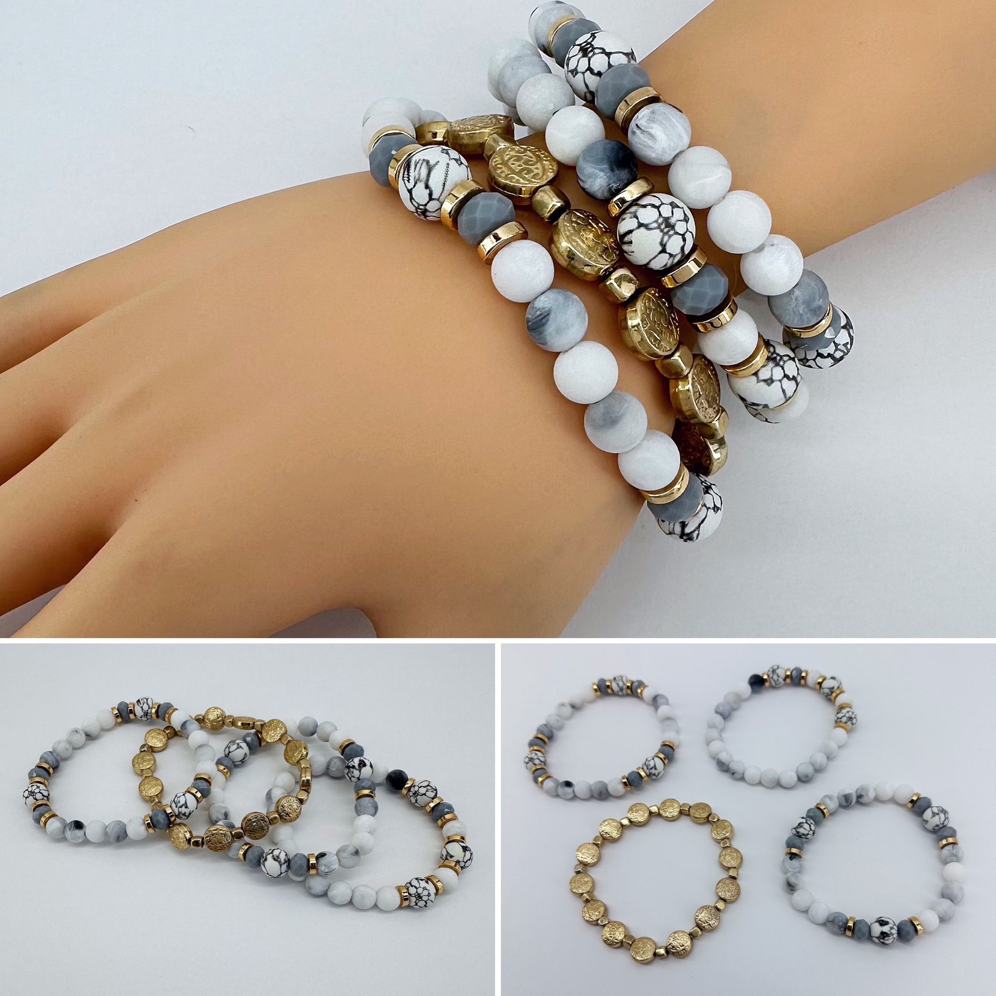Stackable Bracelets Gold Finish With White And Gray Bead