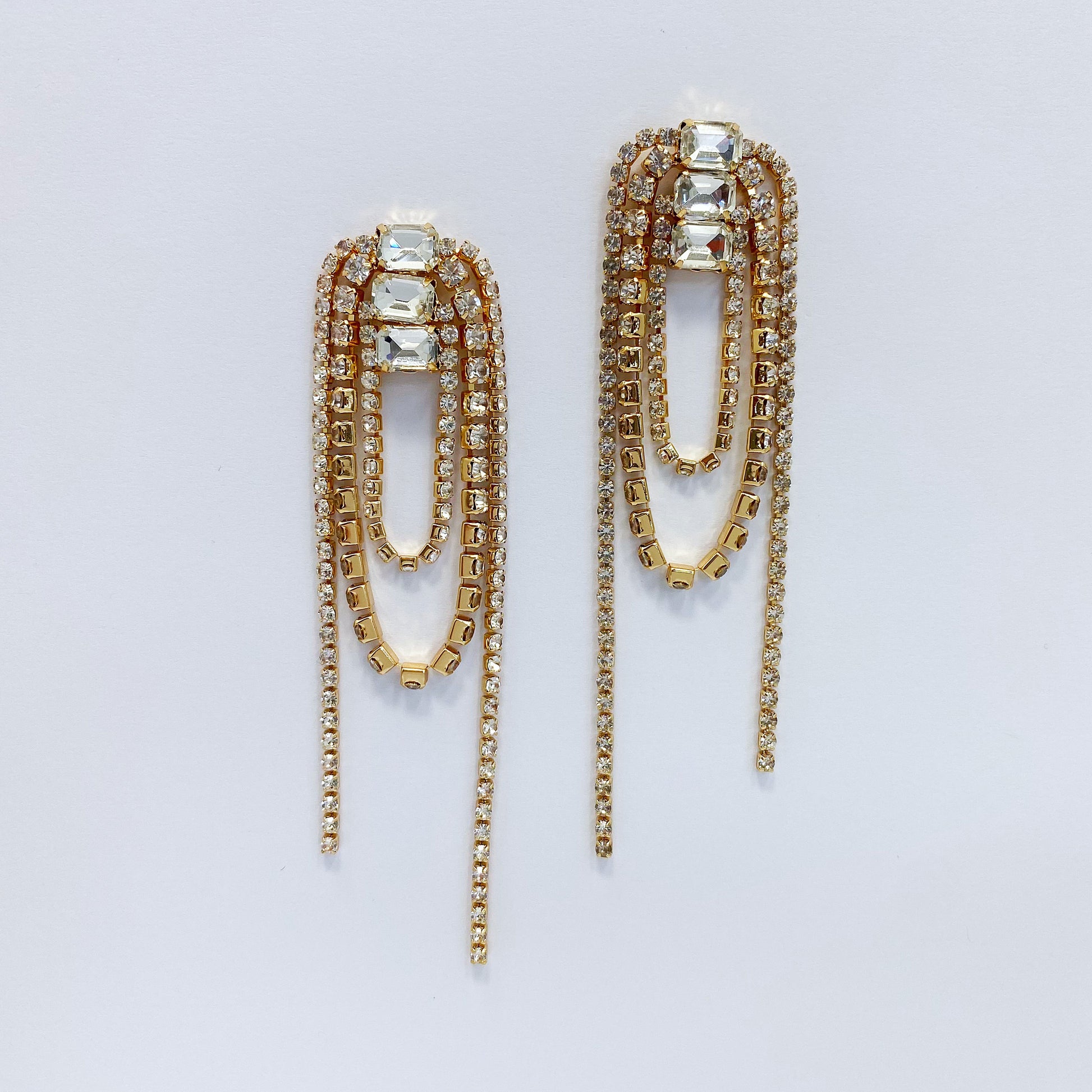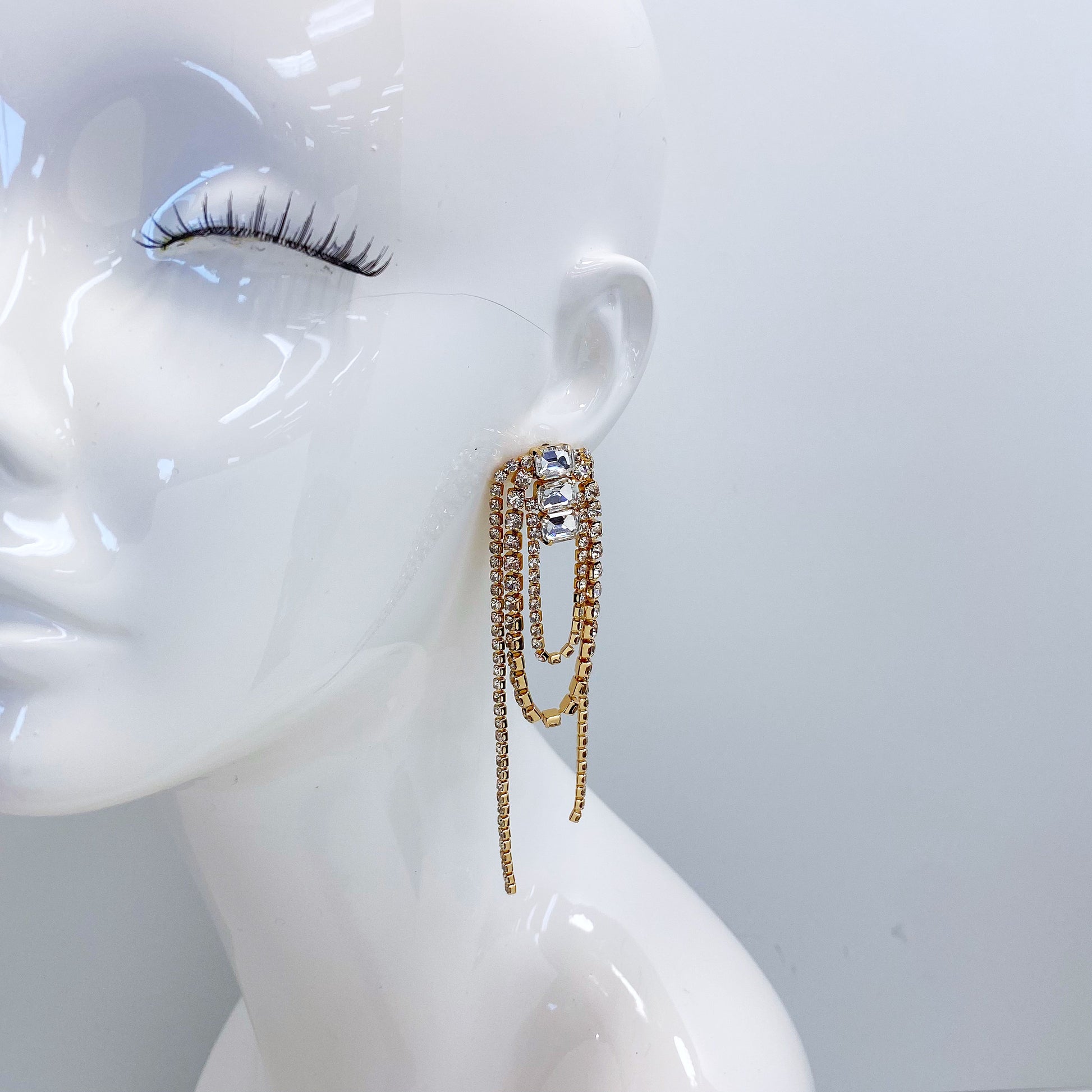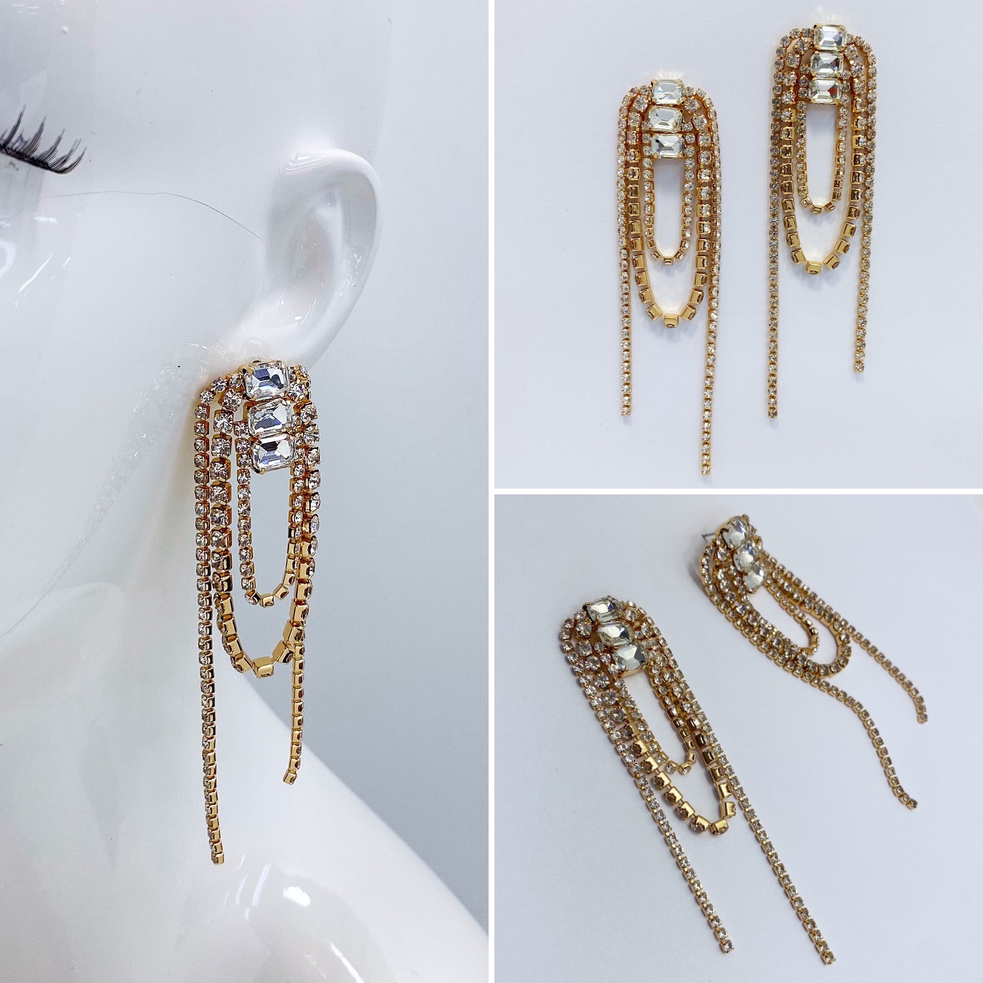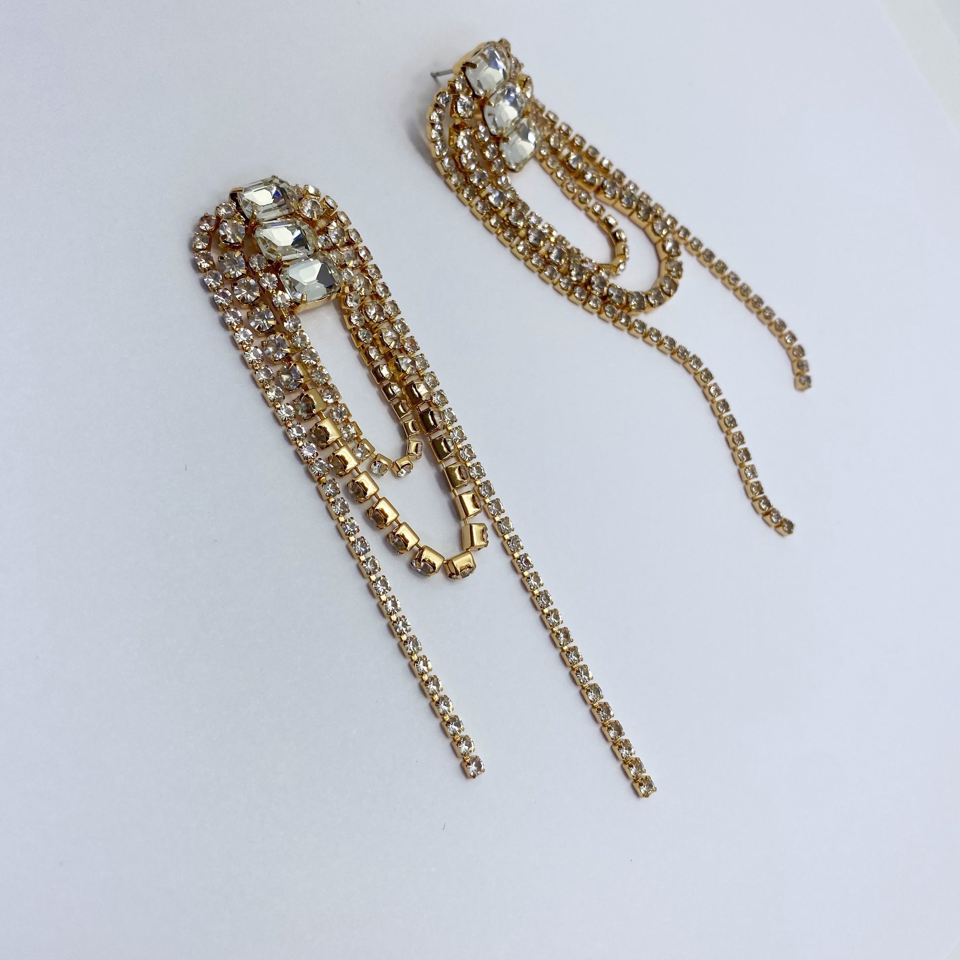 Post Back Gold Finish Rhinestone Earrings With Rhinestone Link Chain Tassels