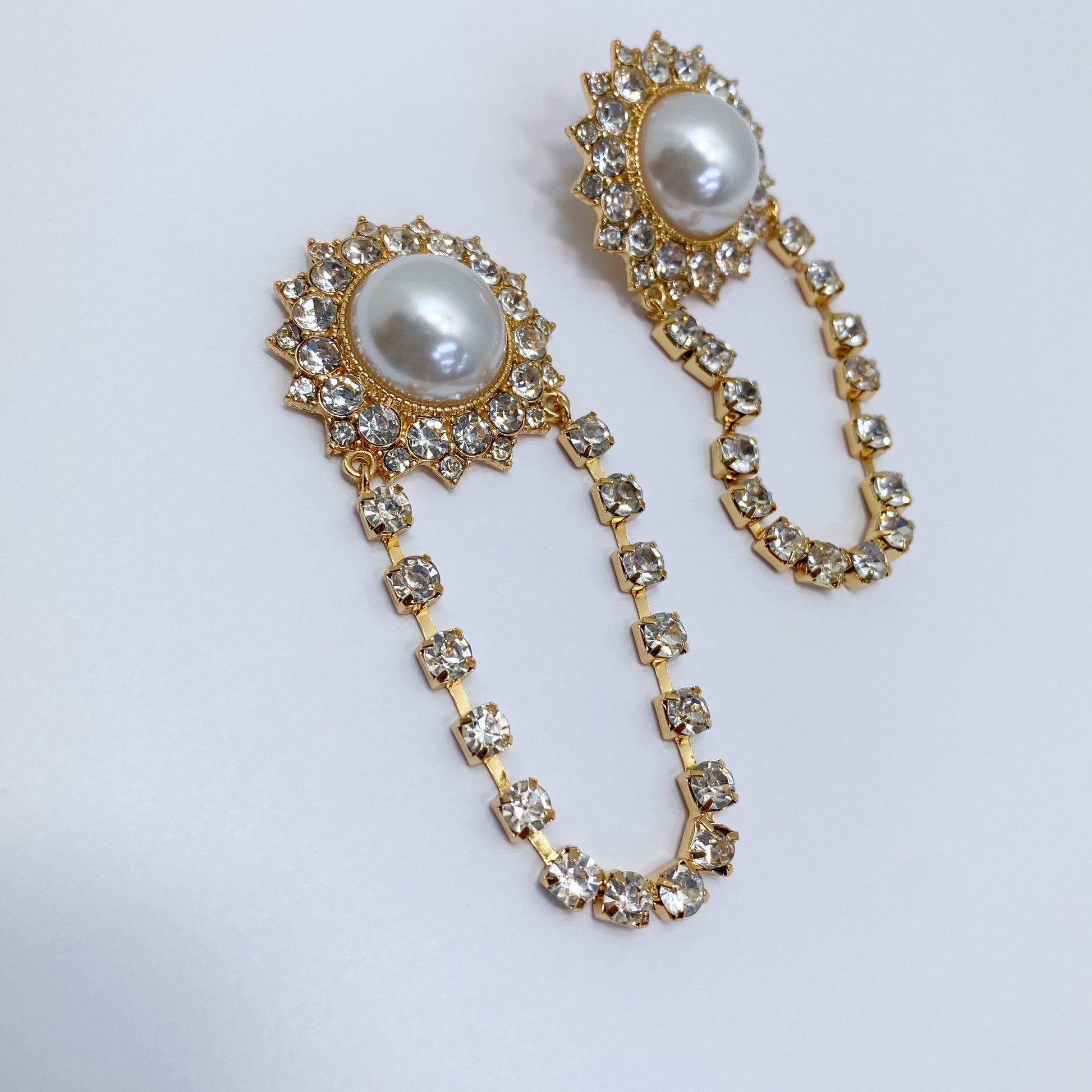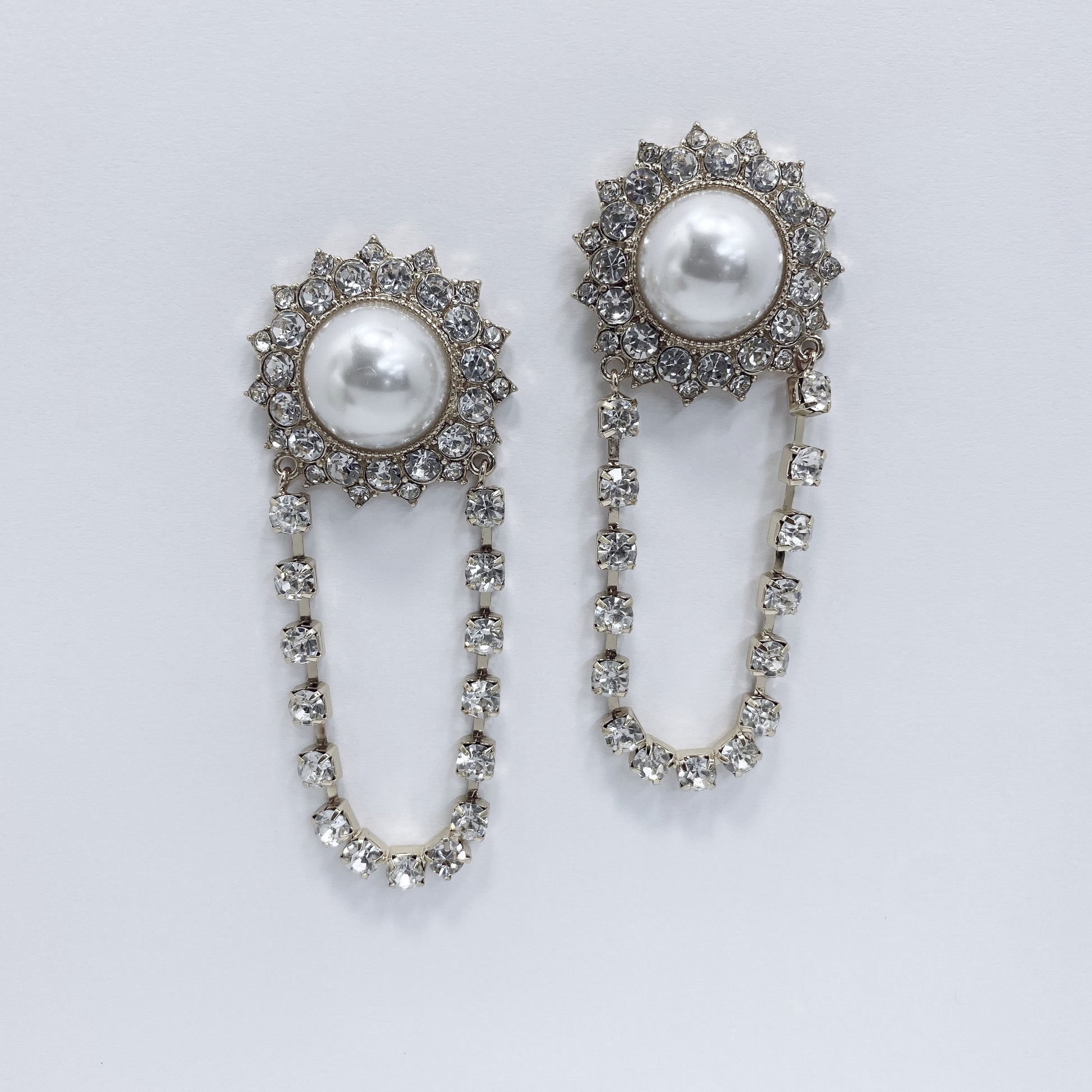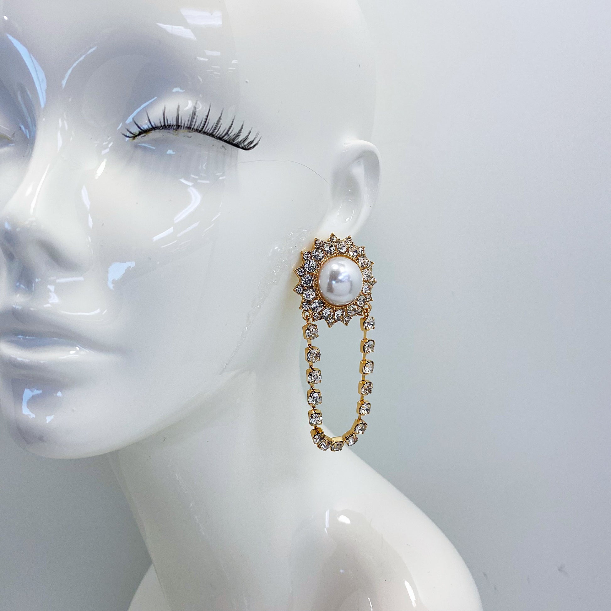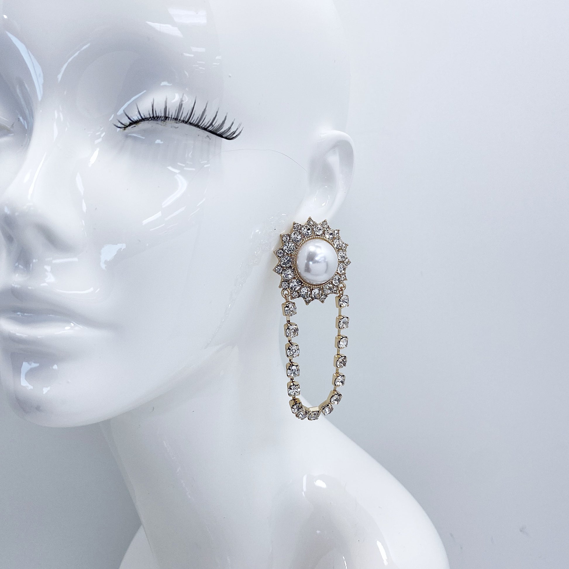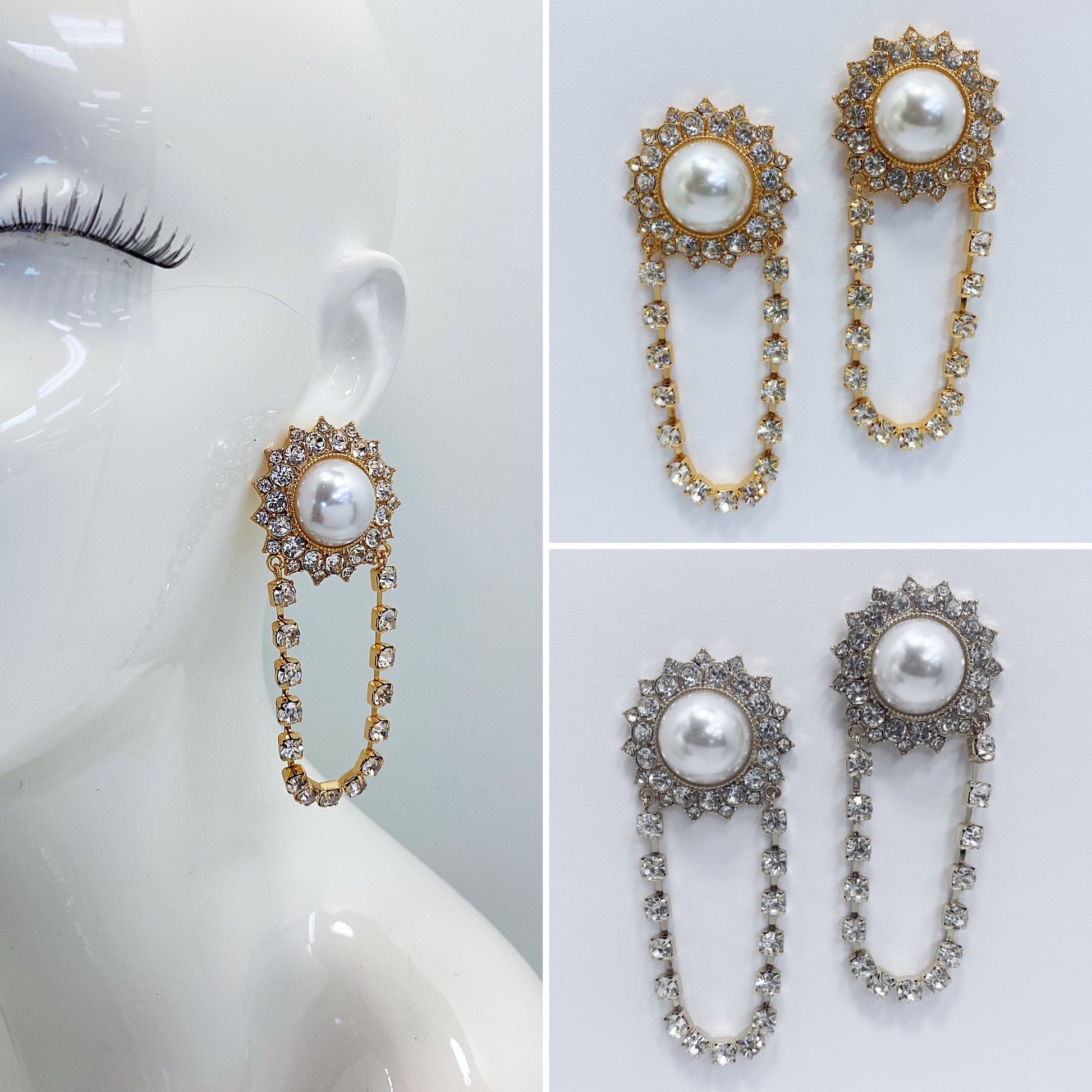 Post Back Pearl And Rhinestone Earrings With Rhinestone Link Chain Dangle