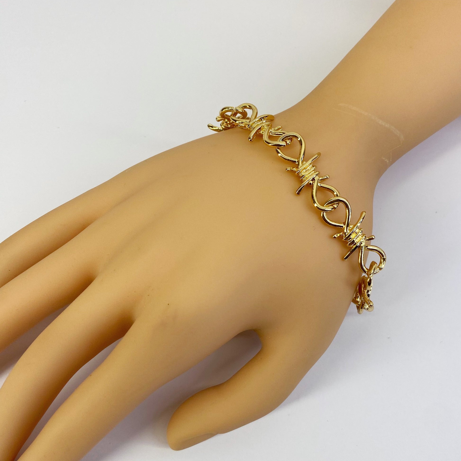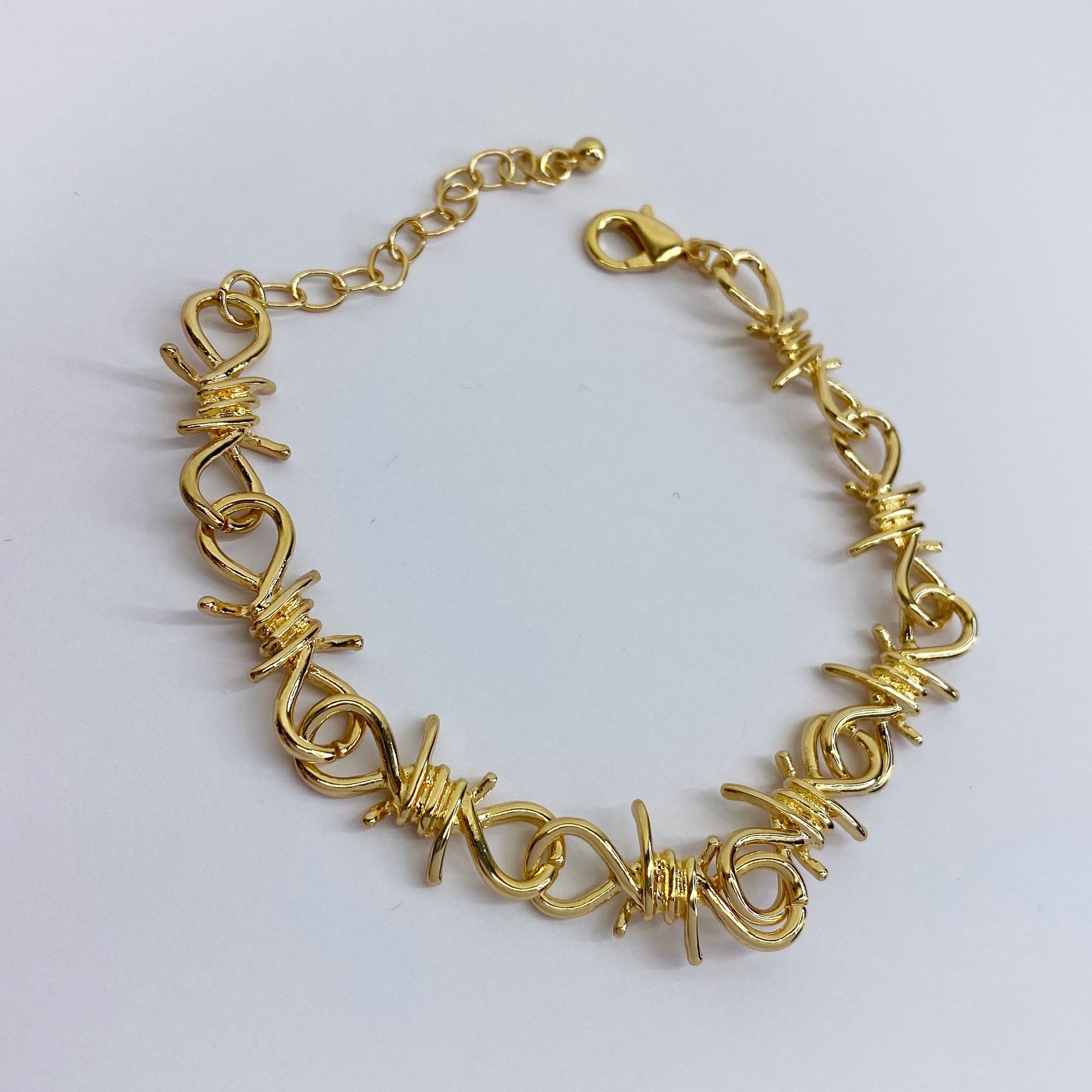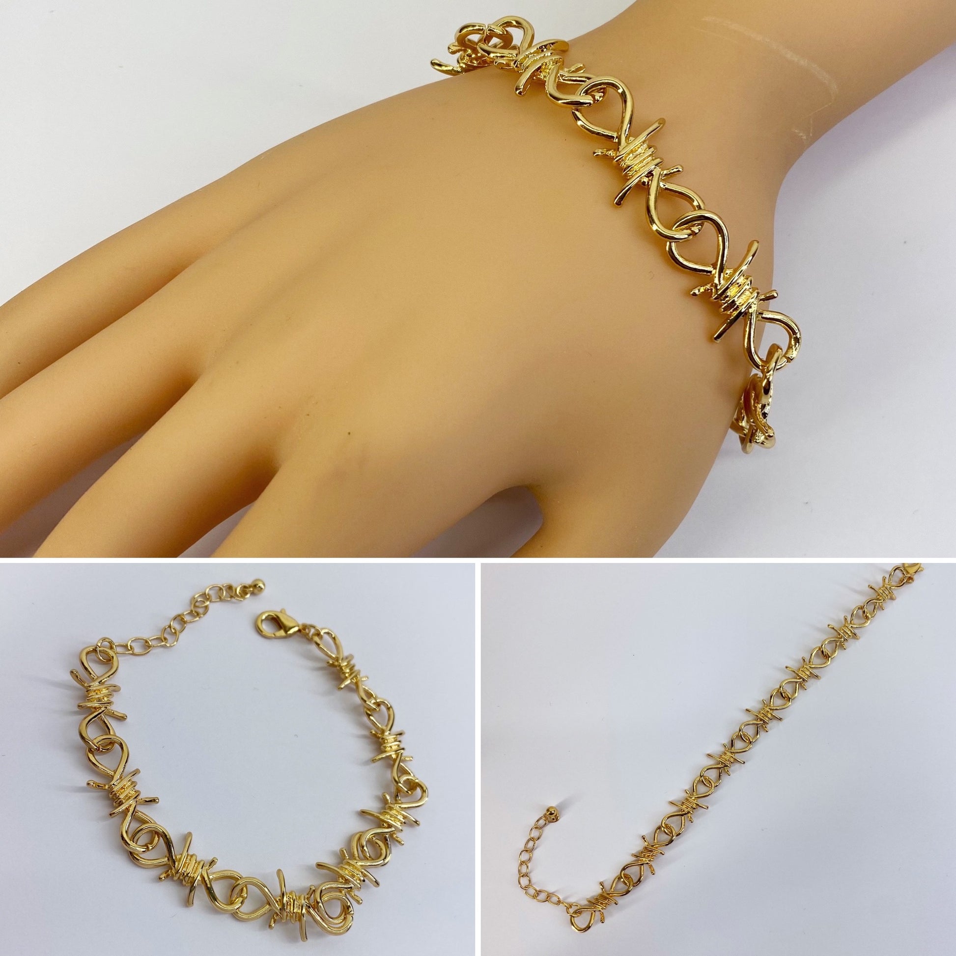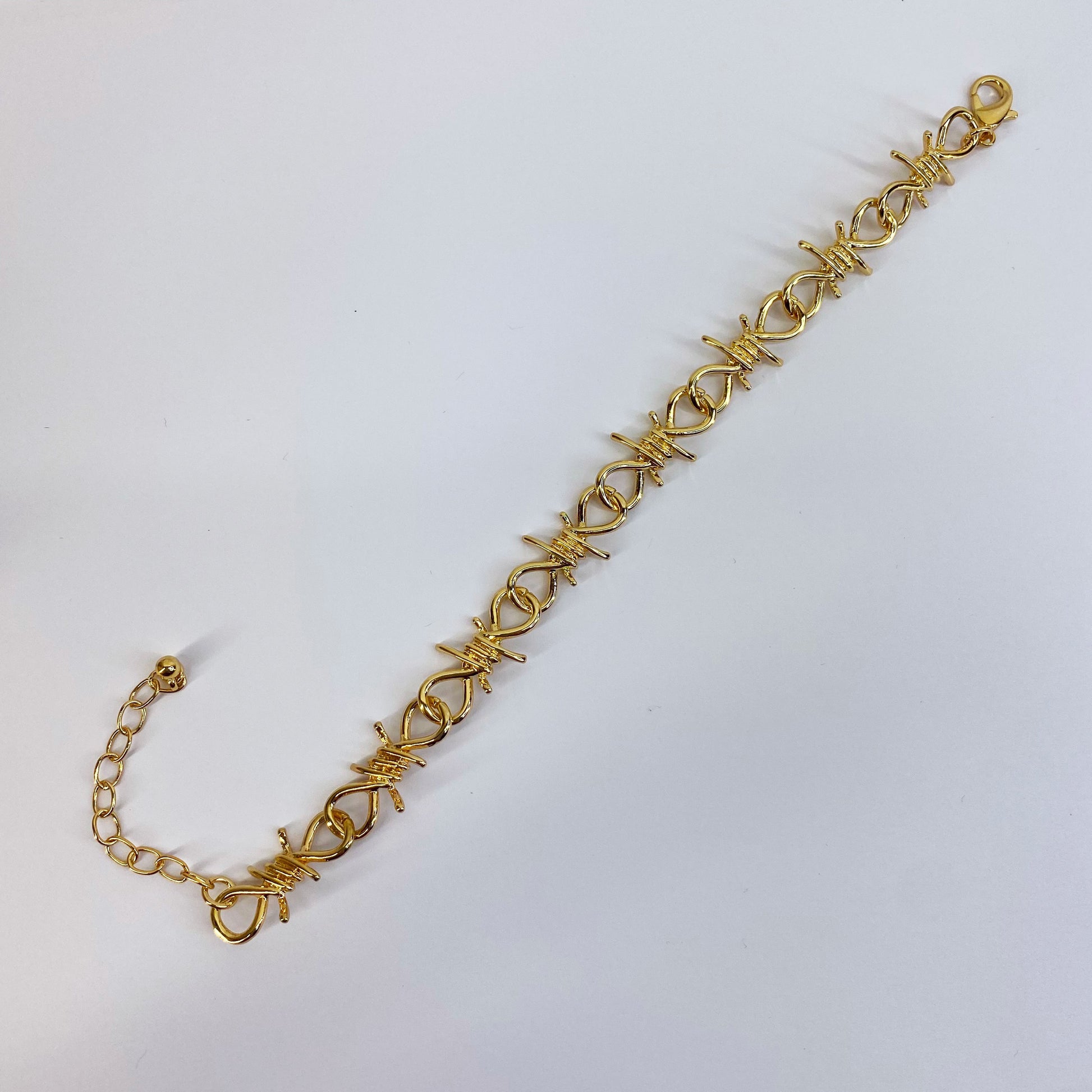 This bracelet features a gold finish and is designed with a bard wire chain and an extender for added versatility.