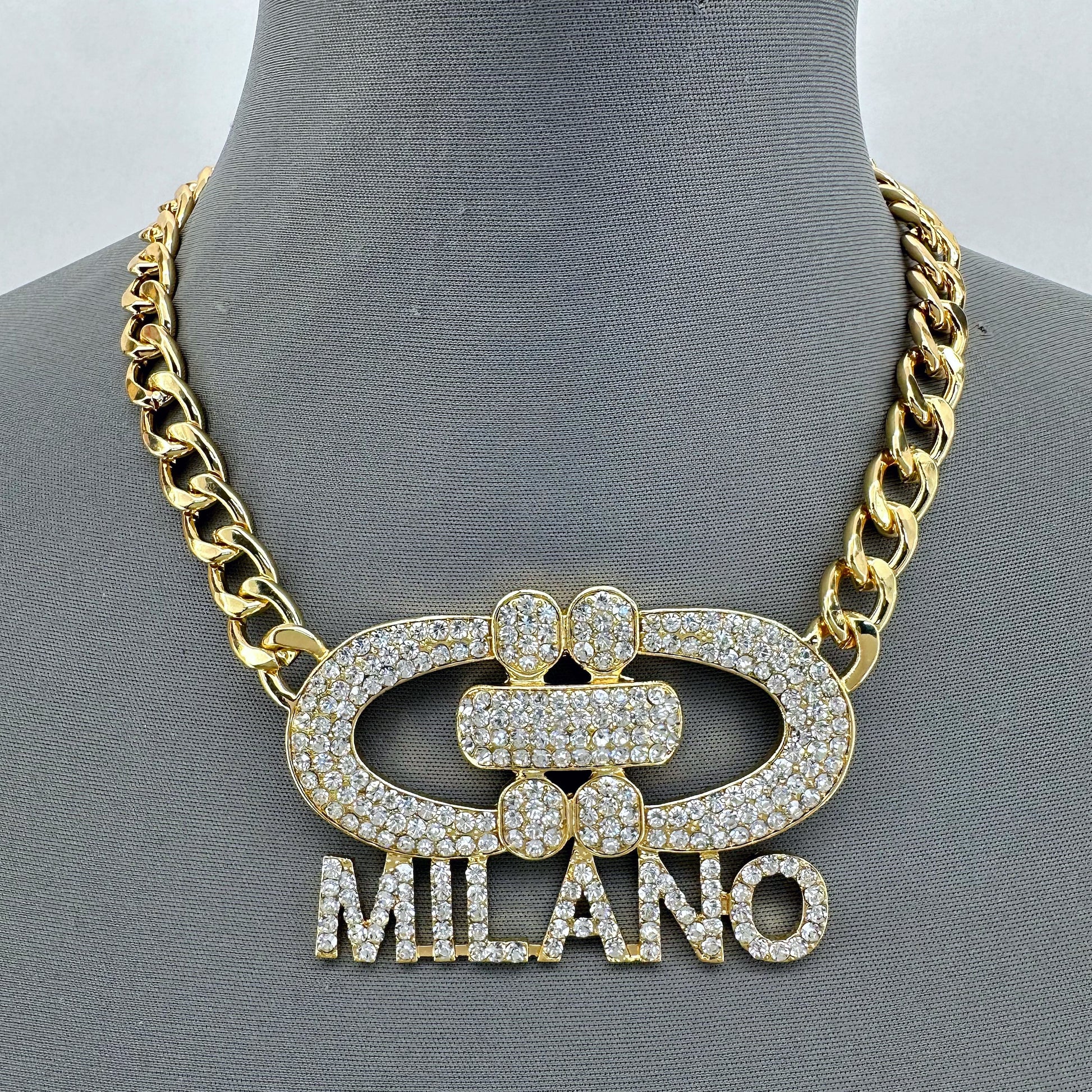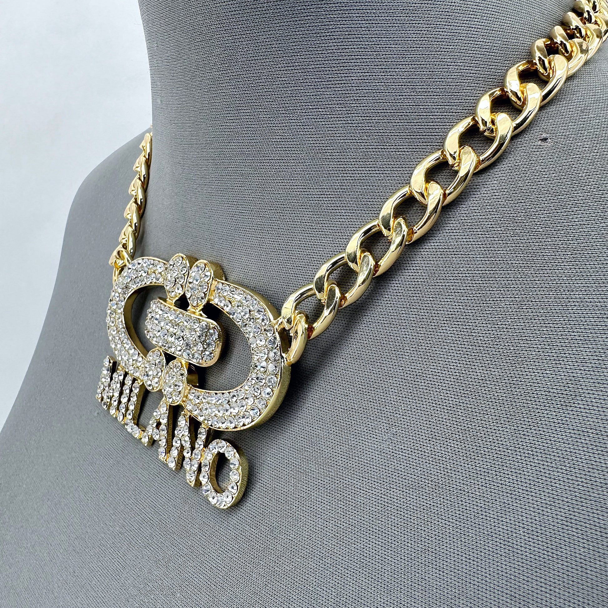 Gold Finish Cuban Link Chain Necklace With Designer Inspired Rhinestone Pendant