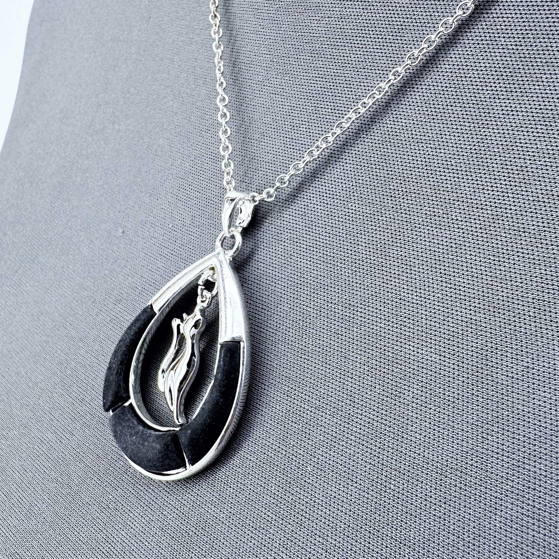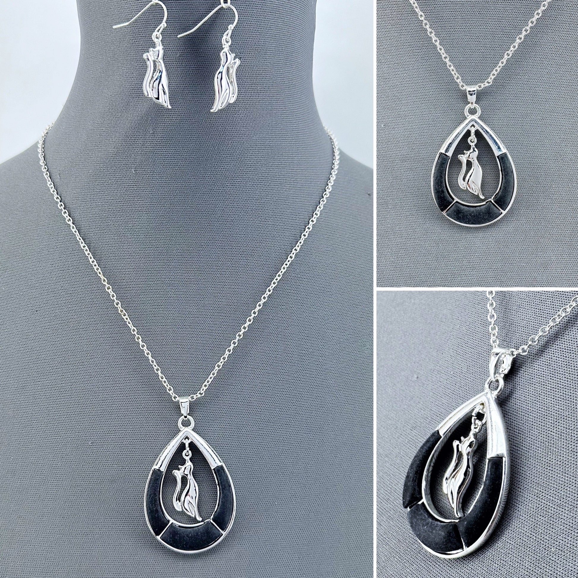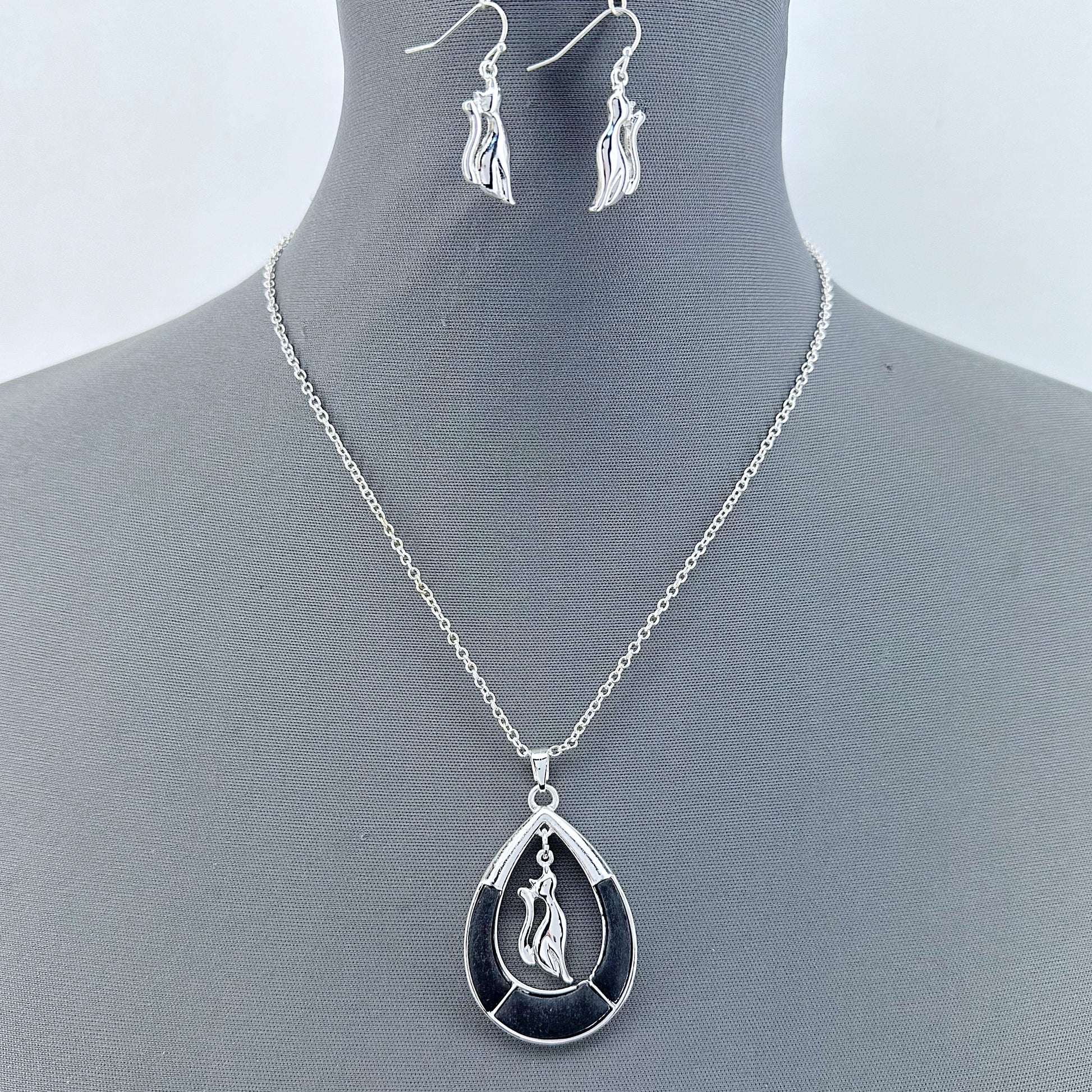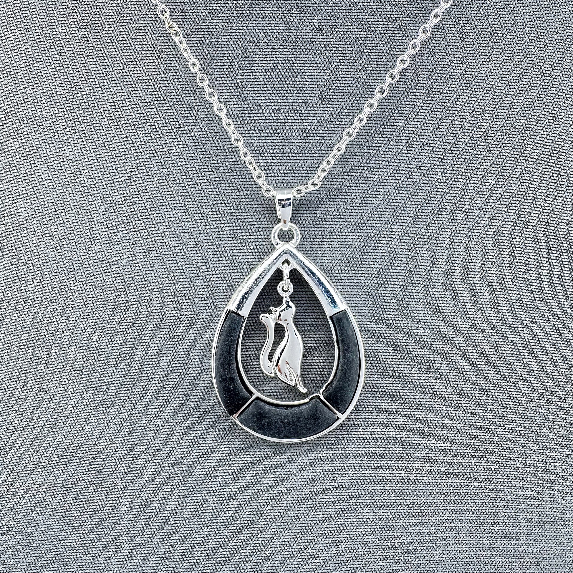 Silver Link Chain Necklace With Cat Teardrop Tailored Look Pendant And Fish Hook Cat Dangle