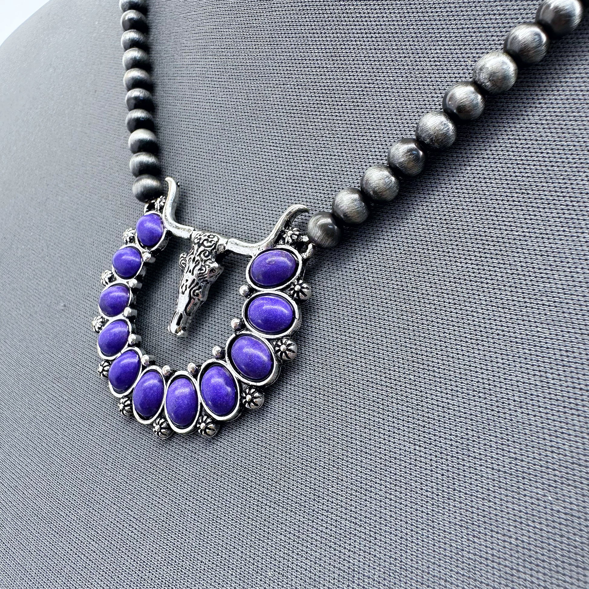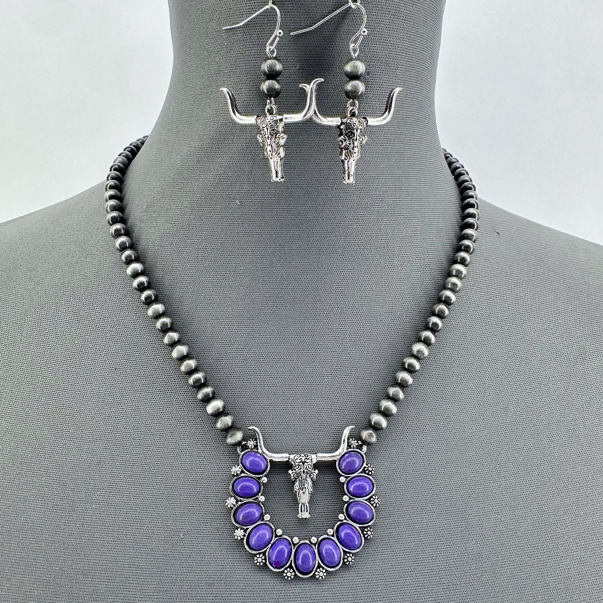Silver Longhorn Necklace Set With Gray Bead And Purple Squash