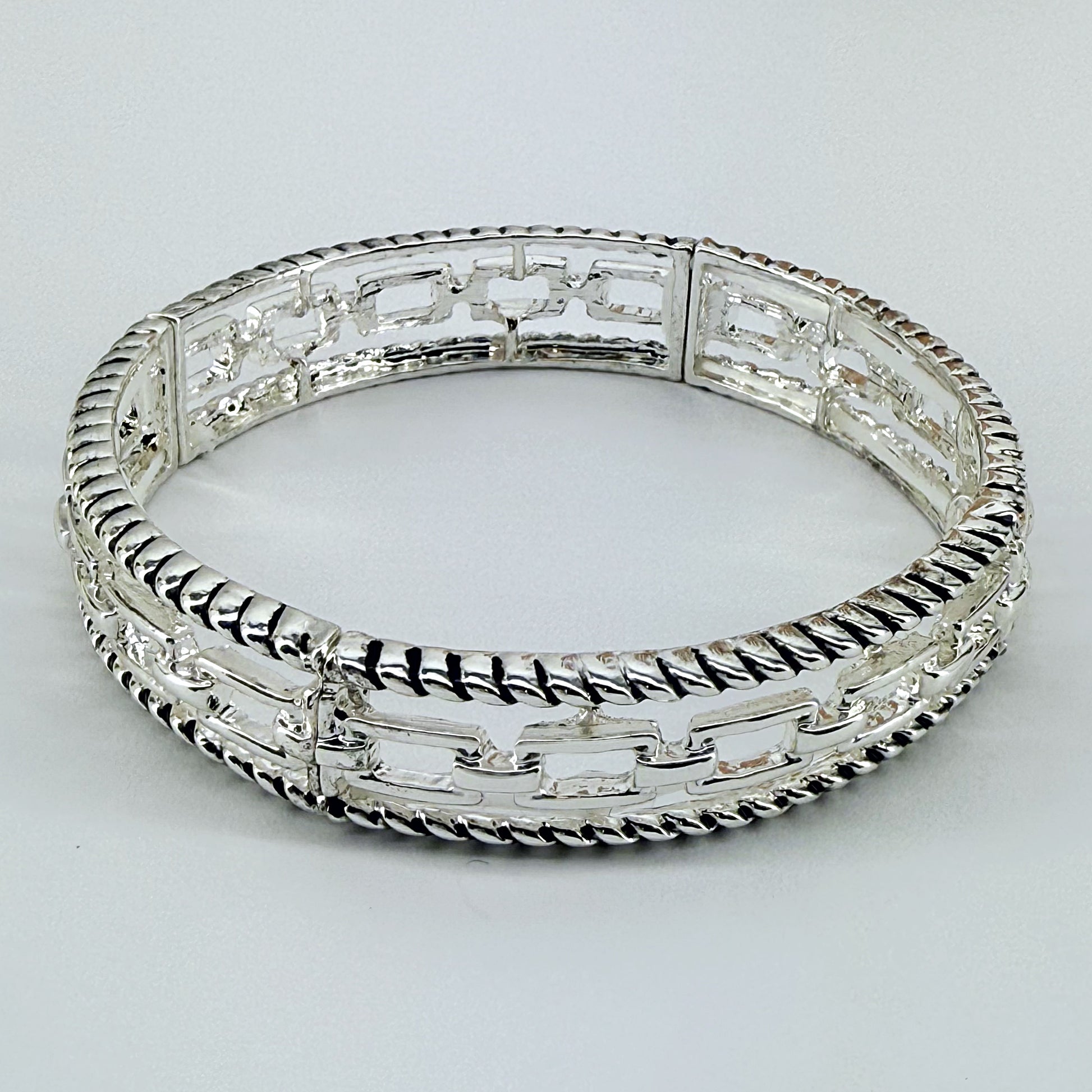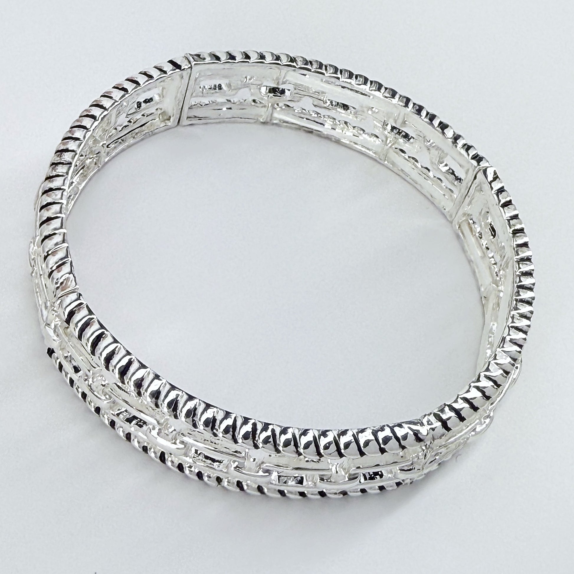Elevate your style with this stretchable bracelet featuring intricate filigree and a bold Cuban link design, available in elegant gold or silver finishes.