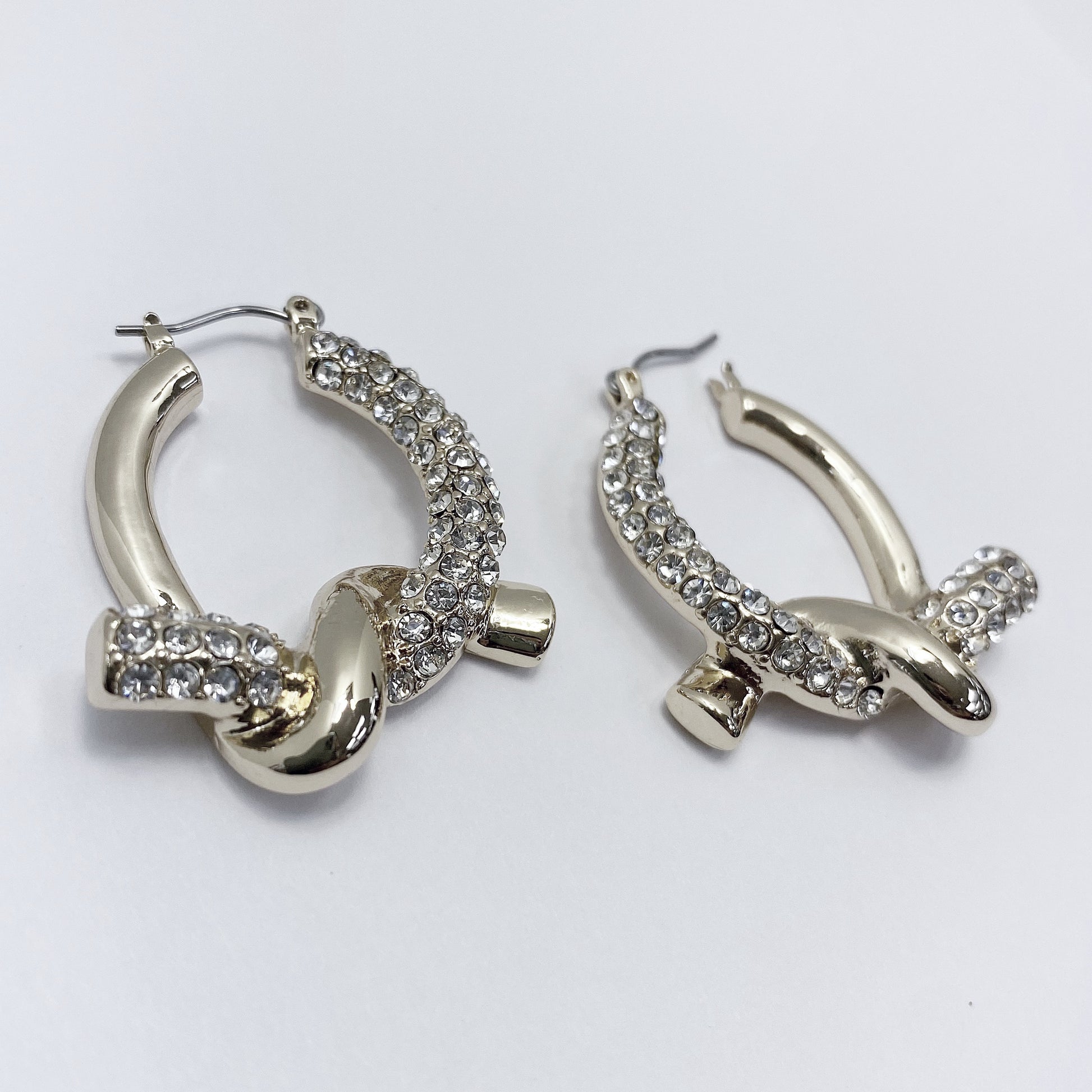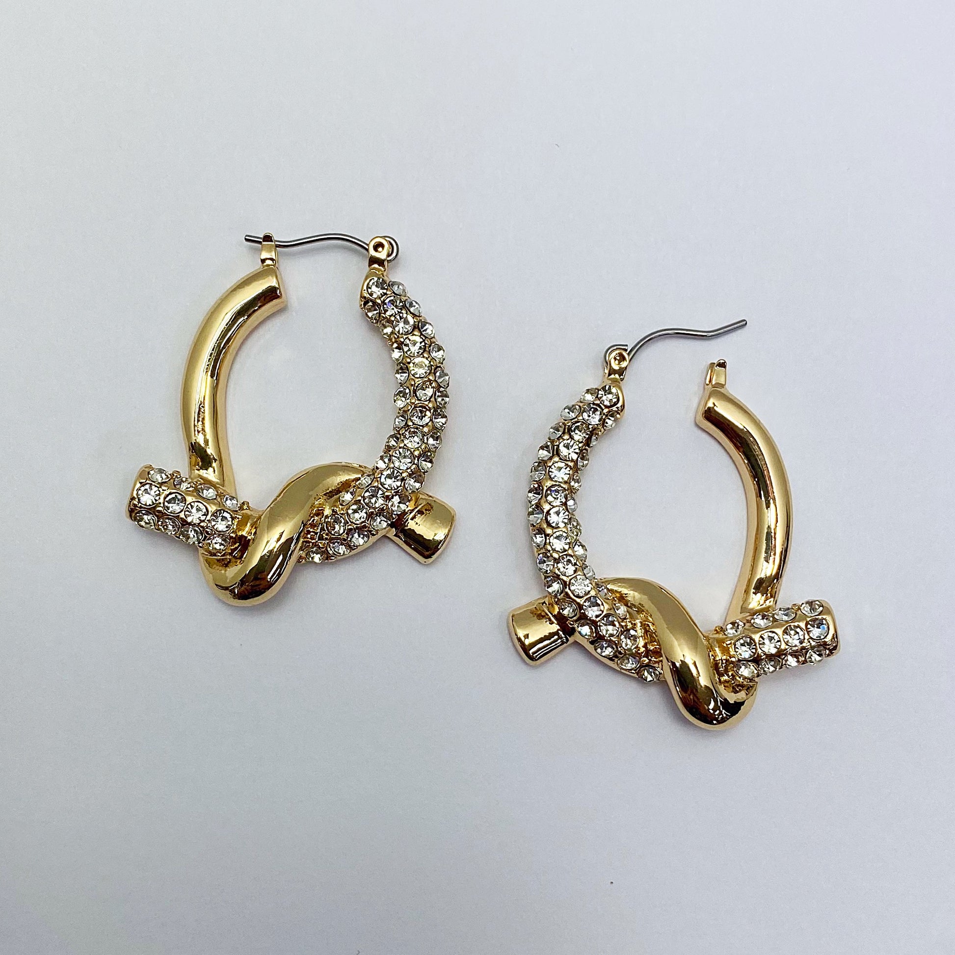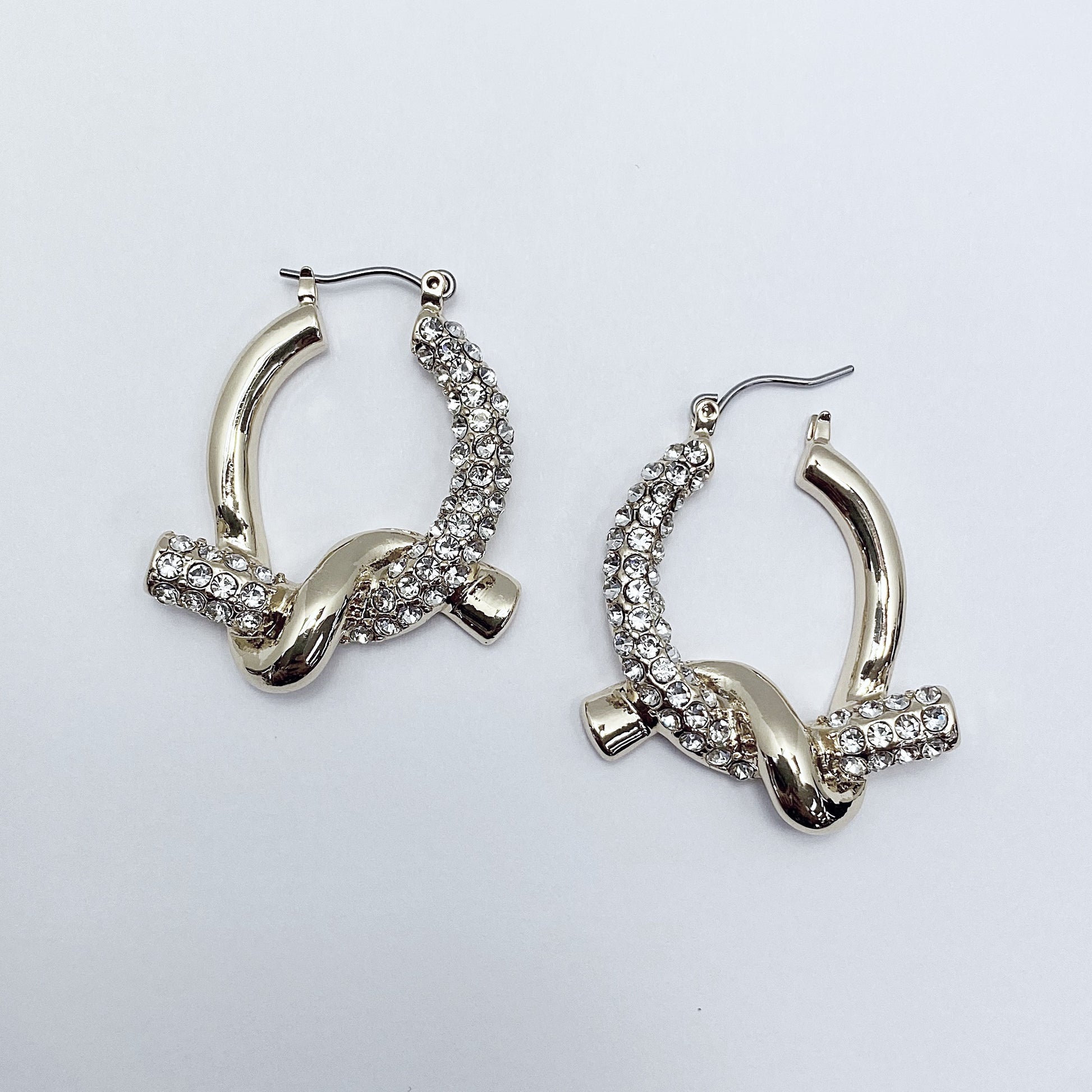 This dazzling hoop earring boasts a stunning combination of twisted metal and sparkling rhinestones, available in both gold and silver finishes. Indulge in the luxurious and elegant design of this accessory, perfect for adding a touch of glamour to any outfit.