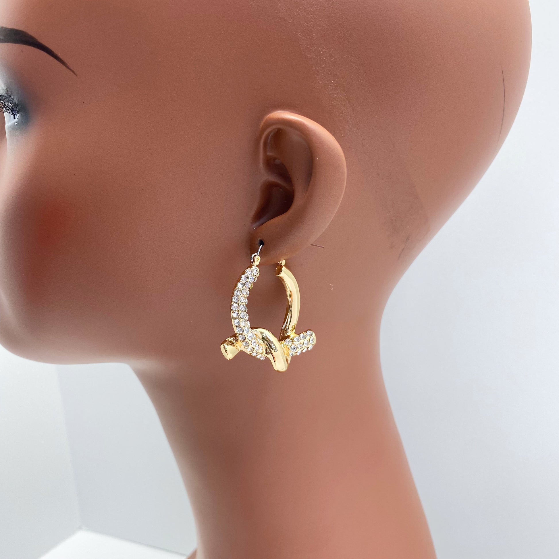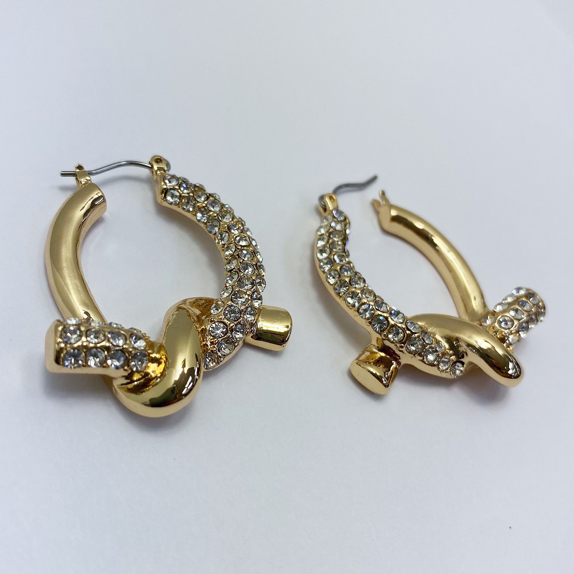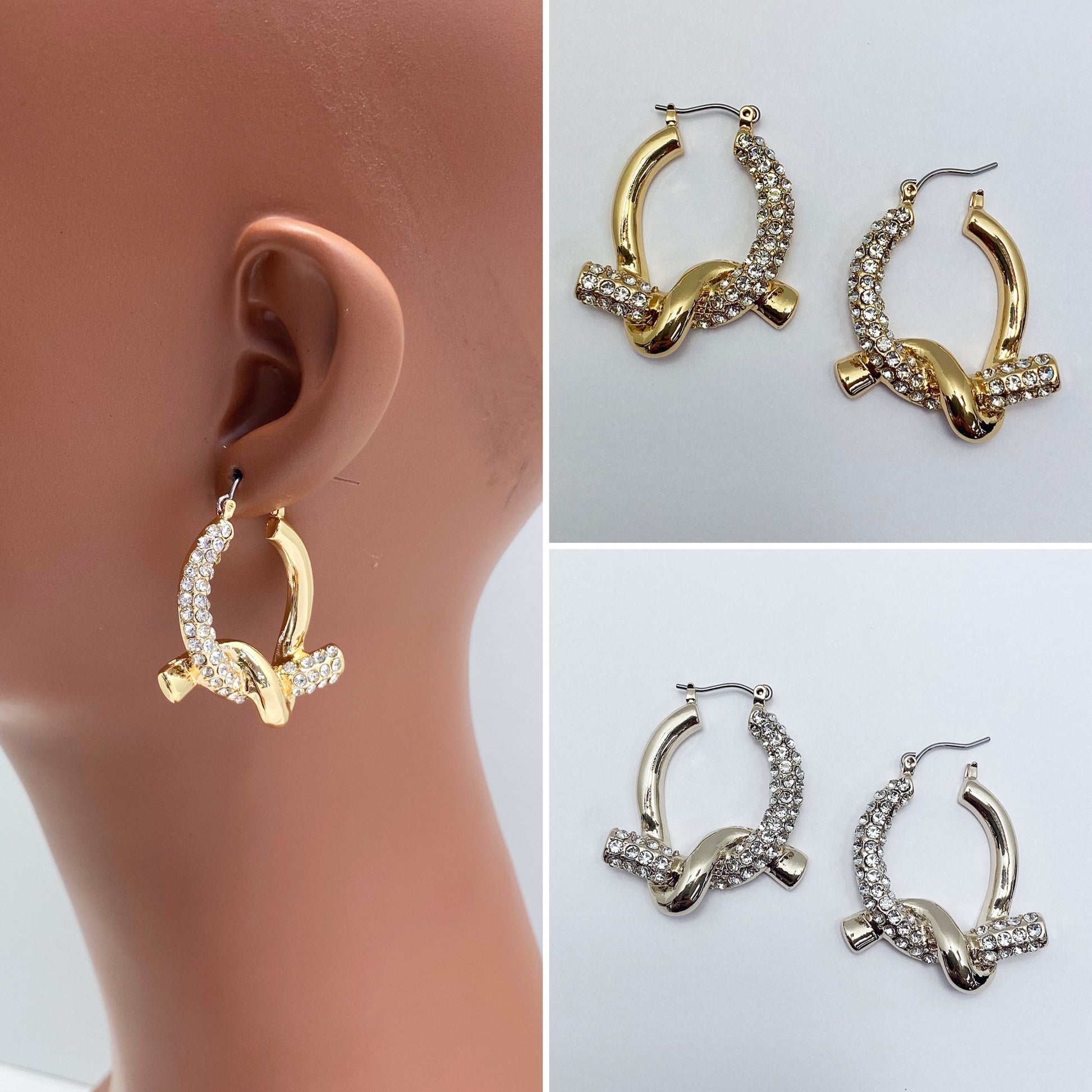 This dazzling hoop earring boasts a stunning combination of twisted metal and sparkling rhinestones, available in both gold and silver finishes. Indulge in the luxurious and elegant design of this accessory, perfect for adding a touch of glamour to any outfit.