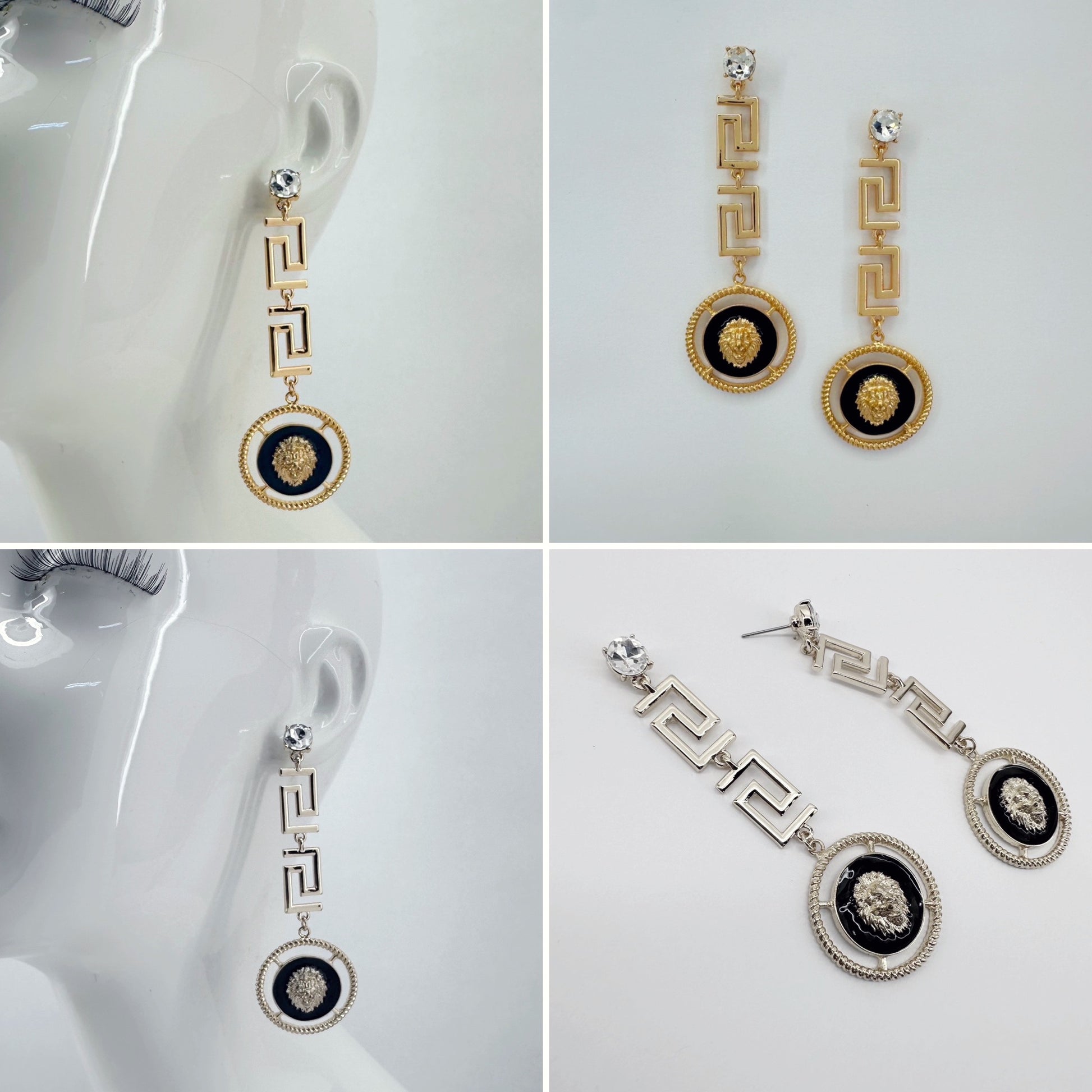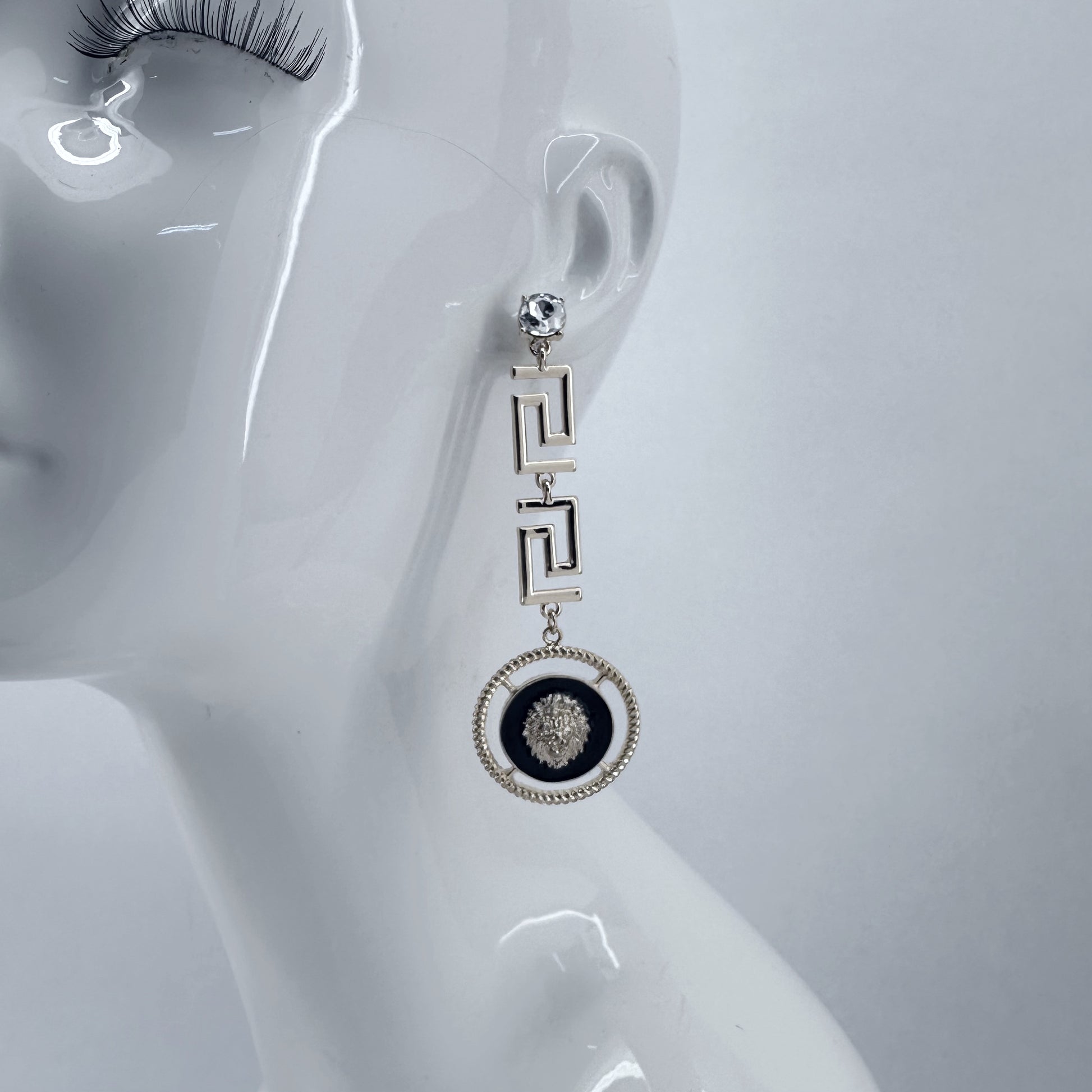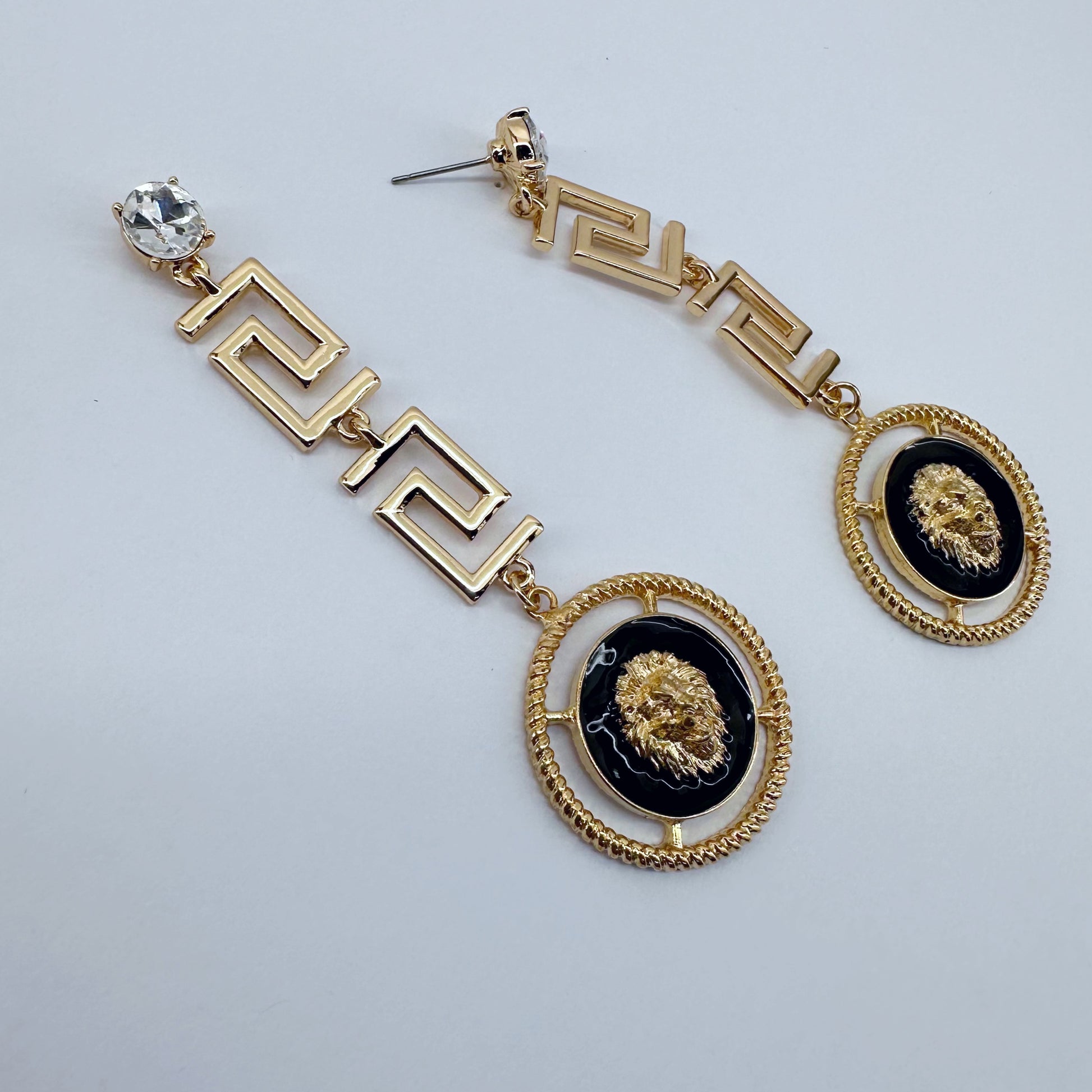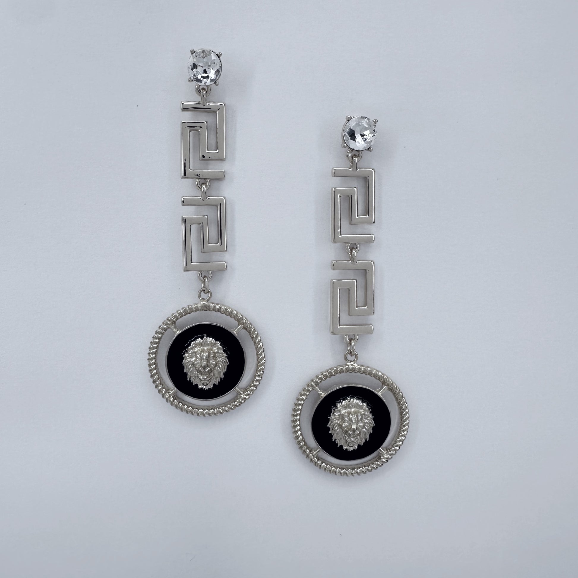 Clear Stone Post Greek symbol earrings With Lion Dangle