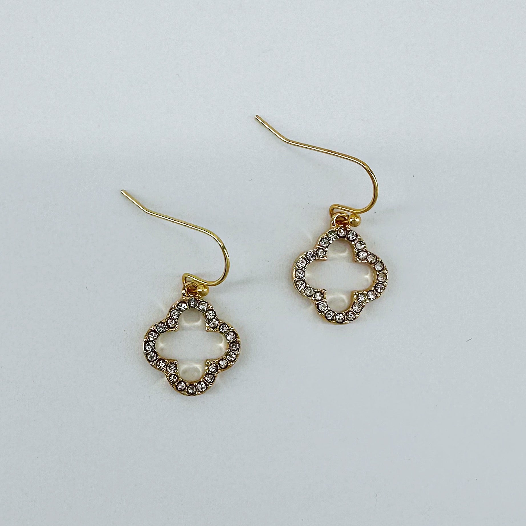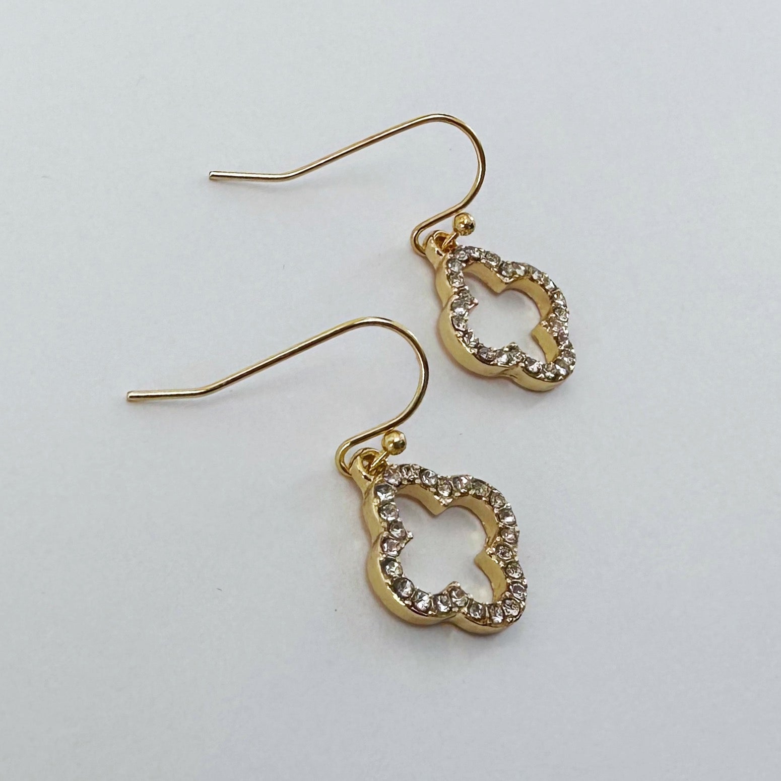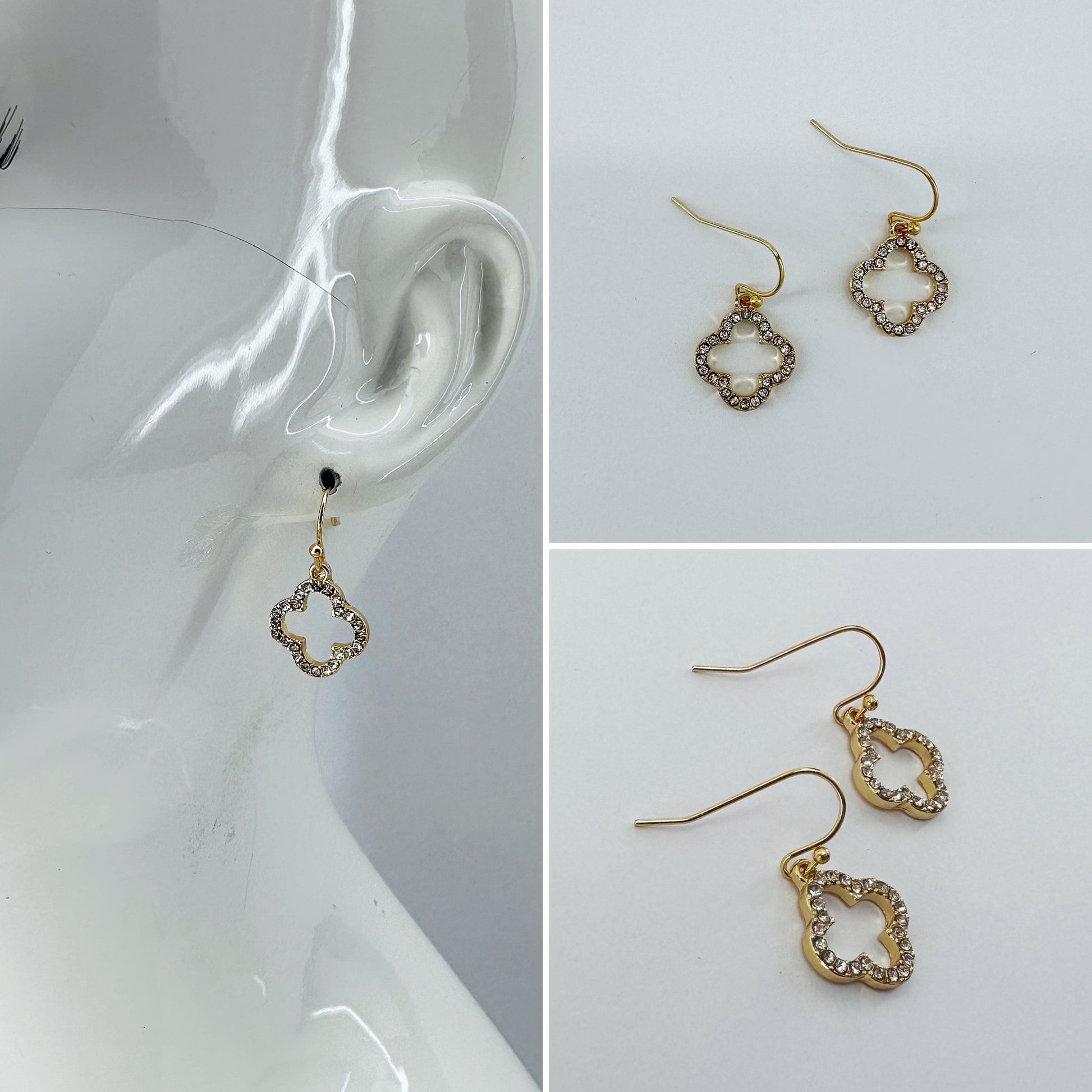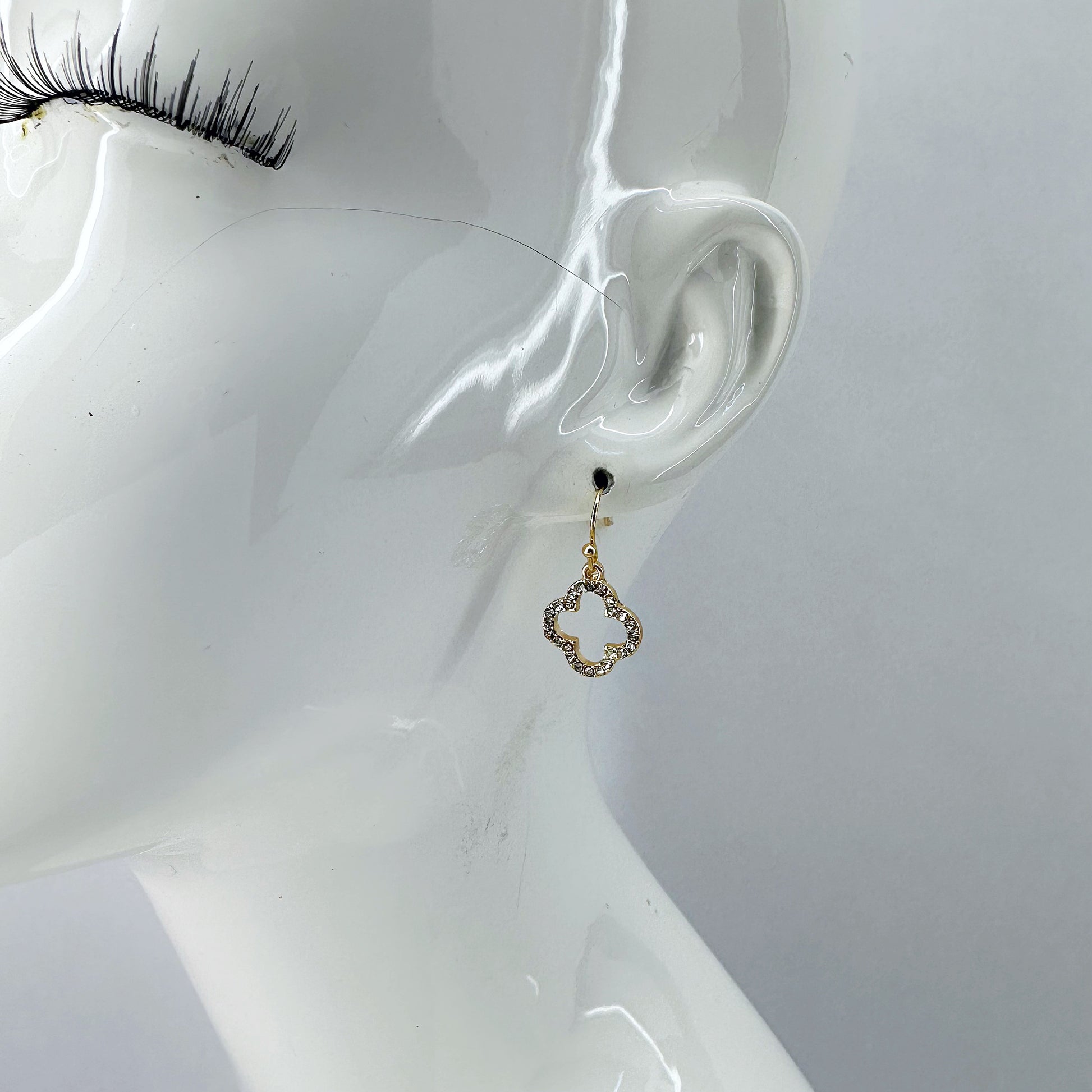Gold Finish Fish Hook Earring With Clover Outline Rhinestones Dangle