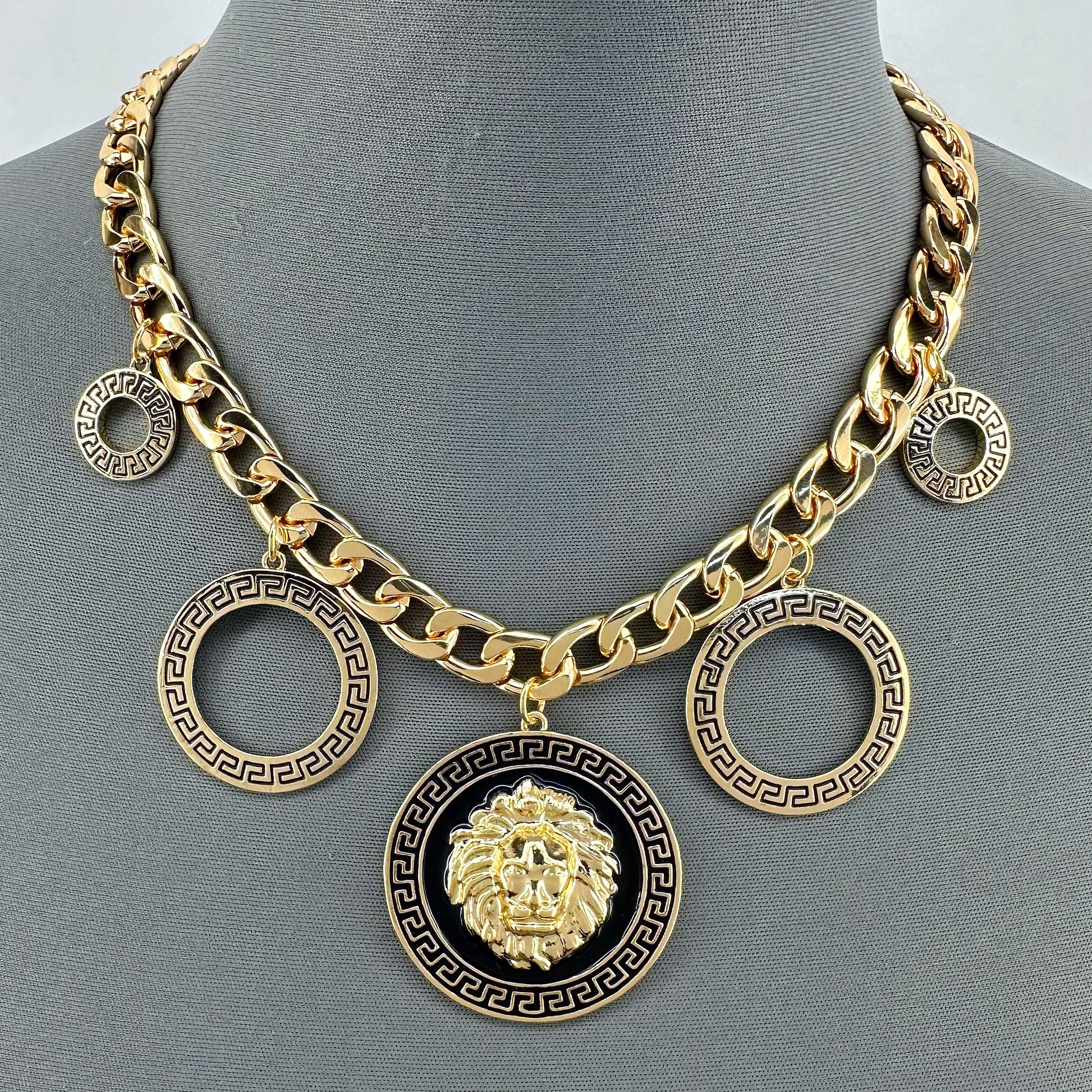 Indulge yourself in the luxurious charm of this Gold Finish Lion Head and Circle Greek Symbol Chain Necklace, adorned with multiple pendants. Experience the regal sensation of wearing this statement piece that exudes confidence, strength, and style.