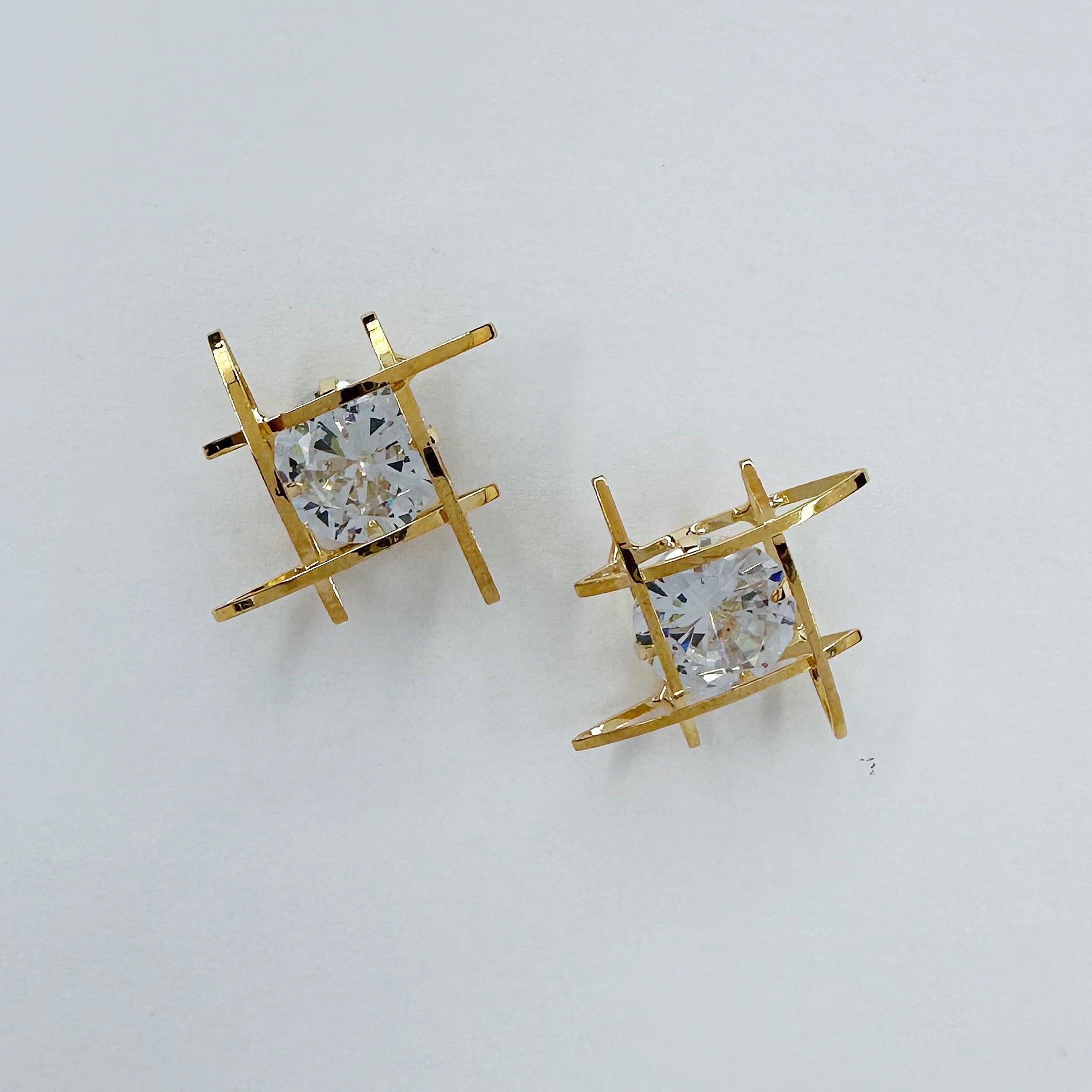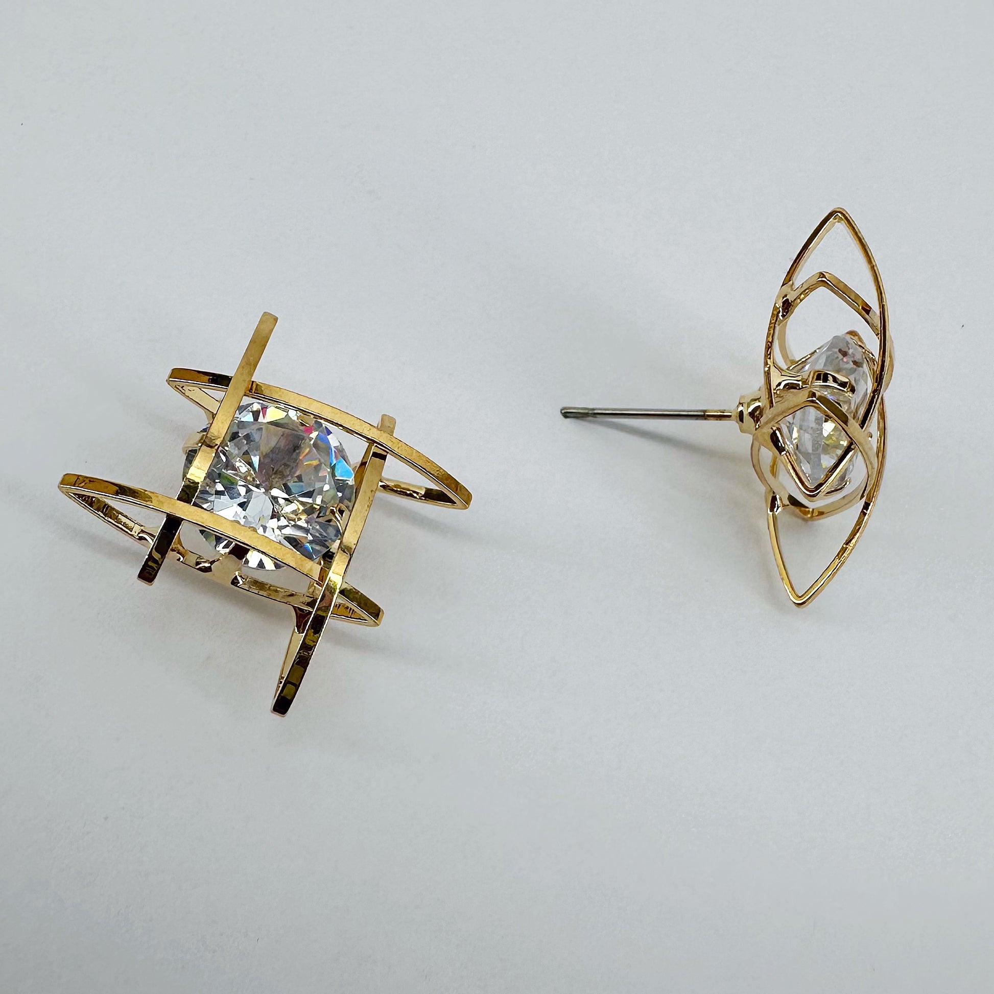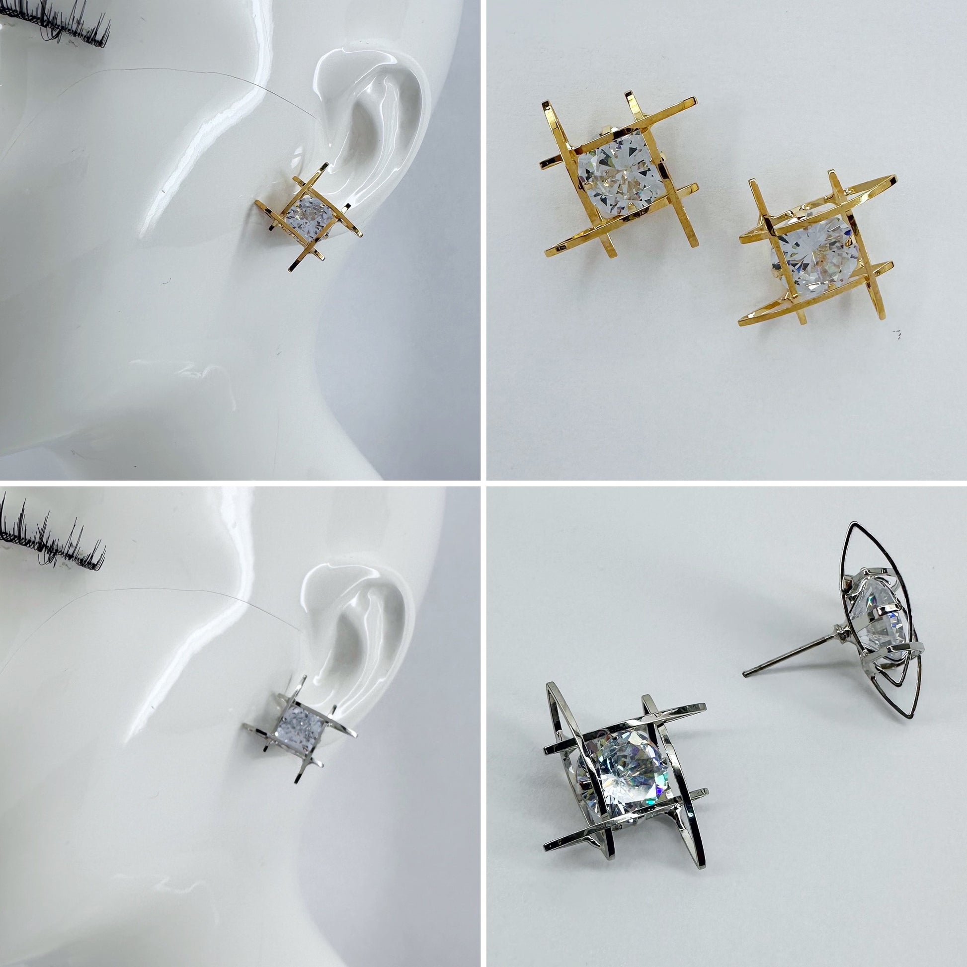 The product is a pair of post back cubic zirconia square wrap earrings available in both gold and silver finishes.