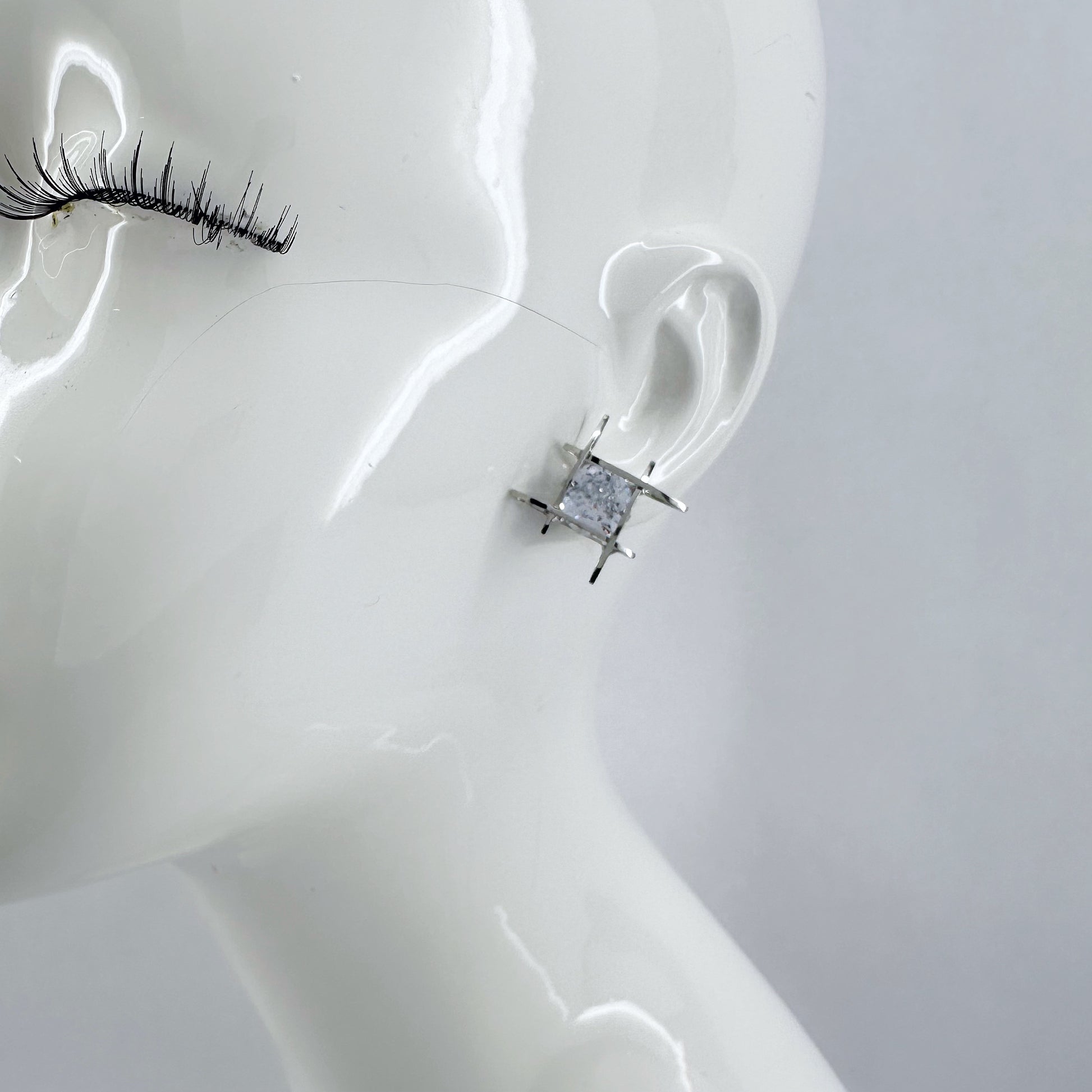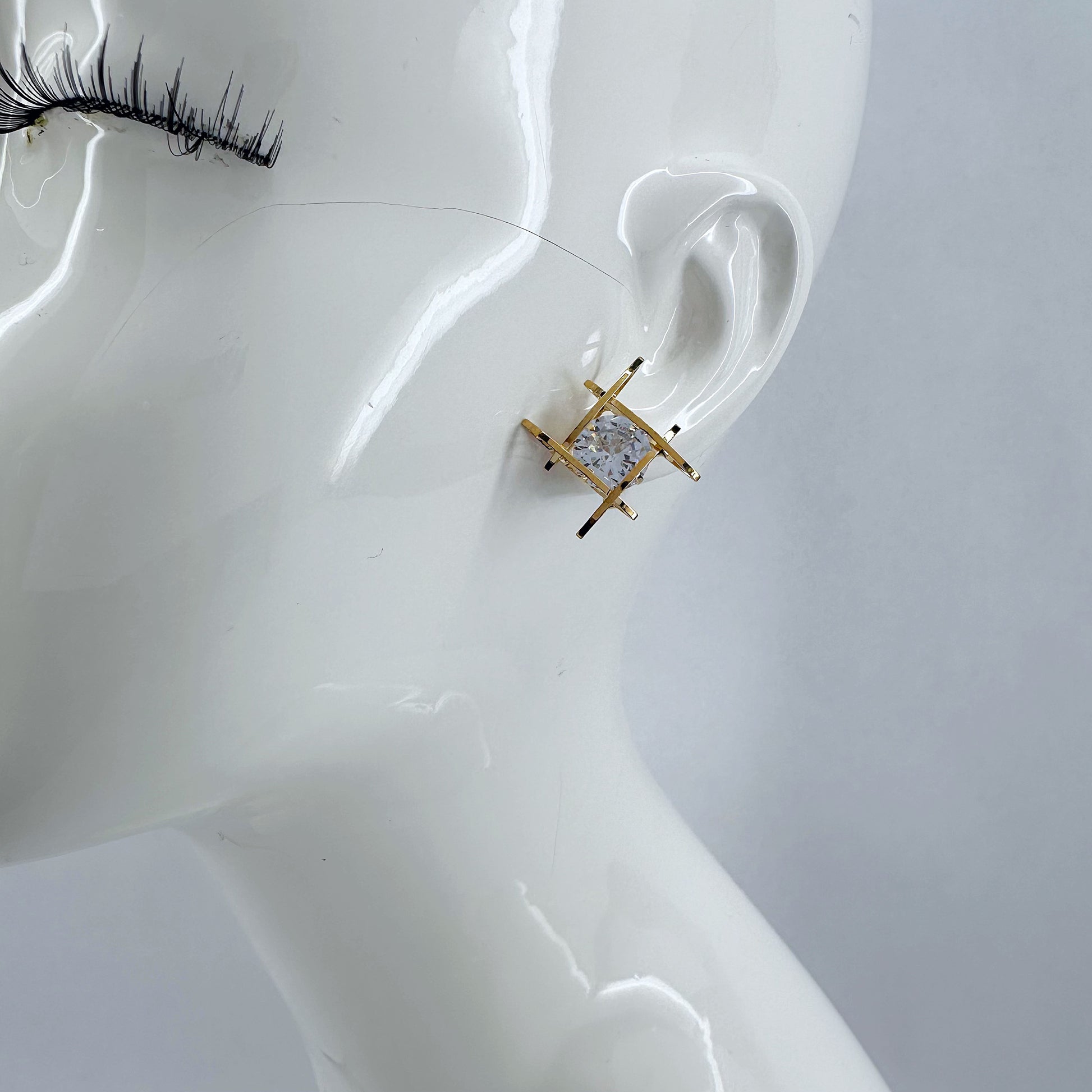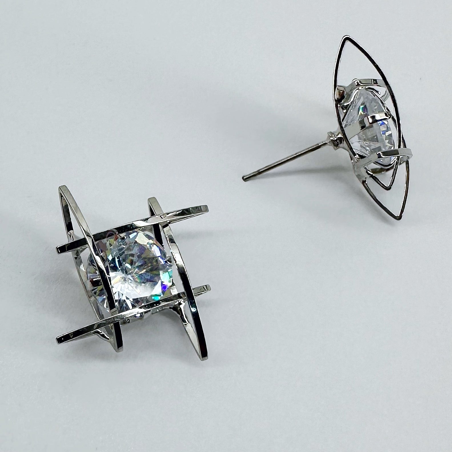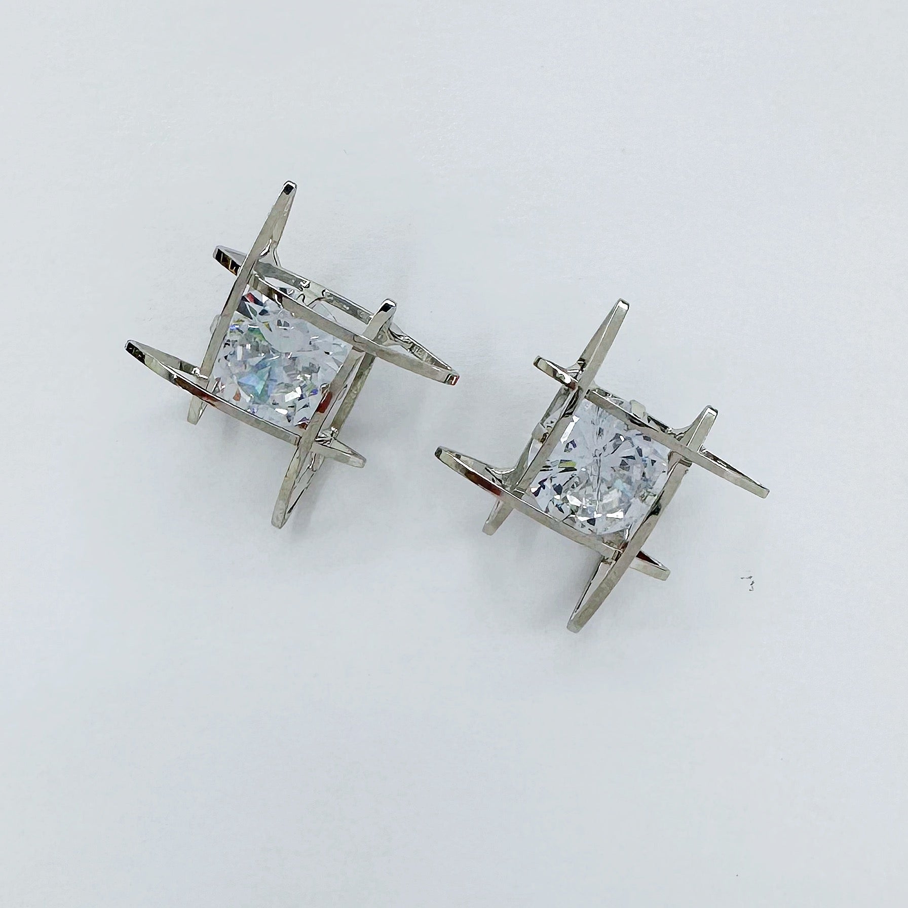 The product is a pair of post back cubic zirconia square wrap earrings available in both gold and silver finishes.