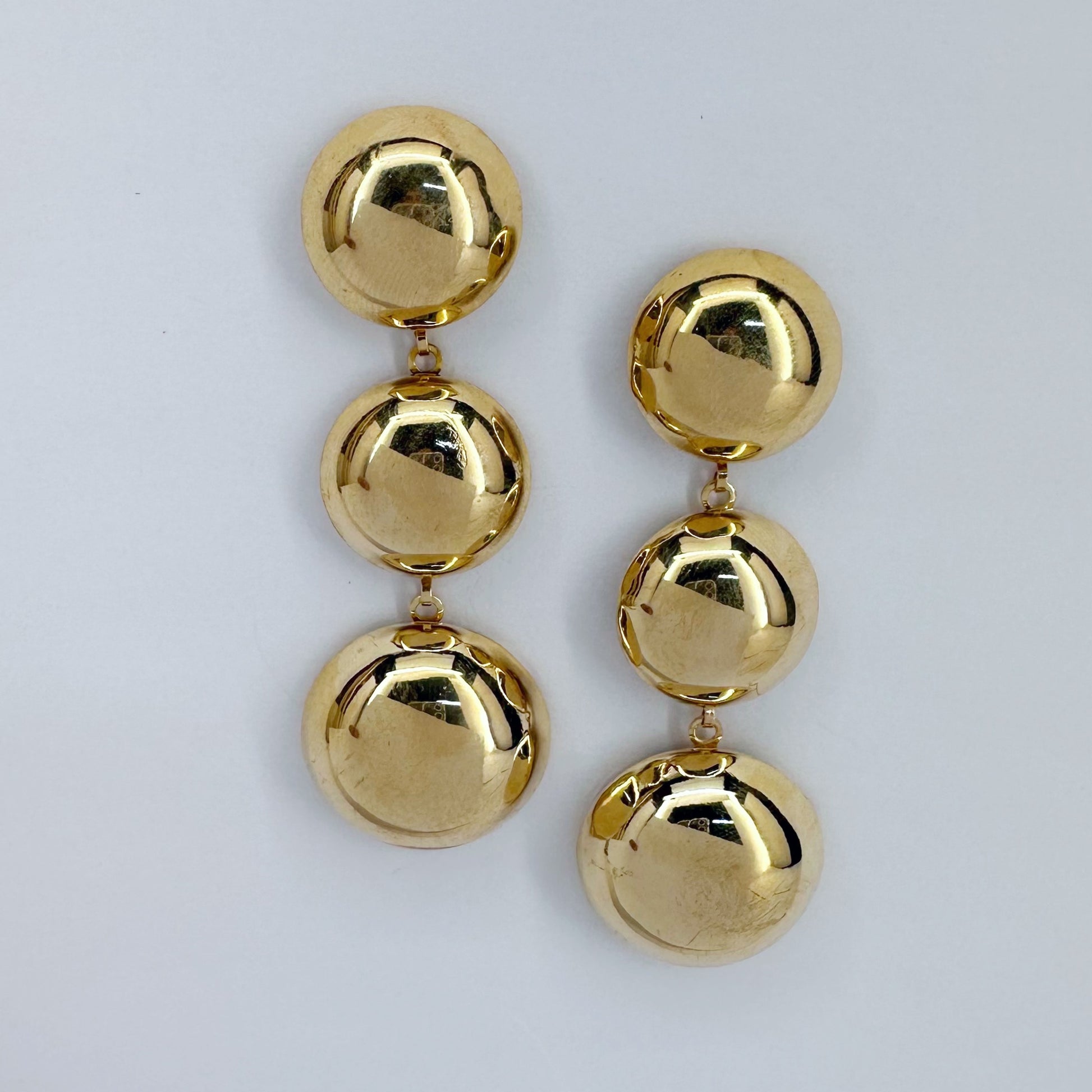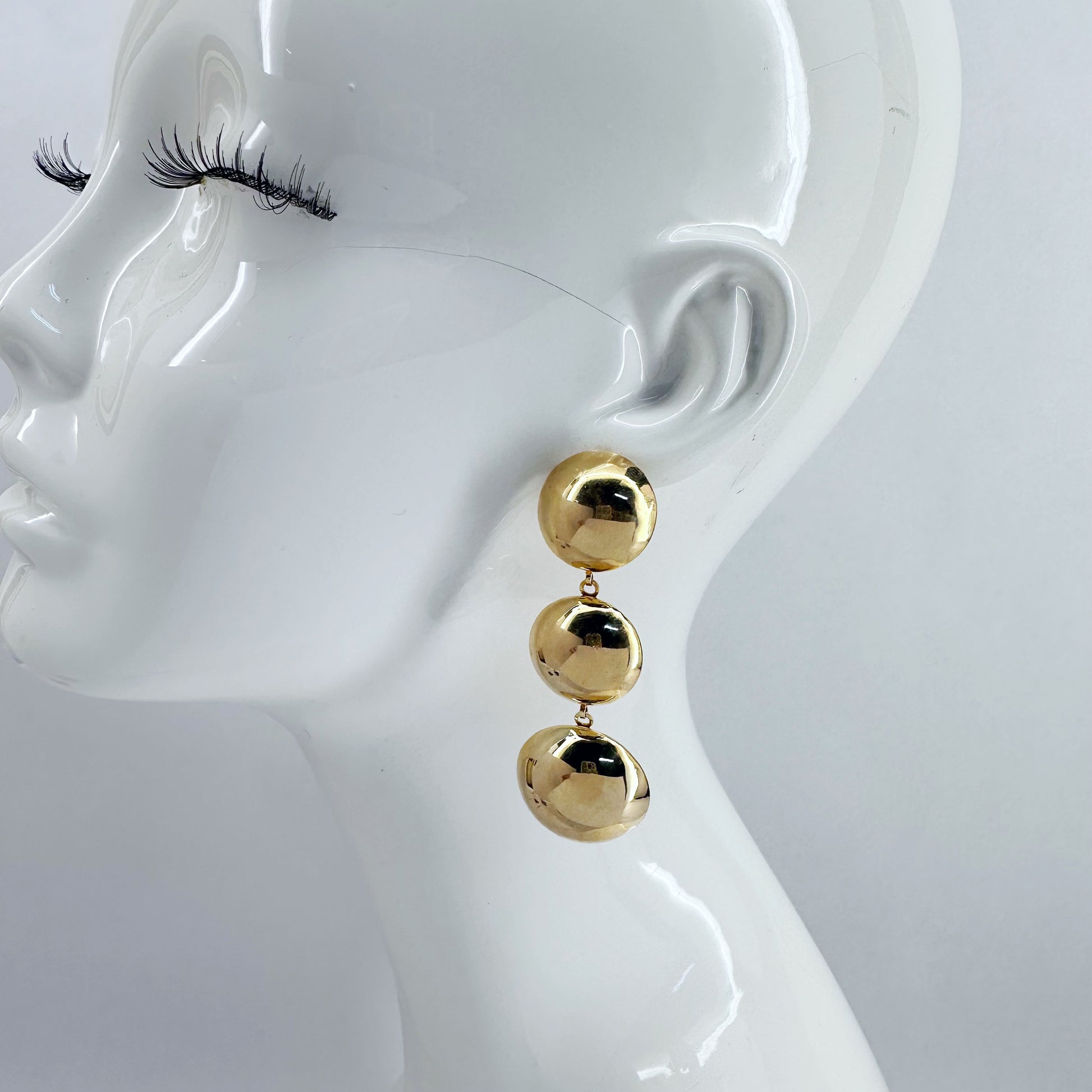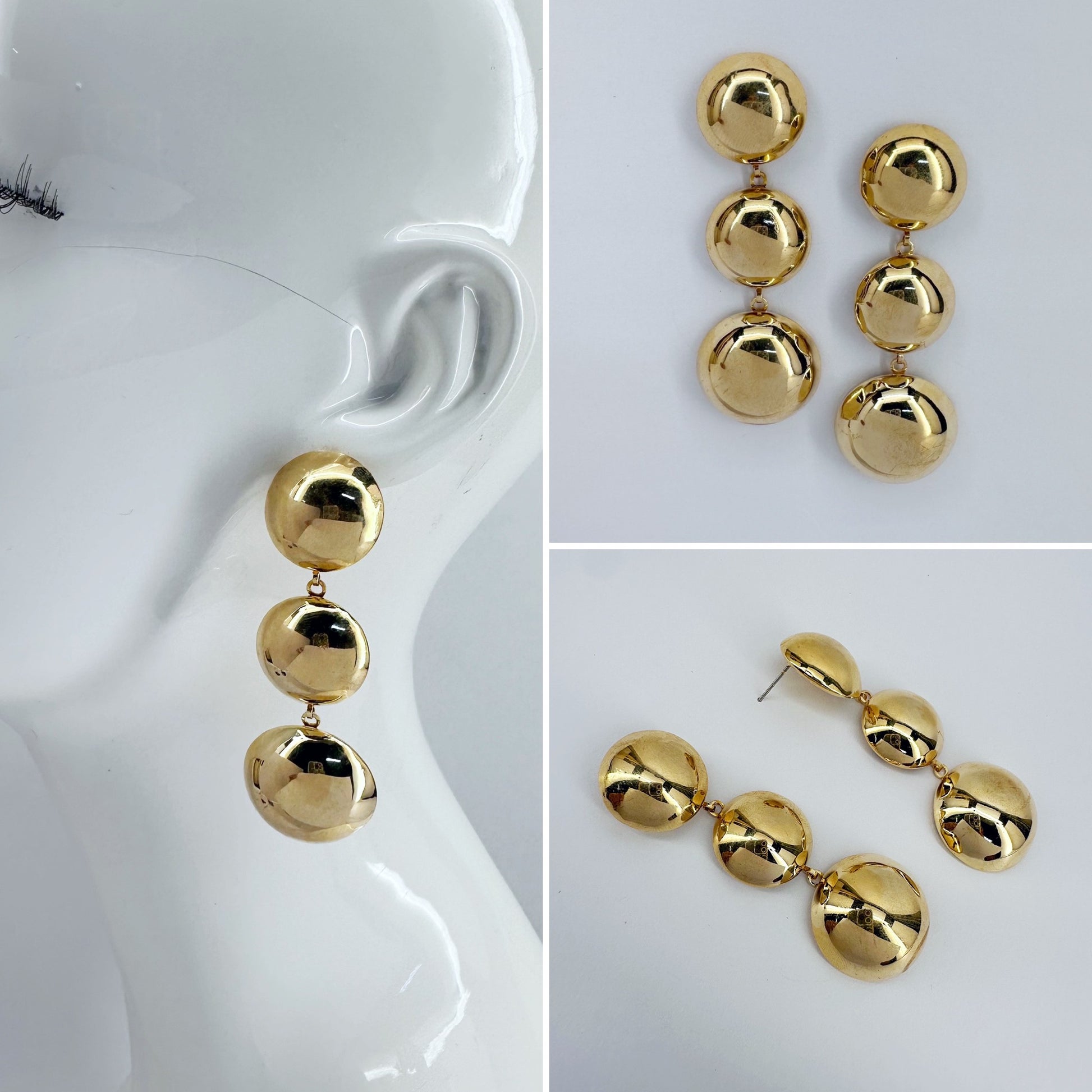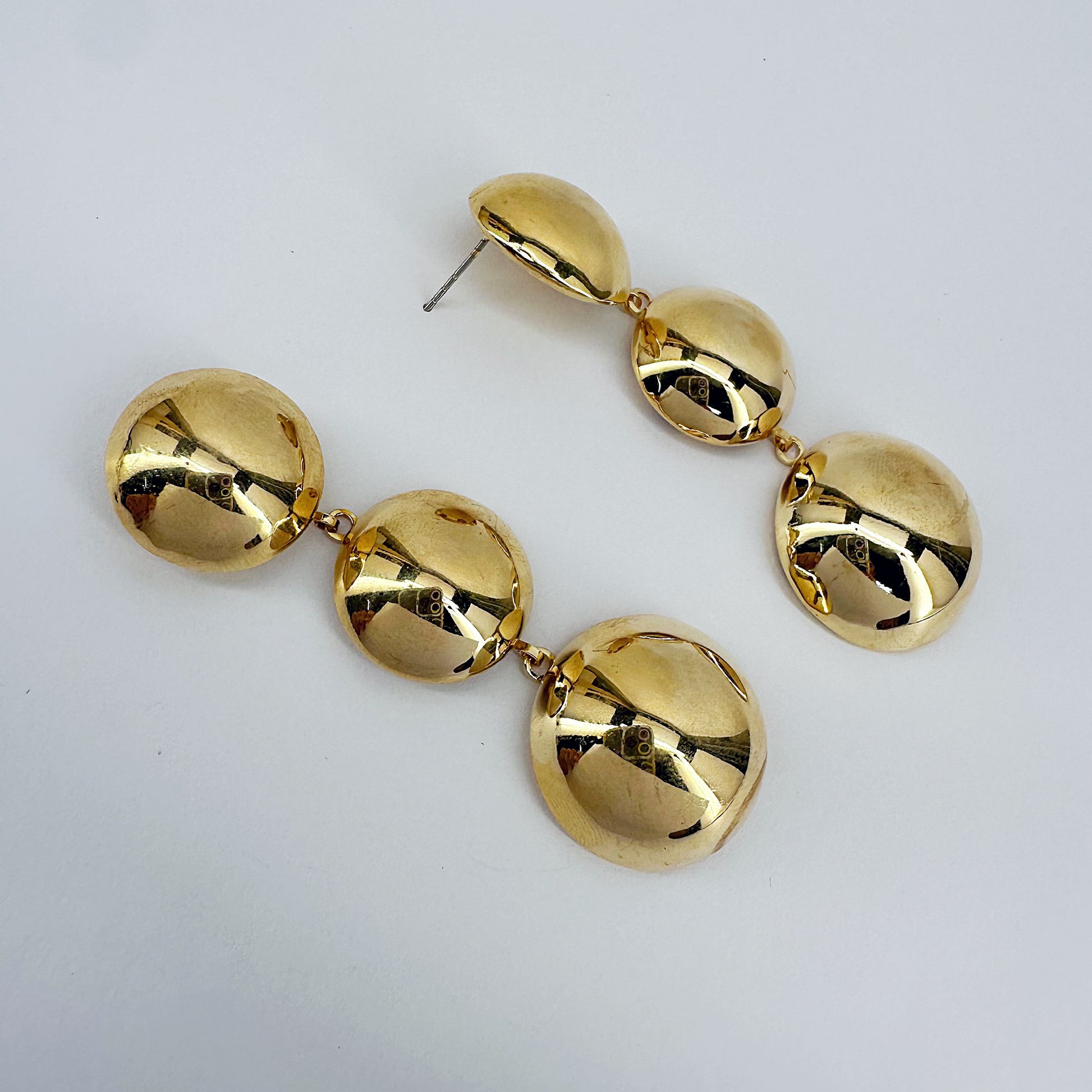This earring features a dome-shaped drop design and is finished with gold plating. It includes three rows for a unique and stylish look.