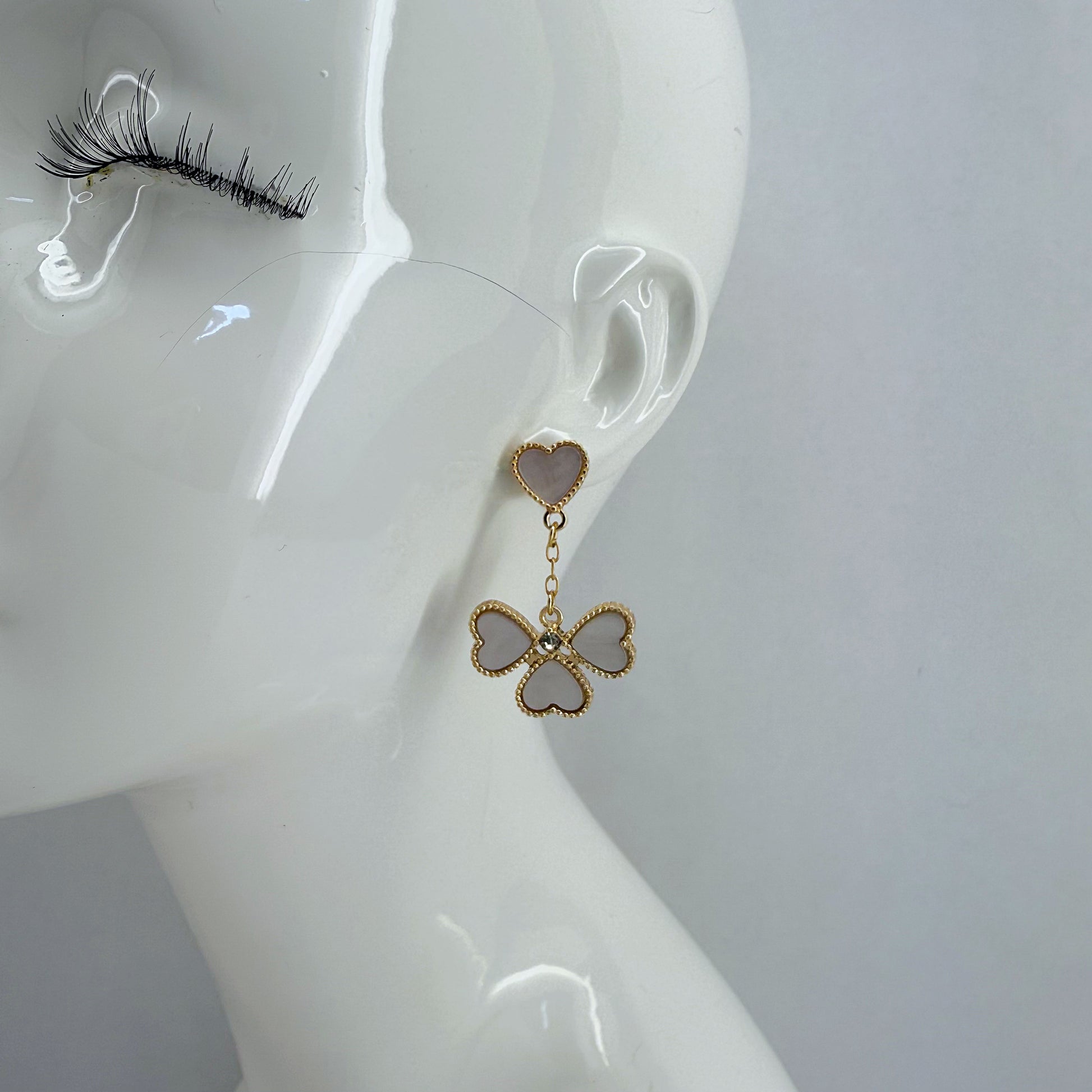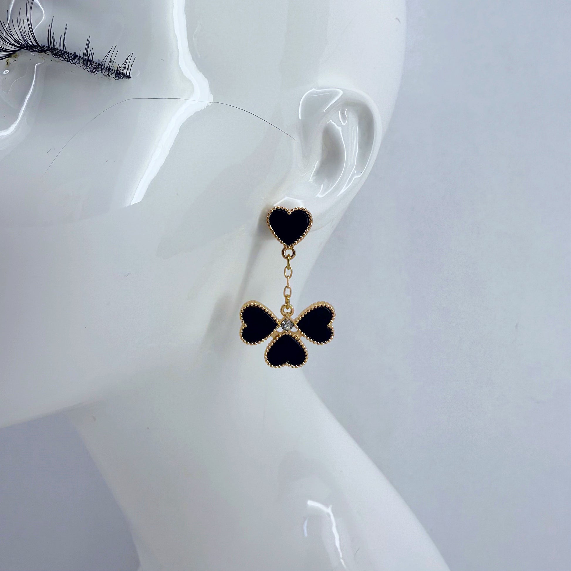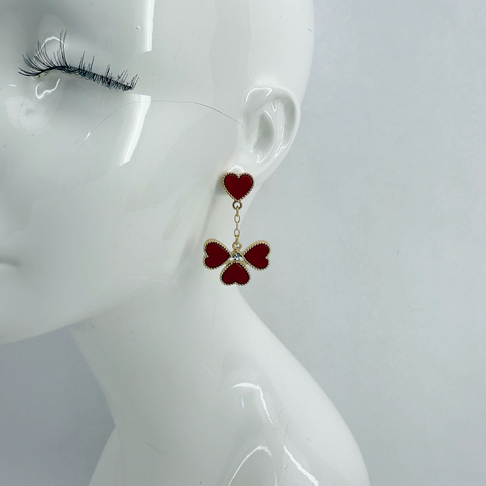 This stunning earring showcases a heart design with gold finish and features a beautiful dangling clover charm. Perfect for adding a touch of elegance and charm to any outfit.
