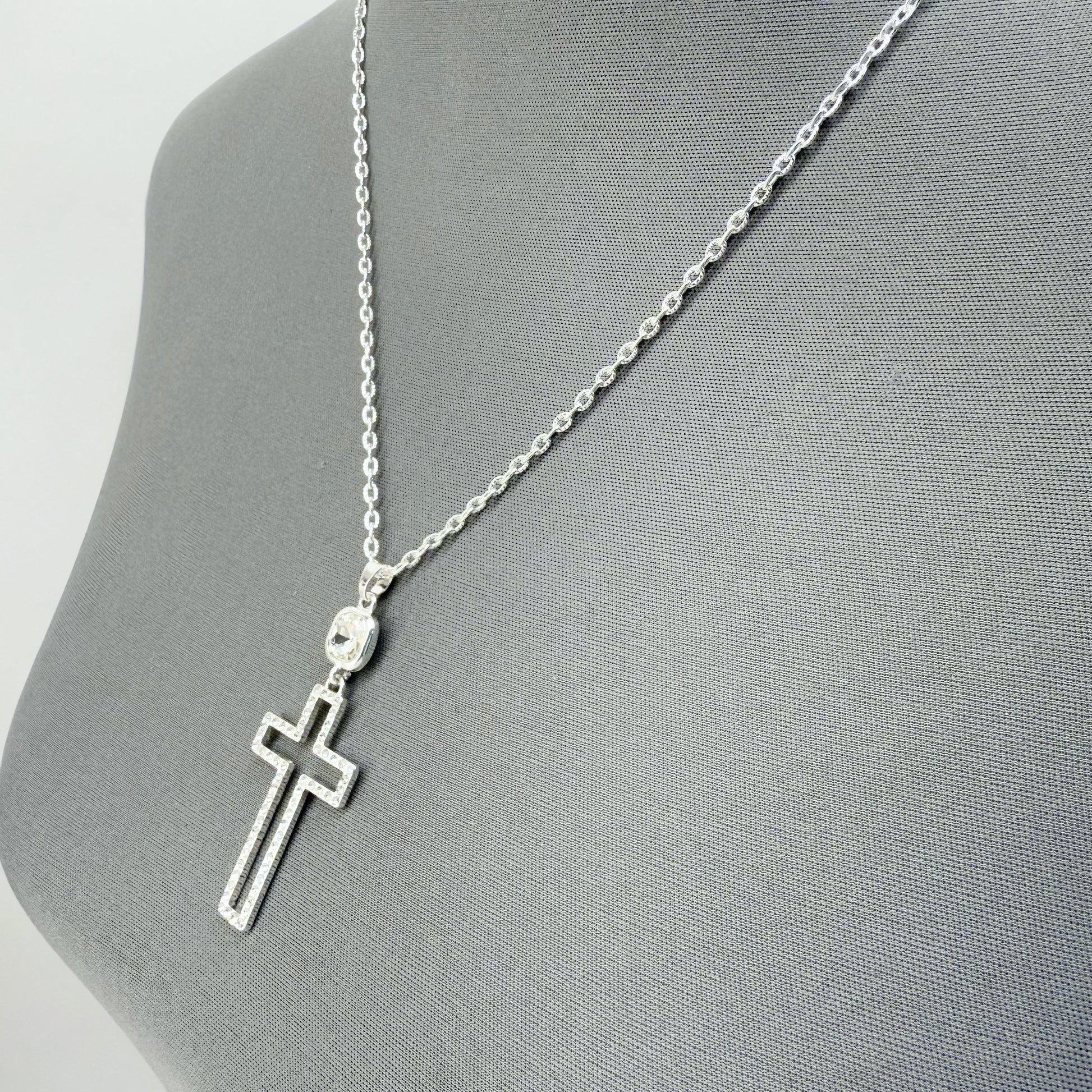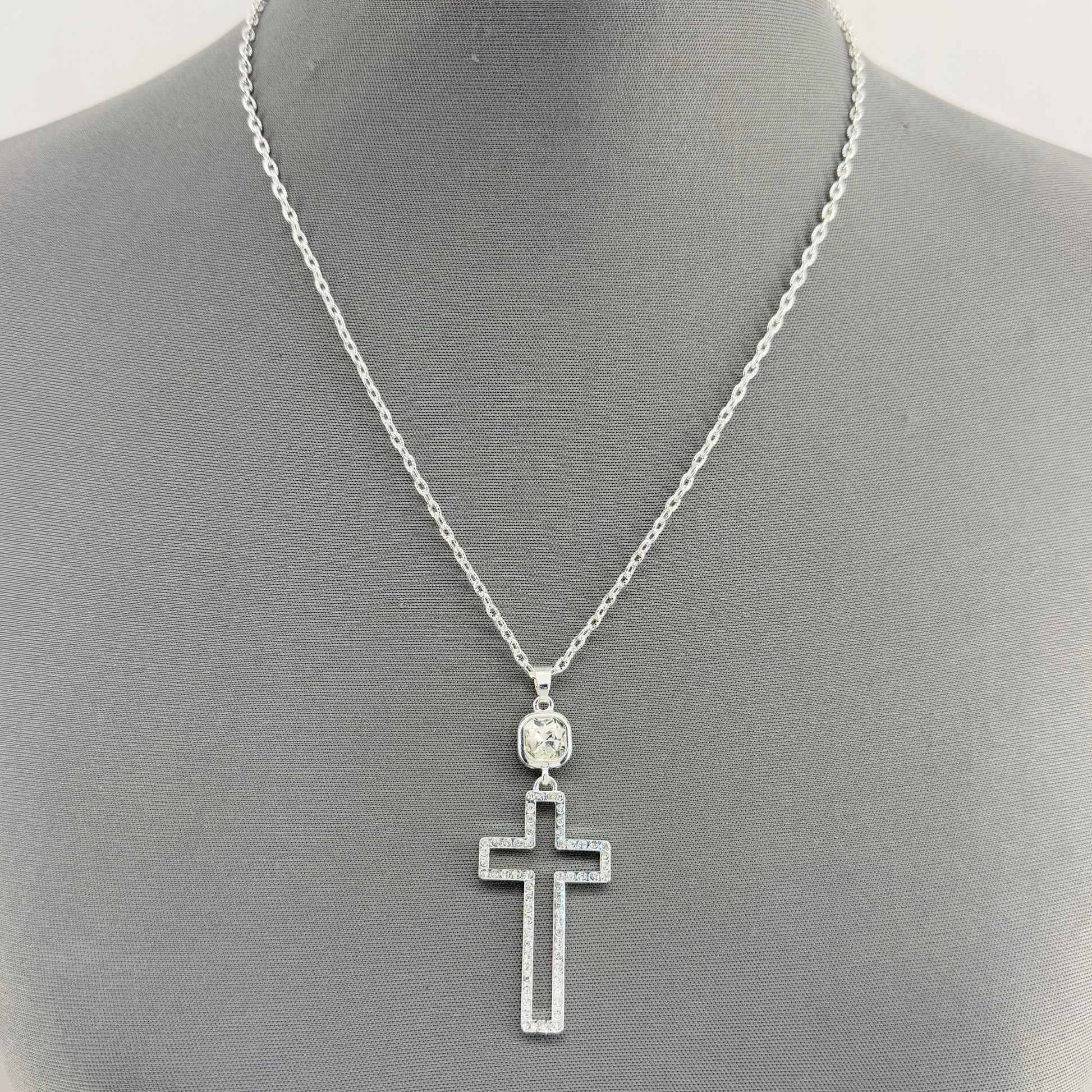 Elevate your style with this elegant necklace featuring a cut-out cross pendant adorned with sparkling clear rhinestones, available in both gold and silver finishes. Perfect for adding a touch of sophistication to any outfit.