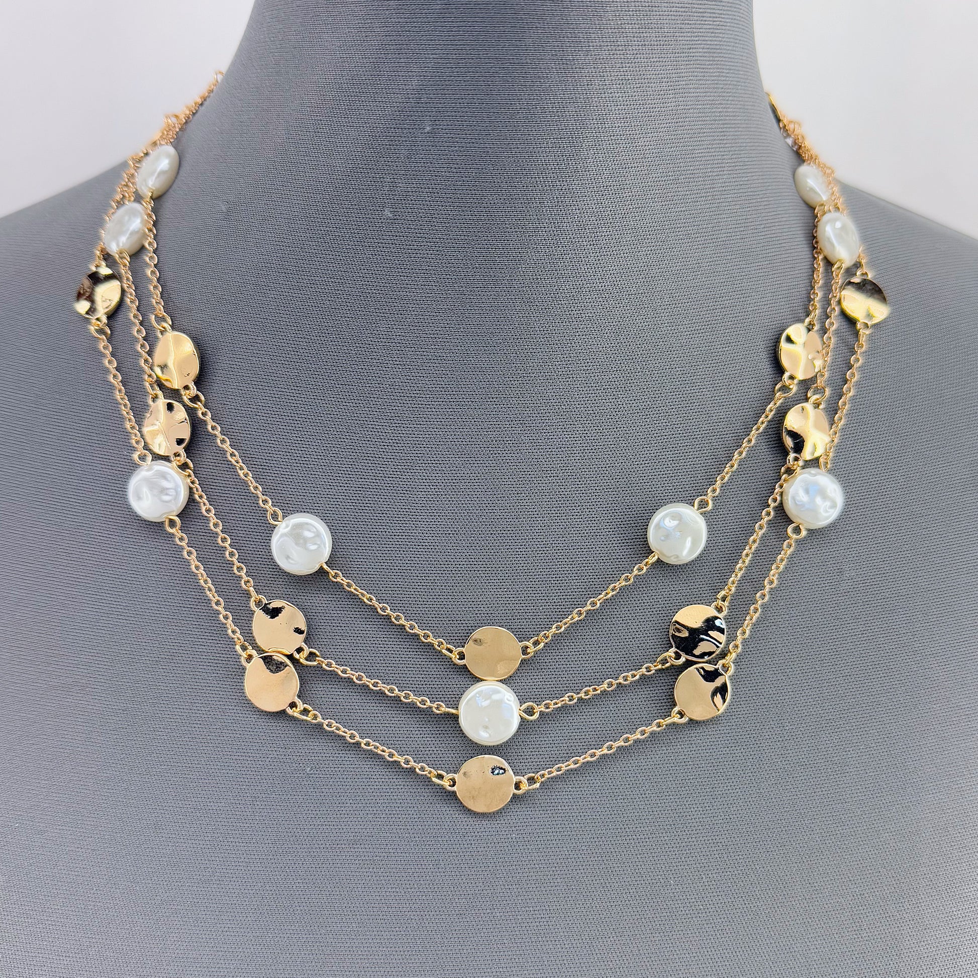 This multilayered necklace features a gold finish, combining metal coin accents with flat pearls for a stylish and sophisticated look.