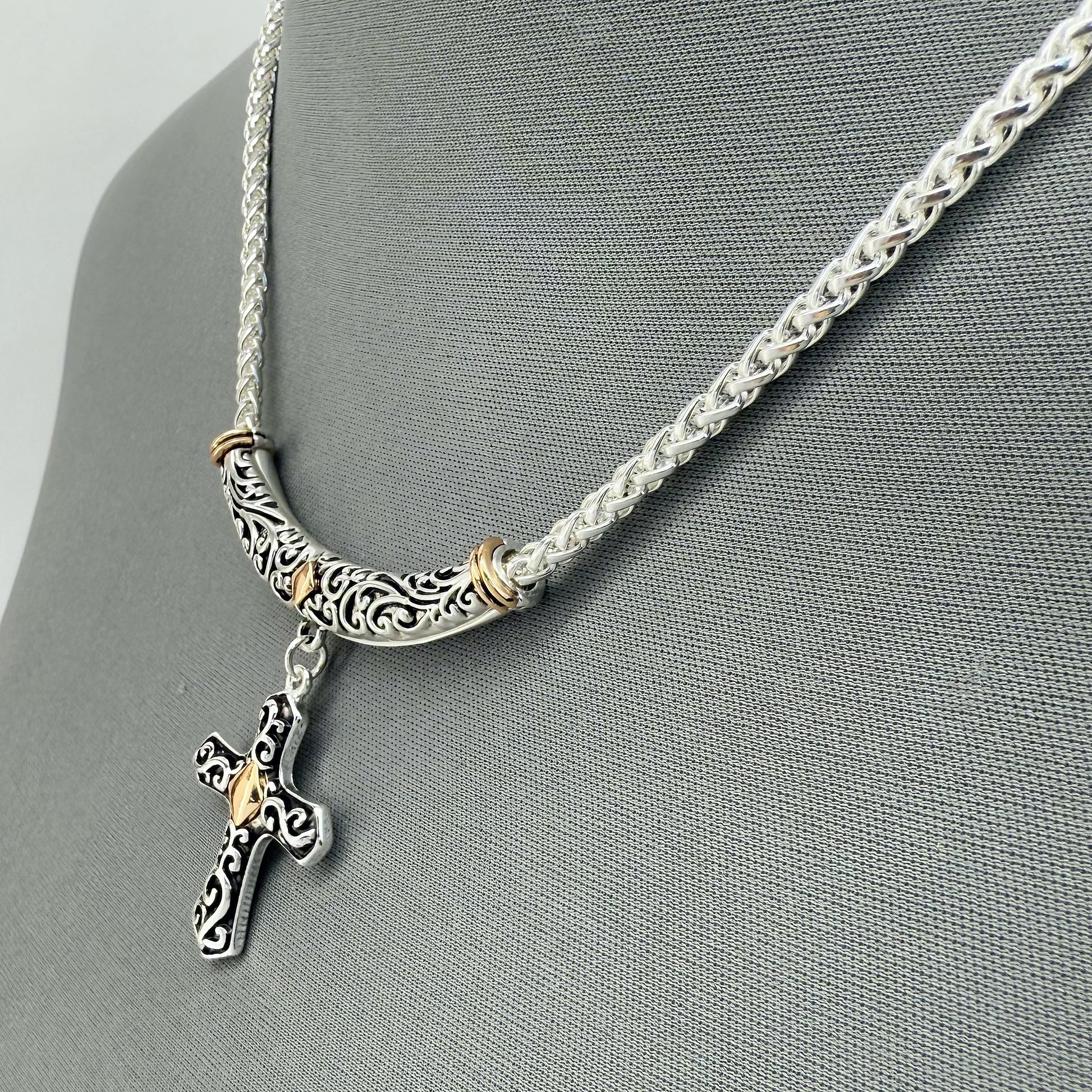 This exquisite necklace features a delicate filigree design in a striking two-tone gold and silver finish, elegantly accented with a cross pendant. Perfect for adding a touch of sophistication and meaningful style to any outfit.