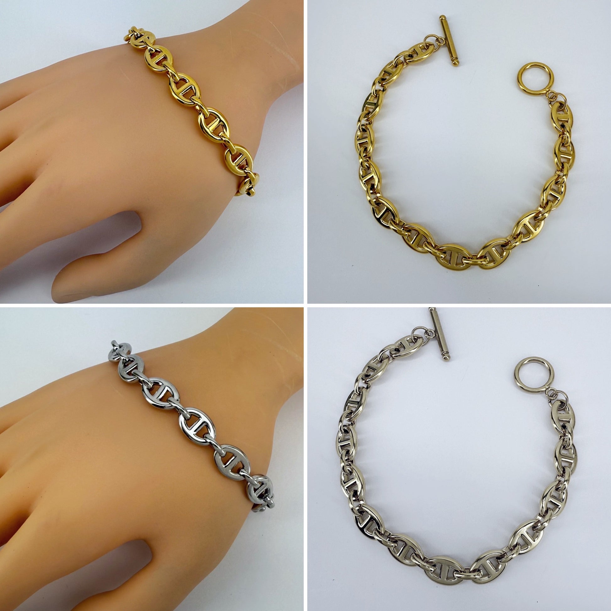 Make a statement with this stainless steel link chain bracelet, inspired by designer styles and finished in your choice of radiant gold or polished silver. A timeless accessory that enhances any look with effortless elegance.