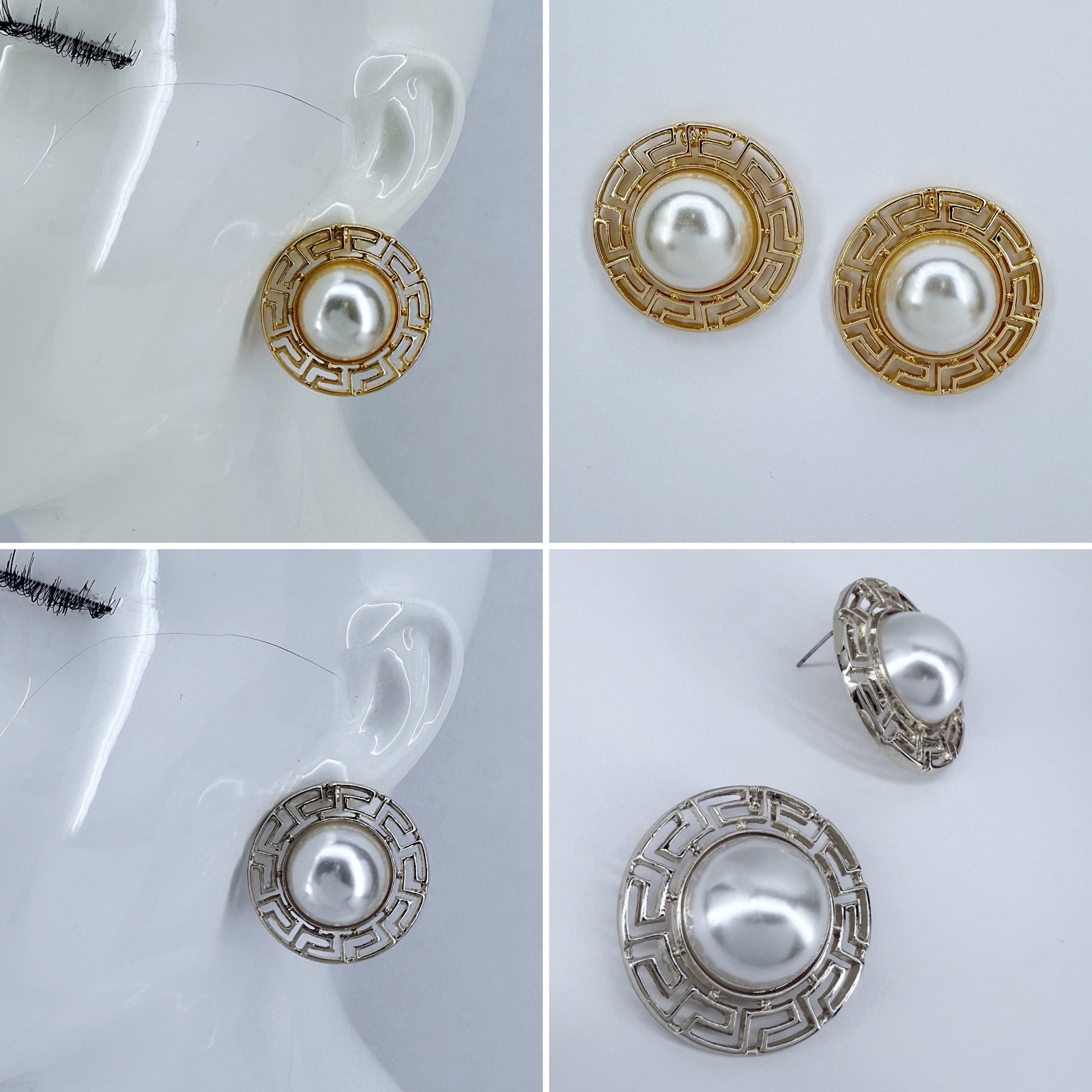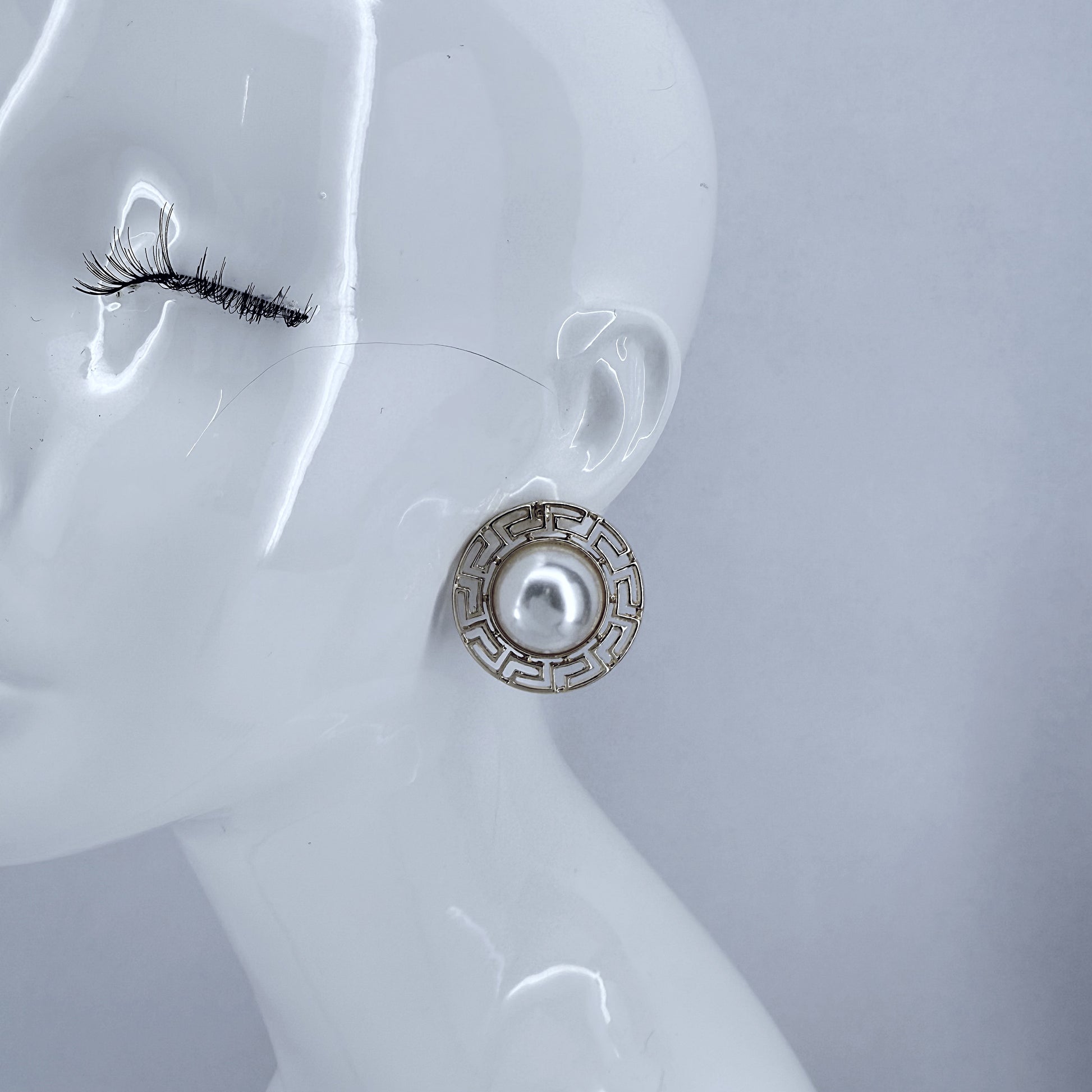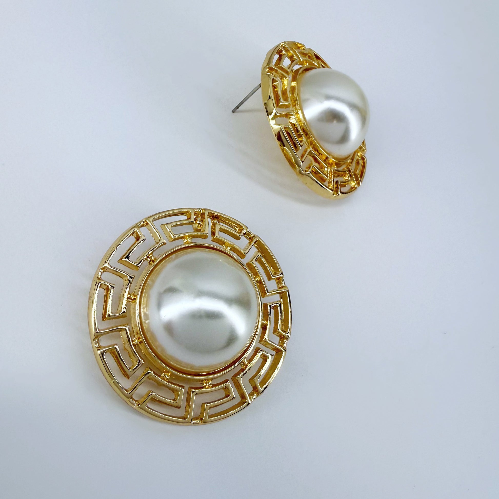 Enhance your look with these round earrings featuring a Greek symbol design and half pearl accents, secured with a convenient post back closure.