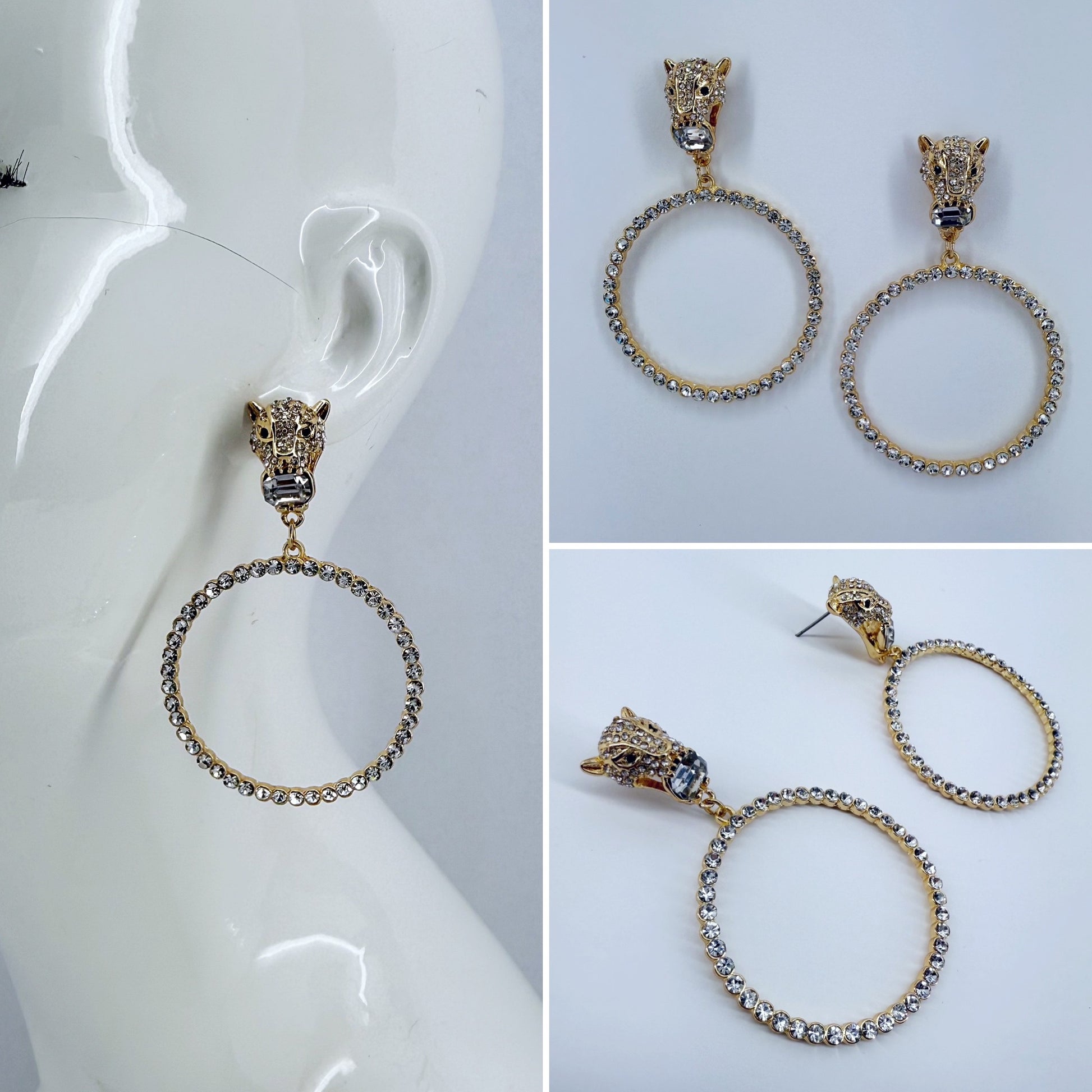 Make a bold statement with these round earrings inspired by designer styles, featuring sparkling jaguar rhinestones for a captivating look.