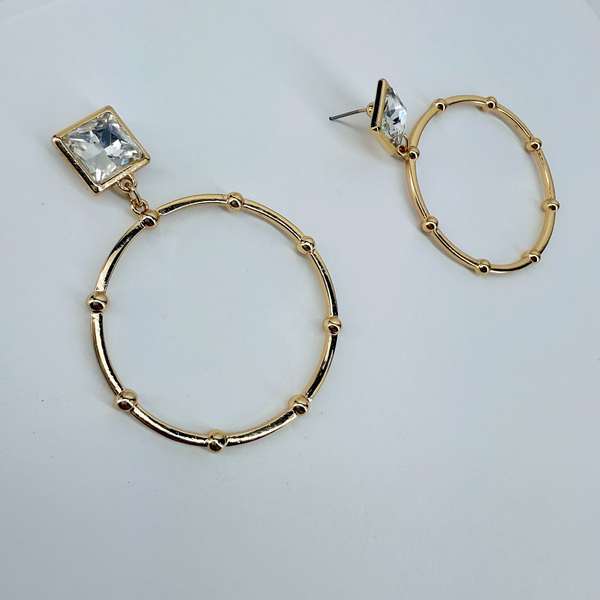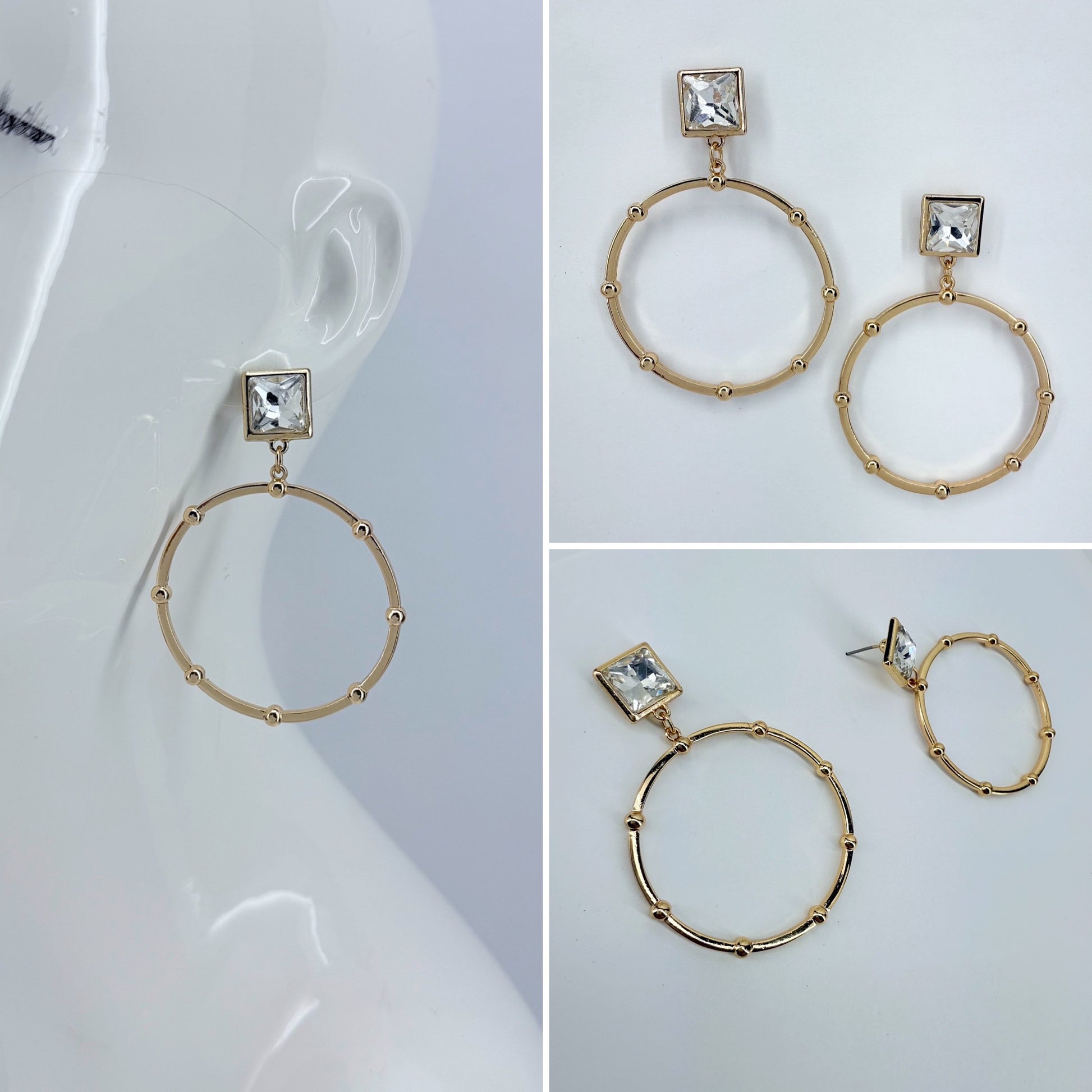 Discover timeless charm with these gold-finished post-back earrings, showcasing sparkling square clear stones complemented by elegant circle dangles for a refined look.