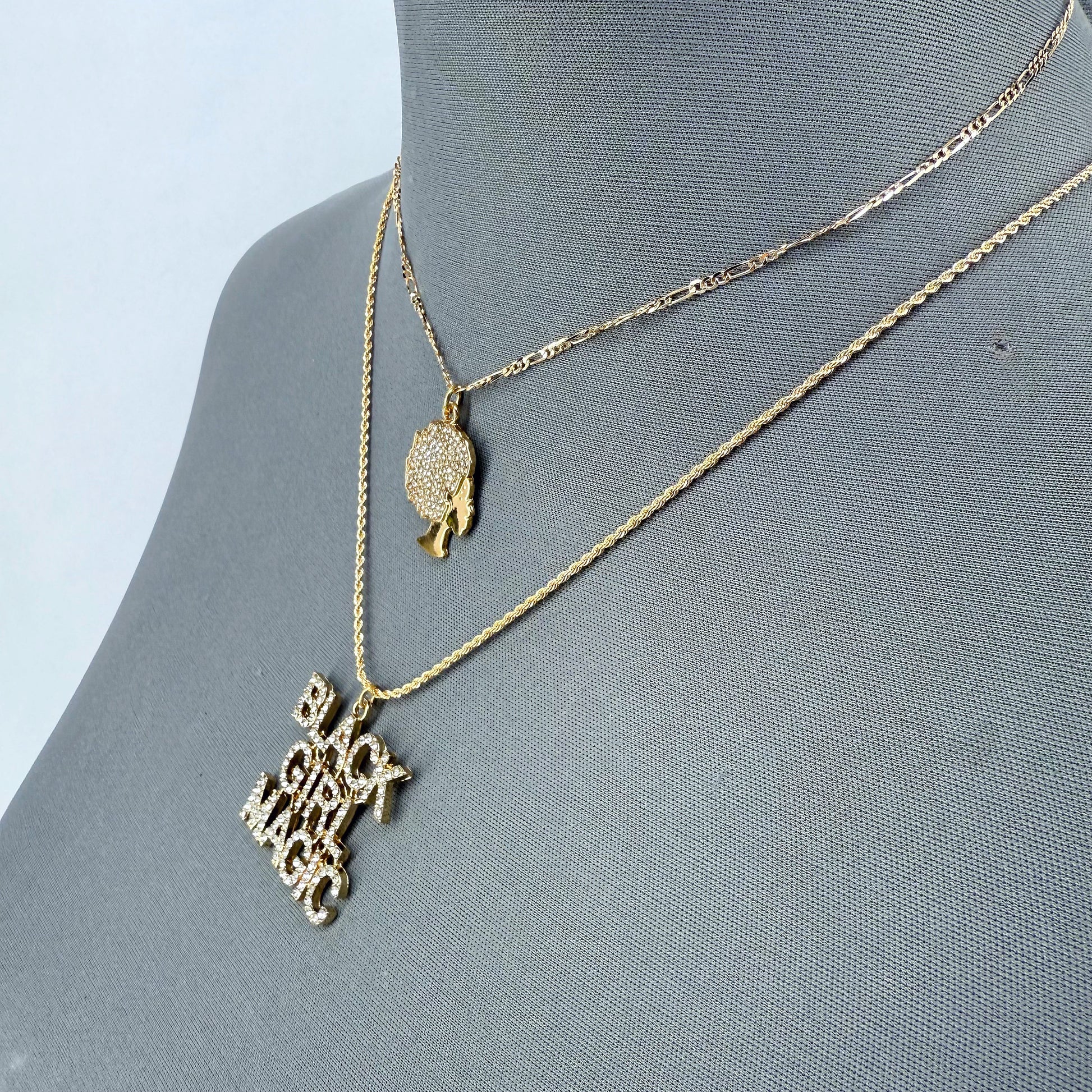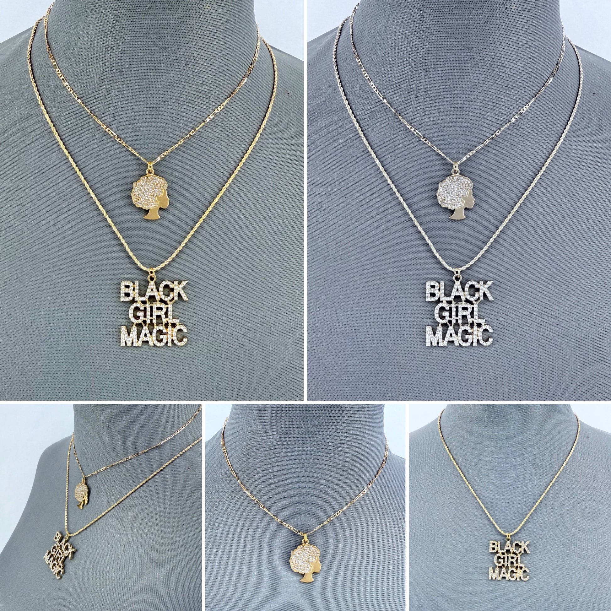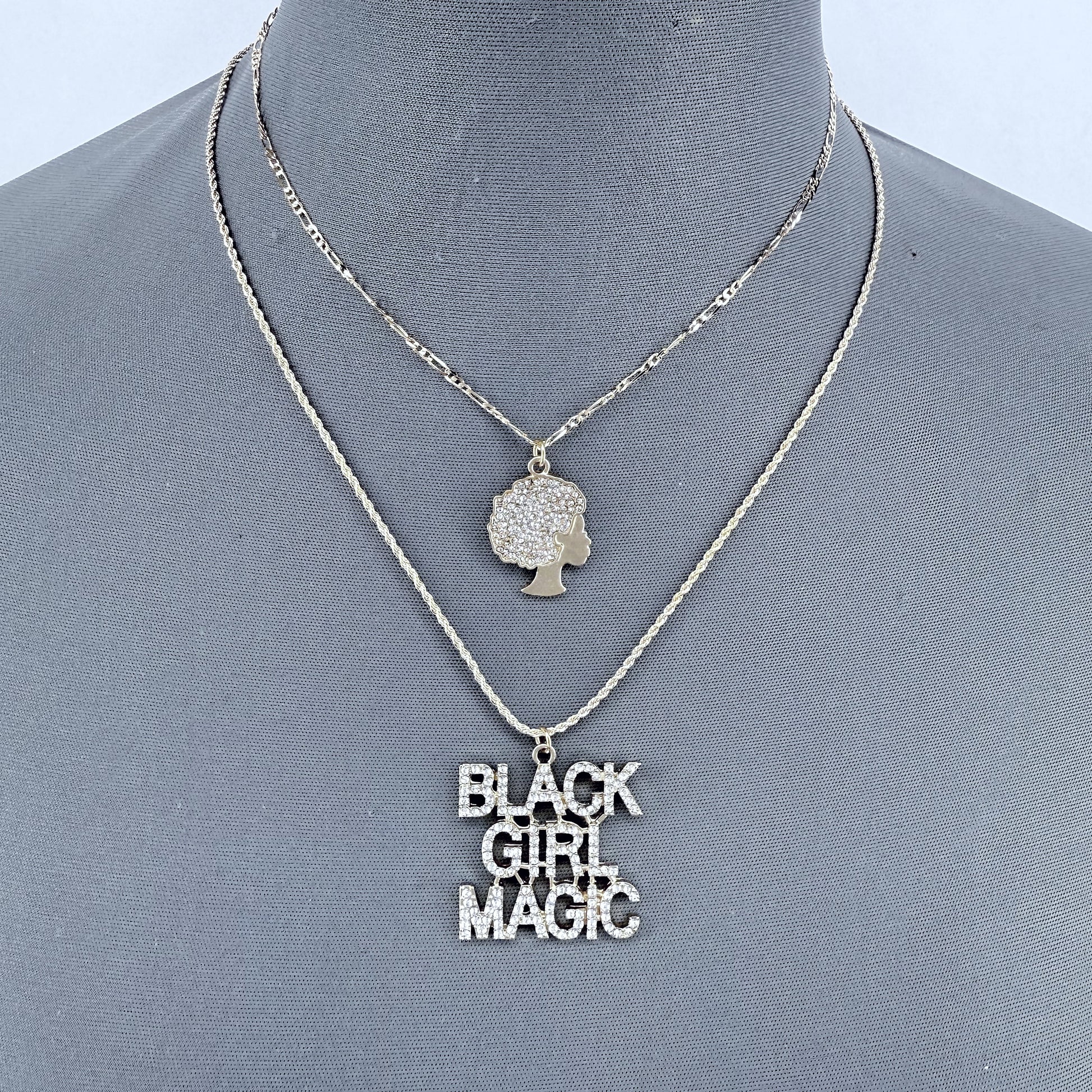 Elevate your style with this elegant set of two necklaces, available in gold or silver finish, each featuring a striking Black Girl Magic pendant that celebrates empowerment and beauty.
