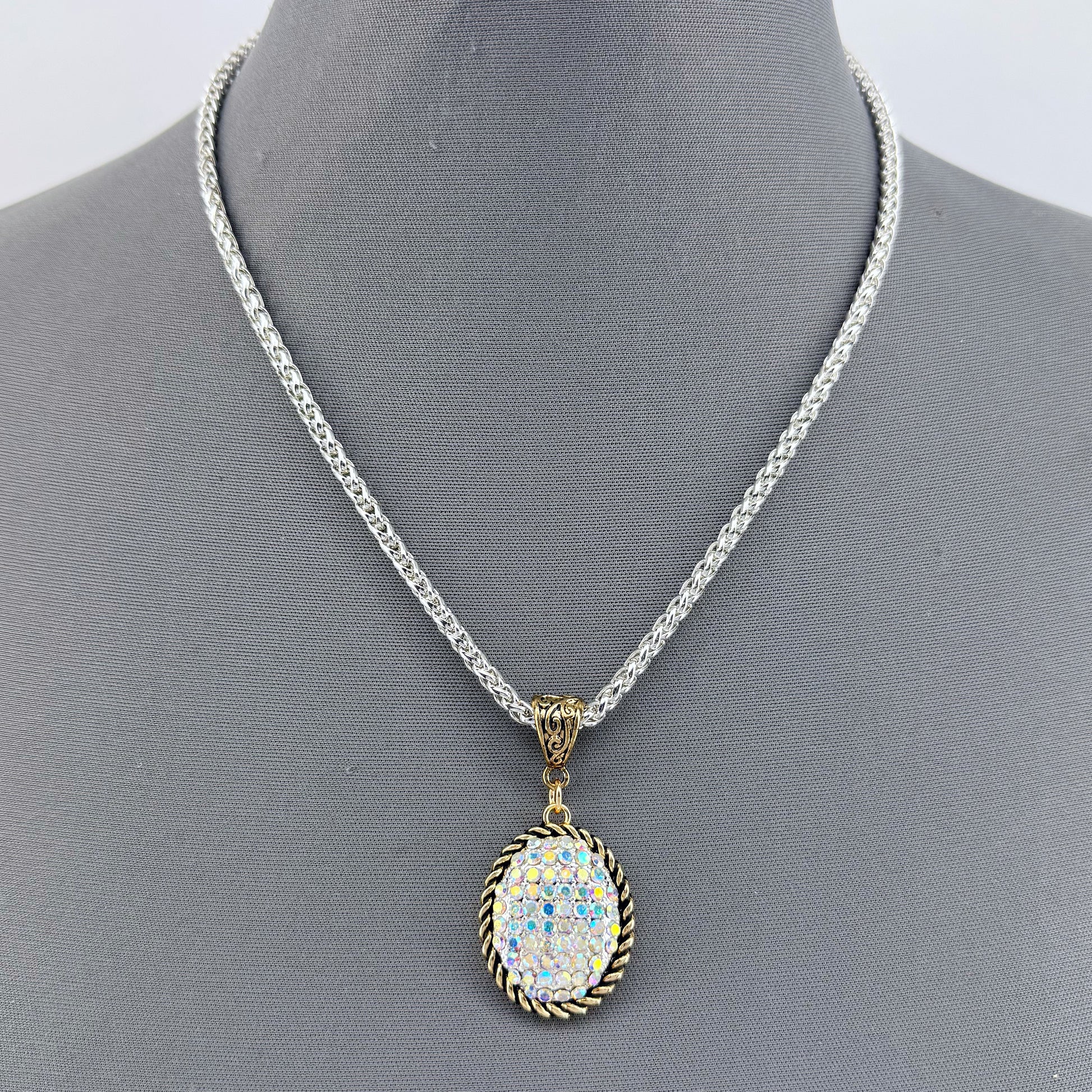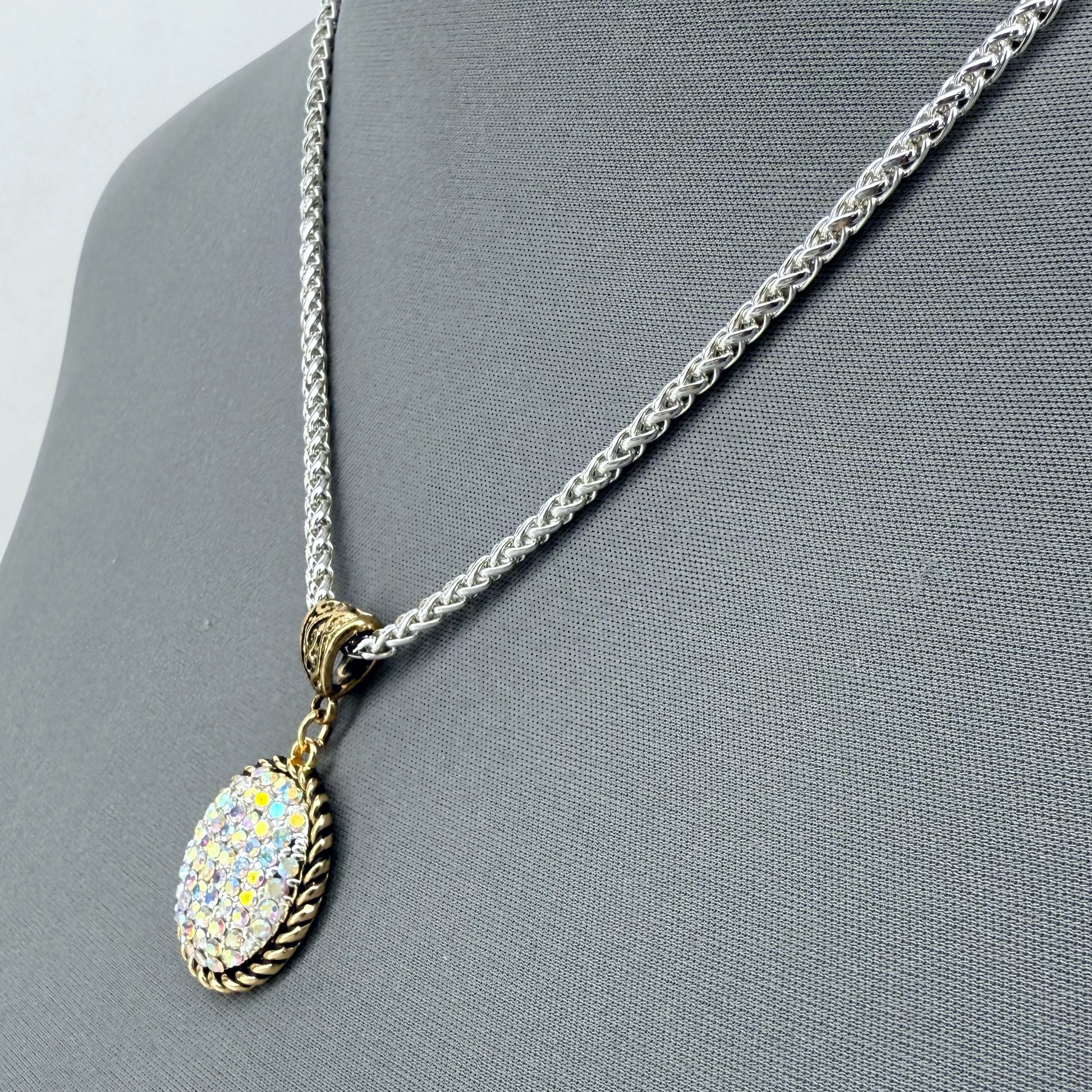 Elevate your style with this stunning necklace featuring a delicate silver-finished filigree chain, complemented by a radiant gold-finished pendant adorned with sparkling rhinestones. Perfect for adding a touch of elegance to any outfit.