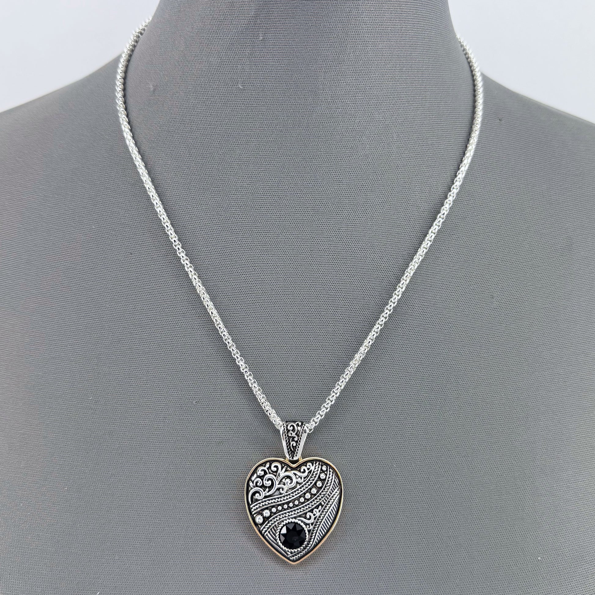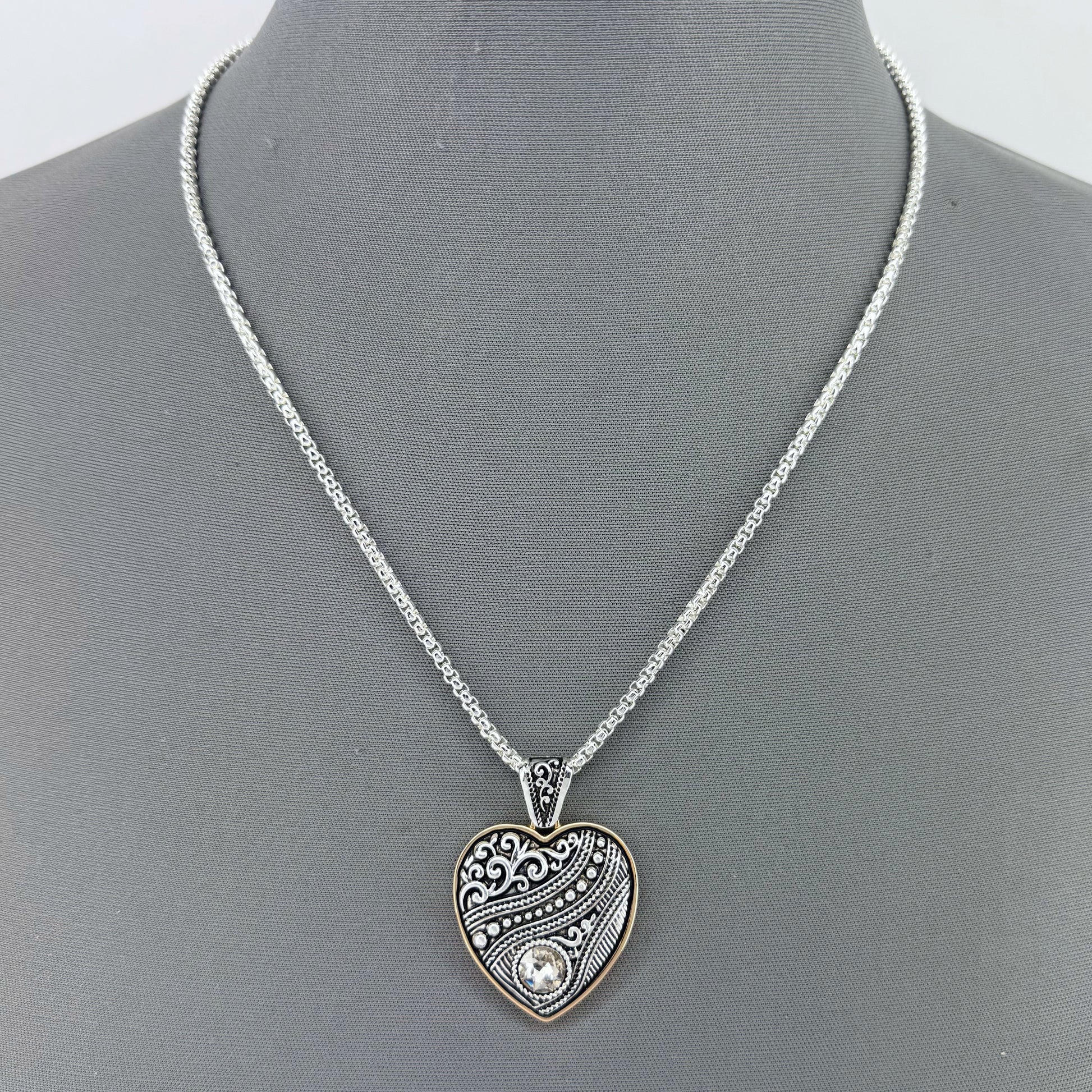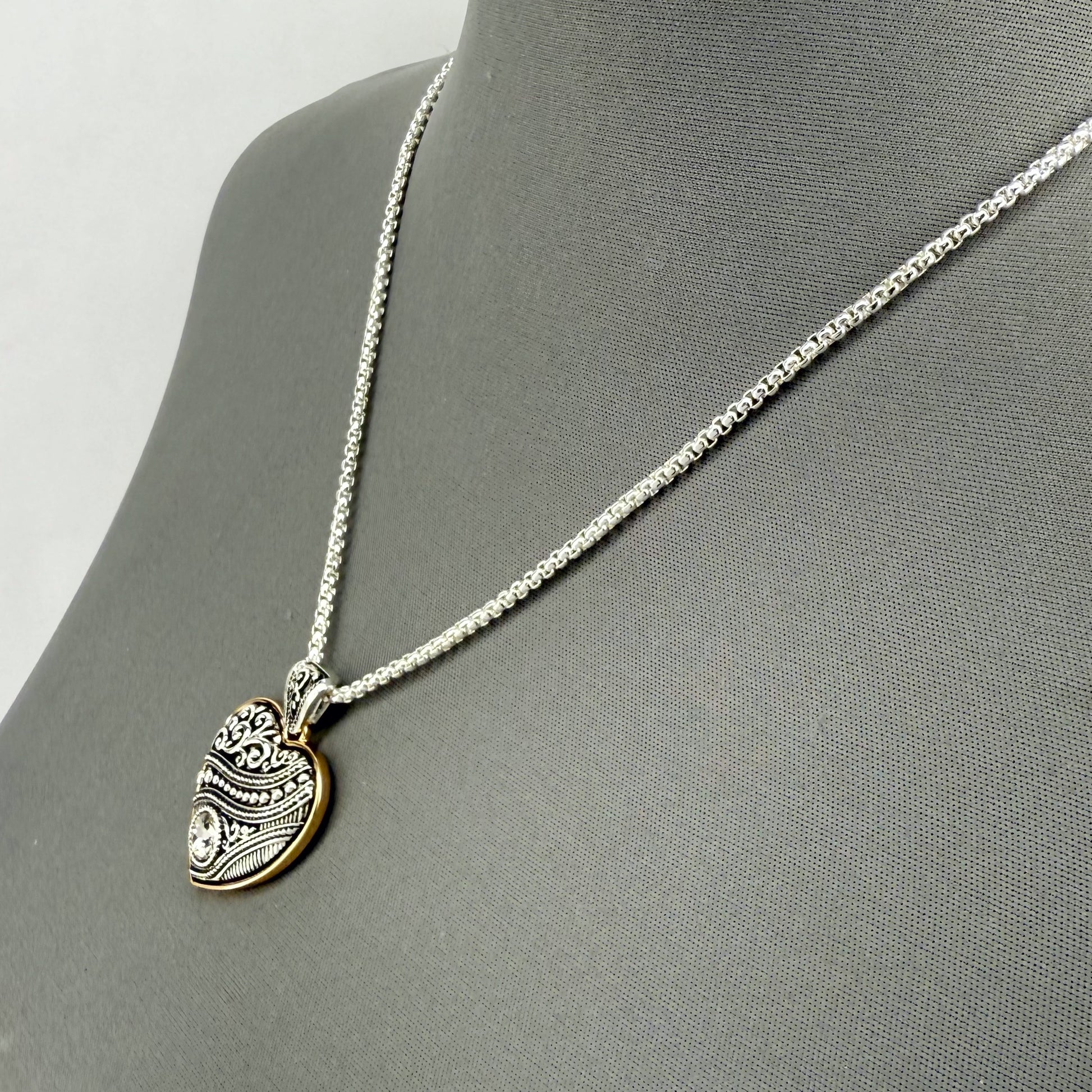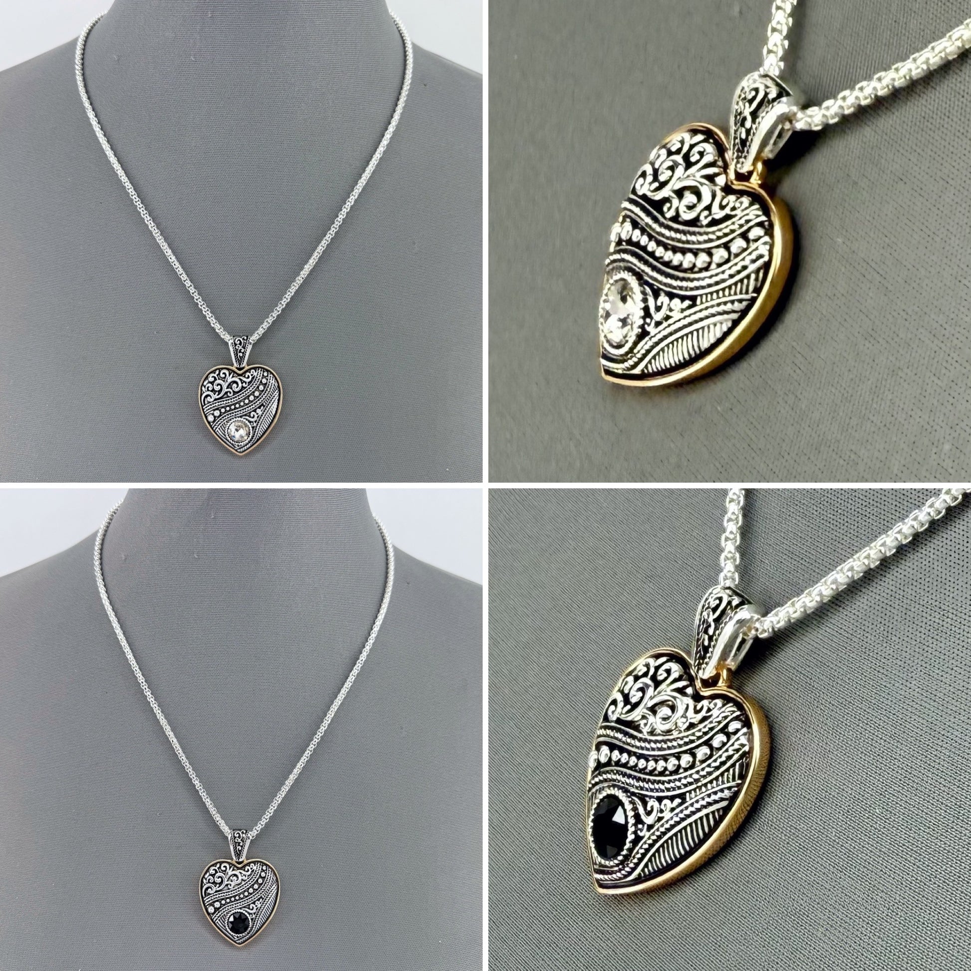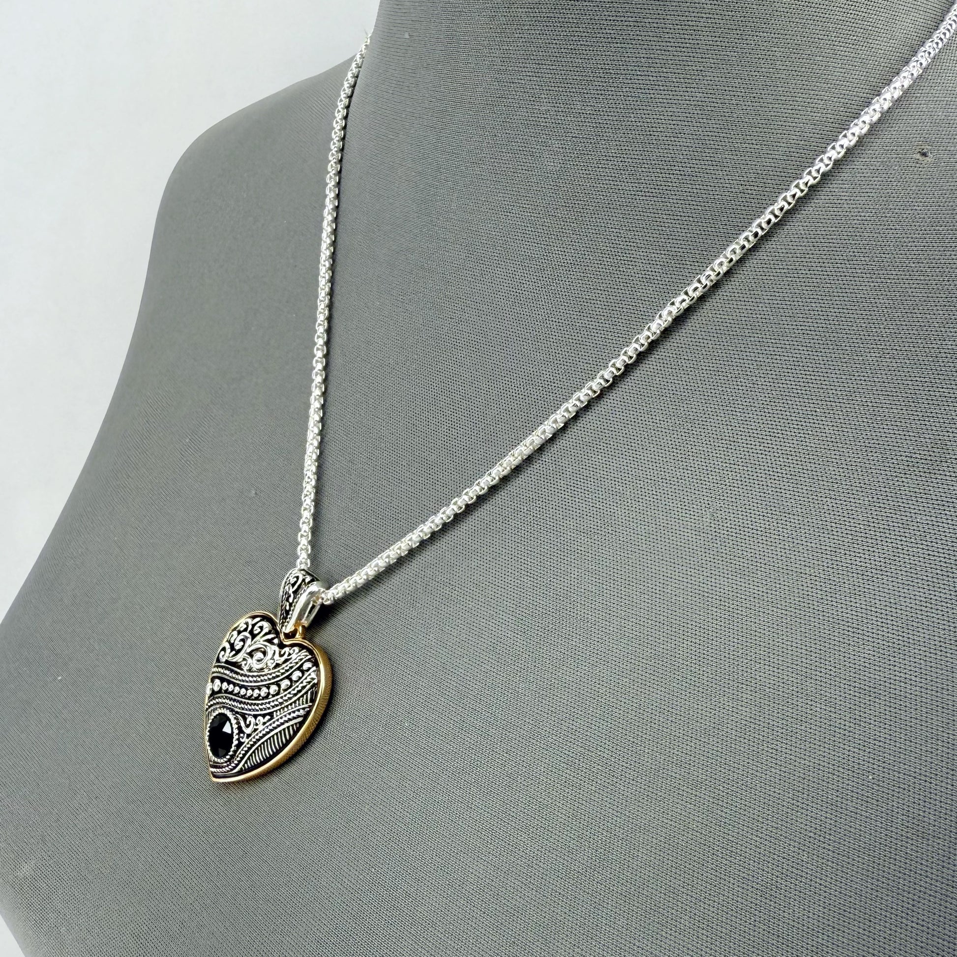 This silver-finished chain showcases a two-tone heart-shaped glass stone pendant, enhanced with delicate filigree work for a stylish and timeless accessory.