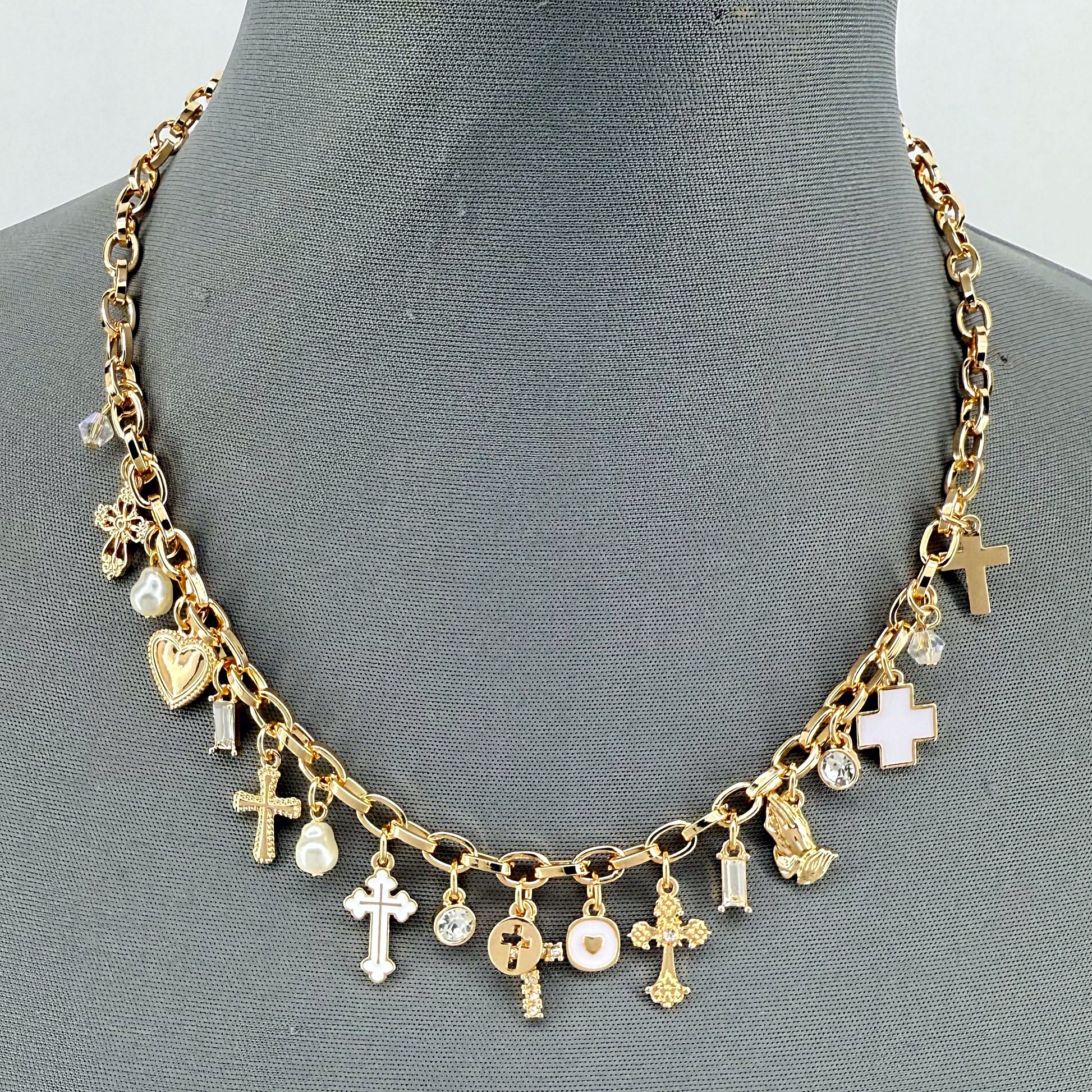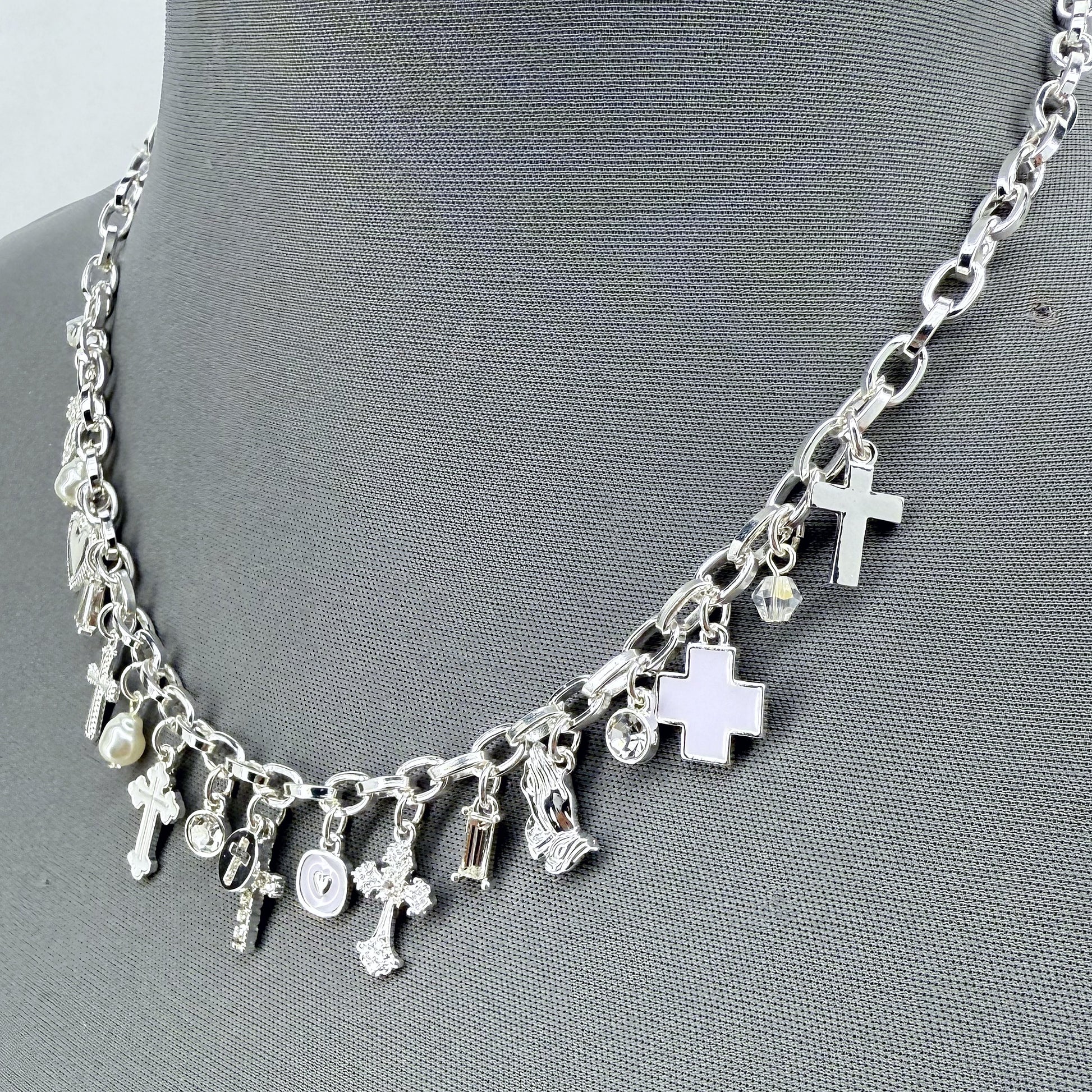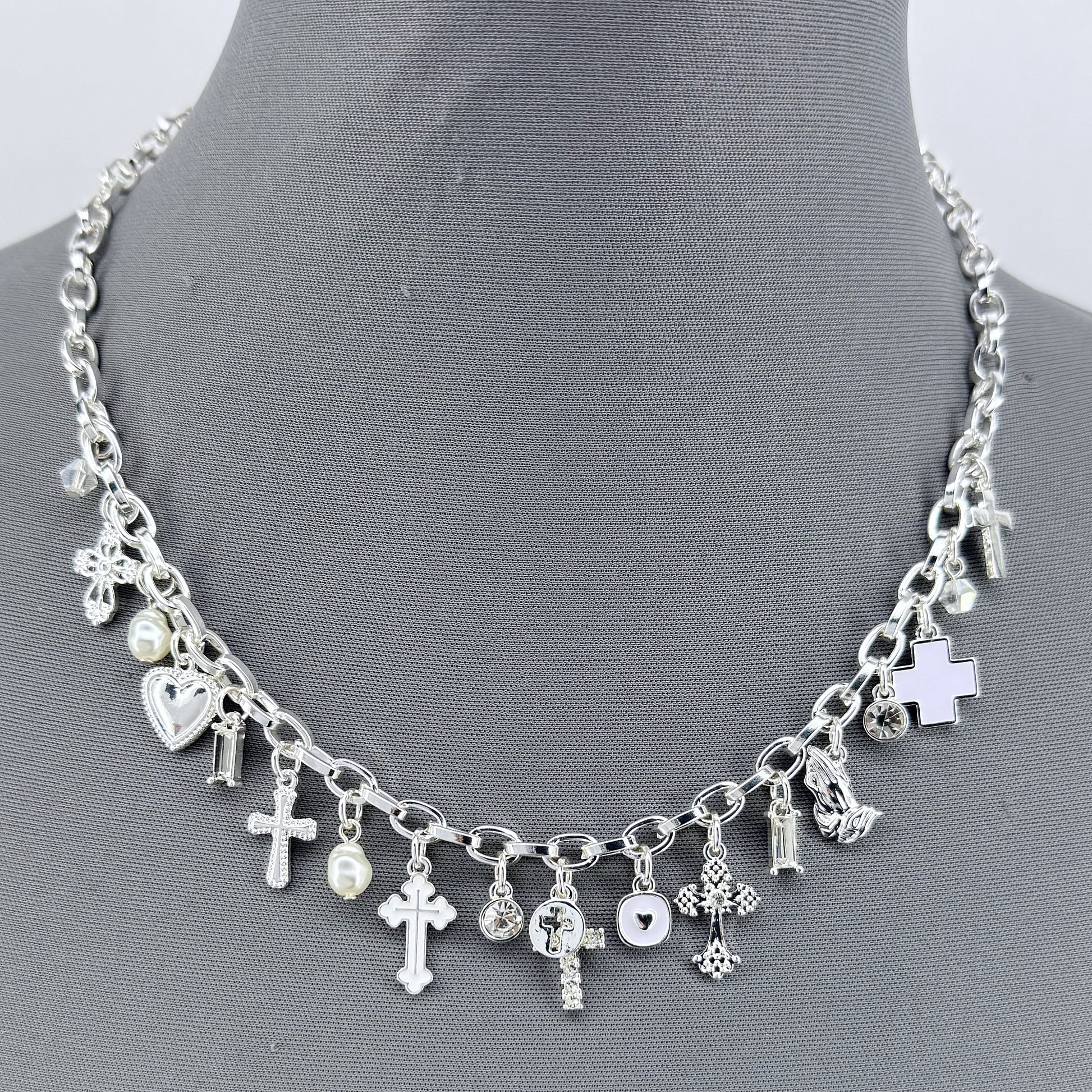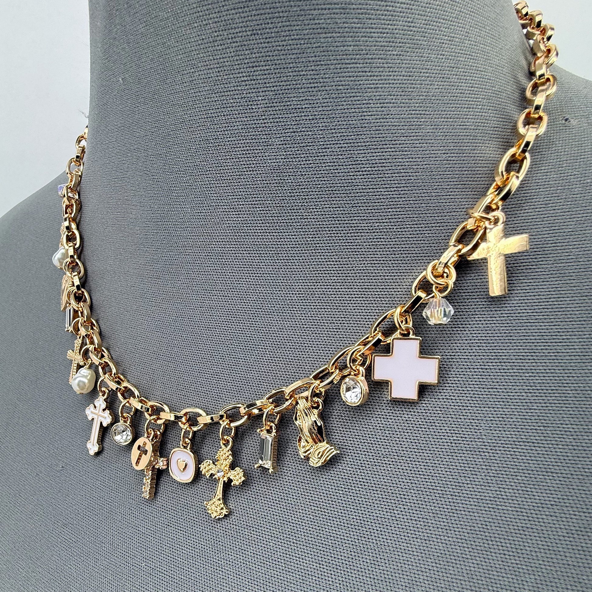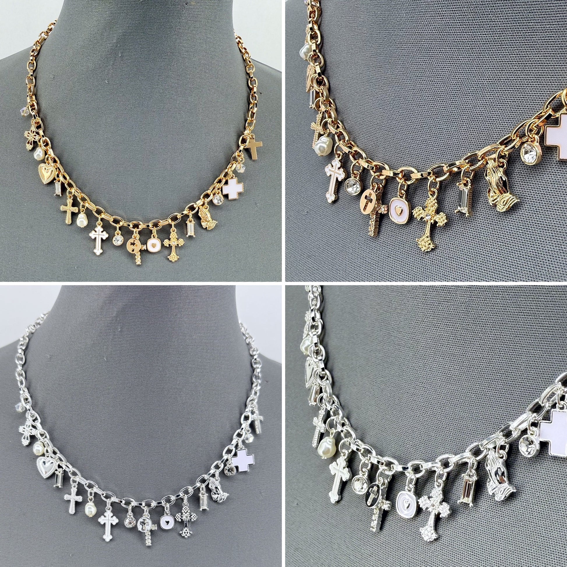 Make a statement with this gold or silver chain necklace featuring an array of charms, including crosses, hearts, and sparkling rhinestones. Its unique design adds a touch of elegance and personality to any look.
