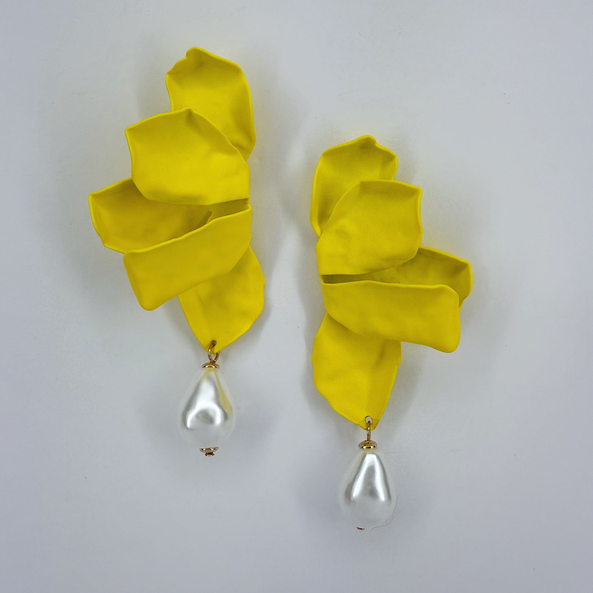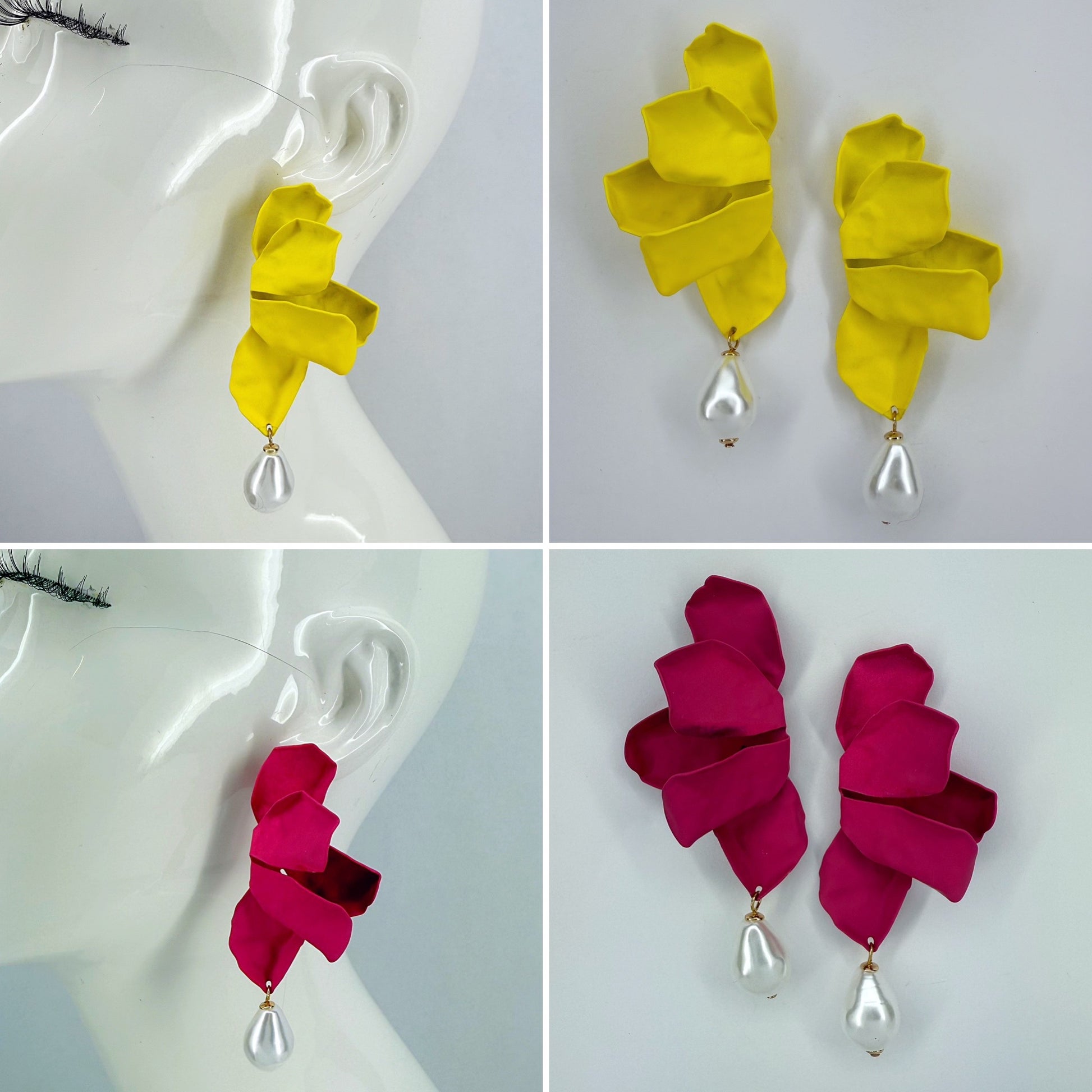 Elevate your style with these elegant metal earrings featuring a delicate folded flower design and a graceful pearl dangle. Perfect for adding a touch of sophistication to any outfit.