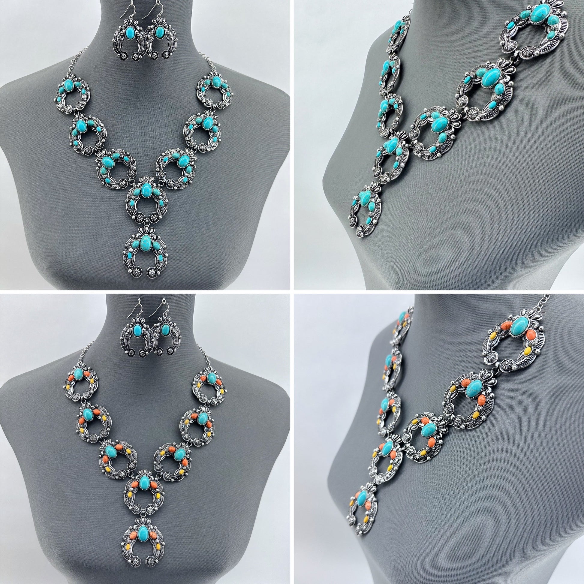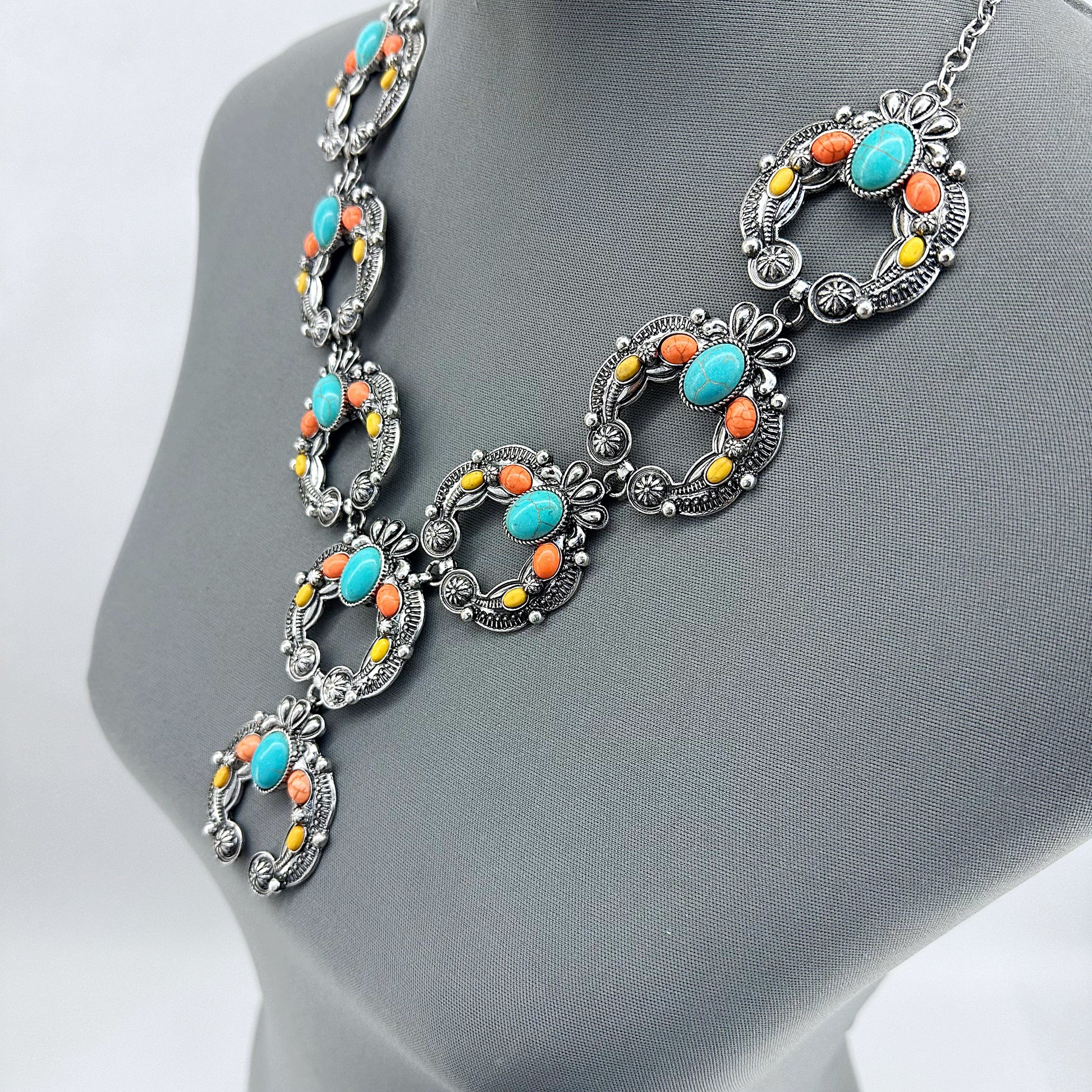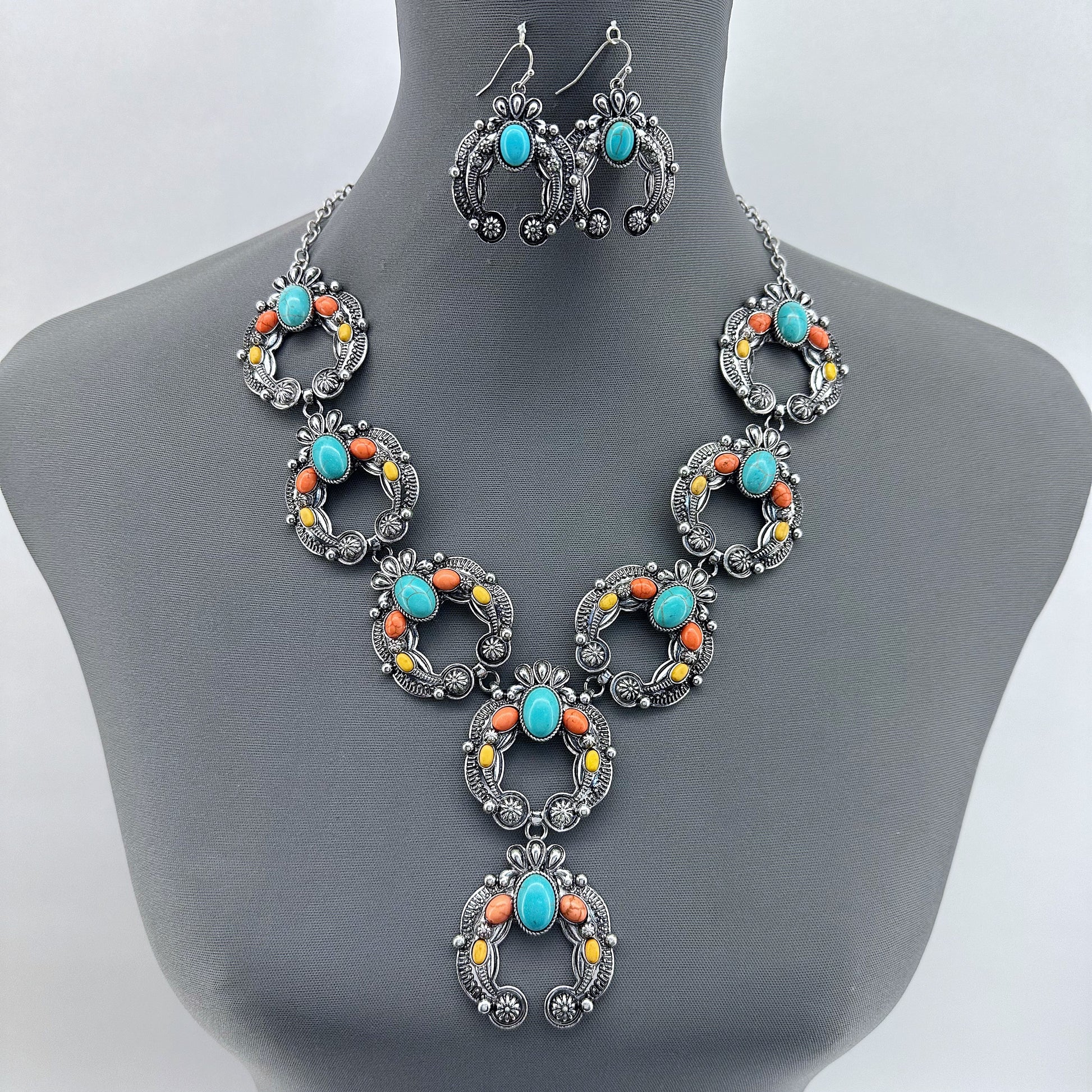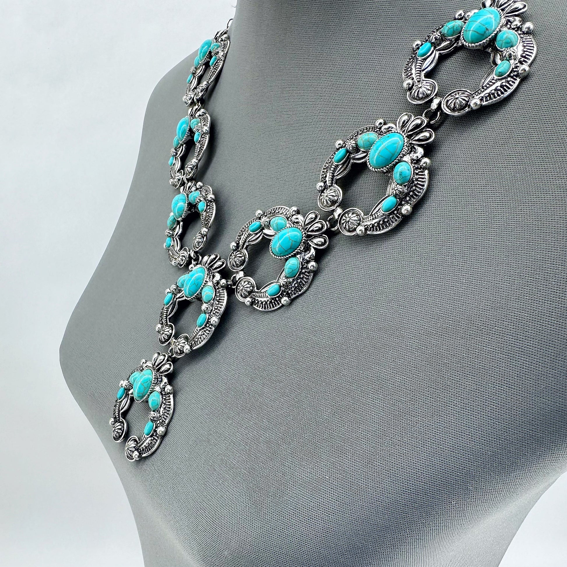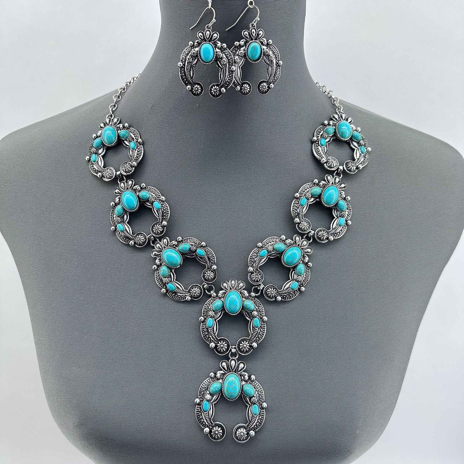 Long Silver Finish Squash Necklace Set With Turquoise Pendant