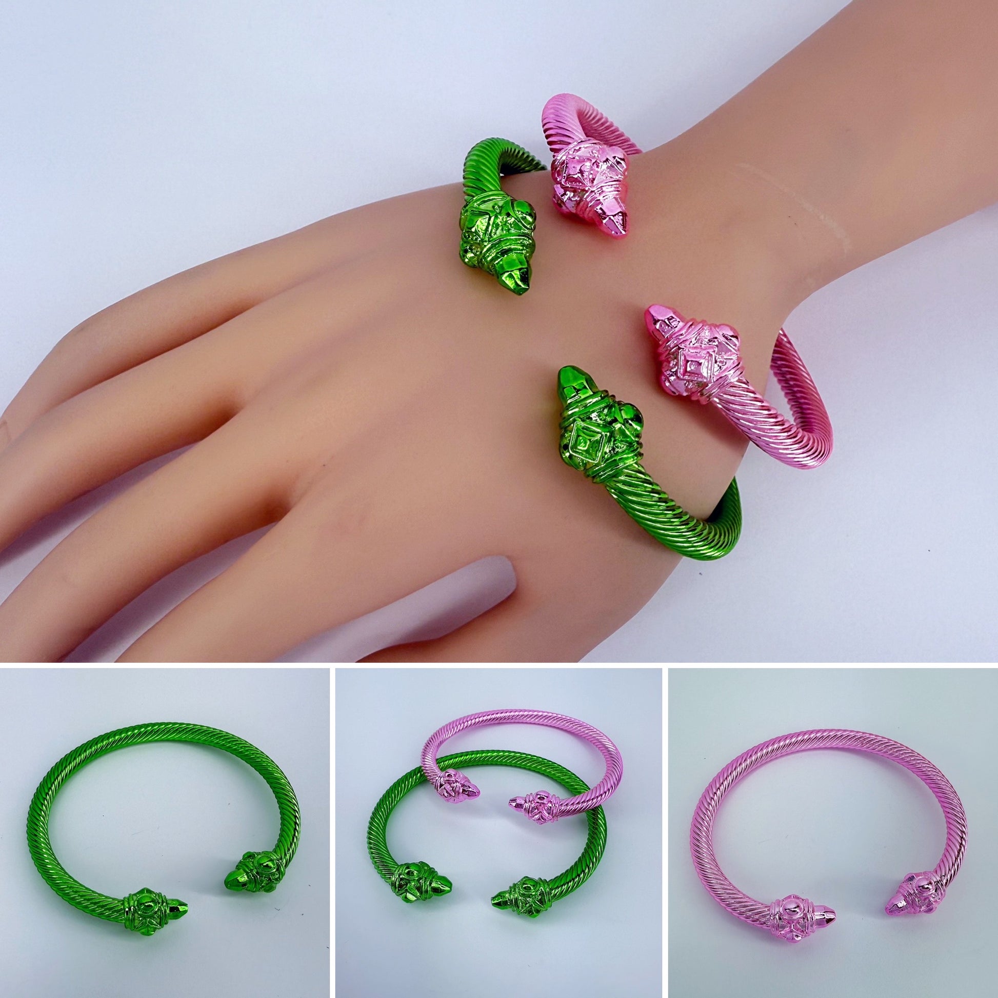 This duo of bracelets features vibrant pink and green cable designs, perfect for adding a stylish pop of color to any outfit. Crafted to complement each other, these two bracelets offer a trendy and versatile accessory set that enhances your look effortlessly.