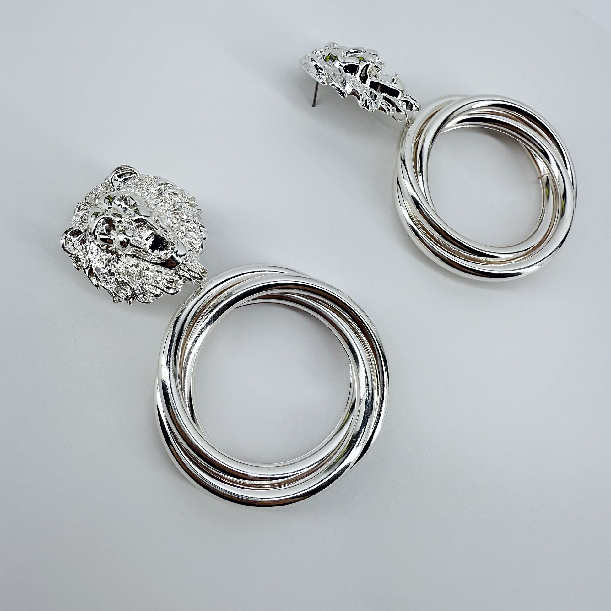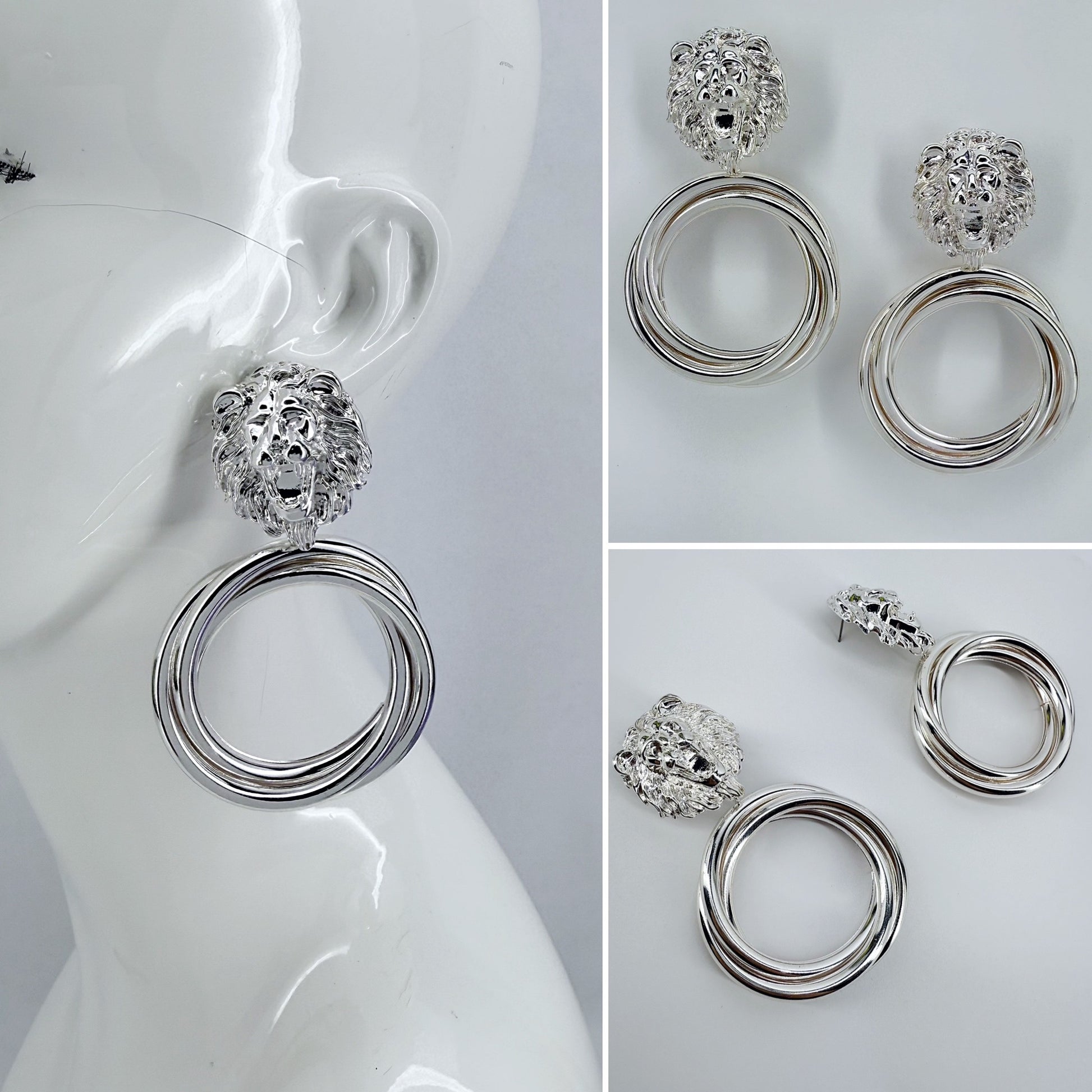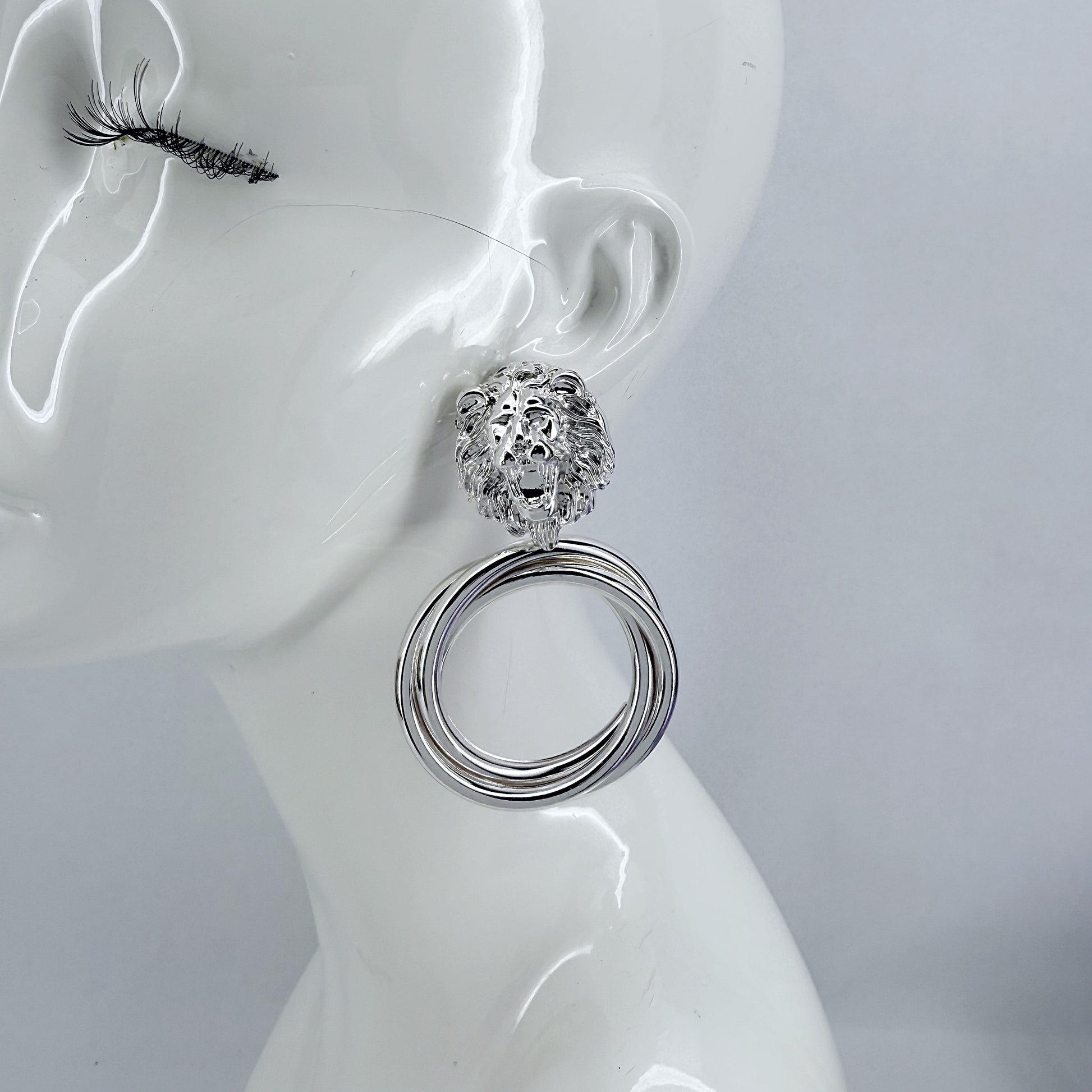 These silver-finished earrings feature a striking lion head design with triple rings that dangle elegantly. Crafted with metal post backs, they offer both style and secure comfort for everyday wear.