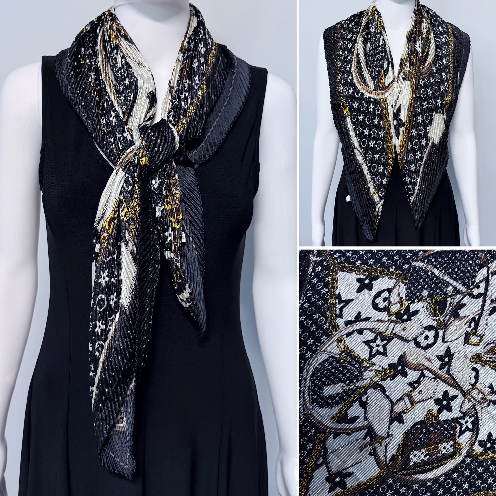 Black Silk Feel Pleated Scarf With Rhinestones