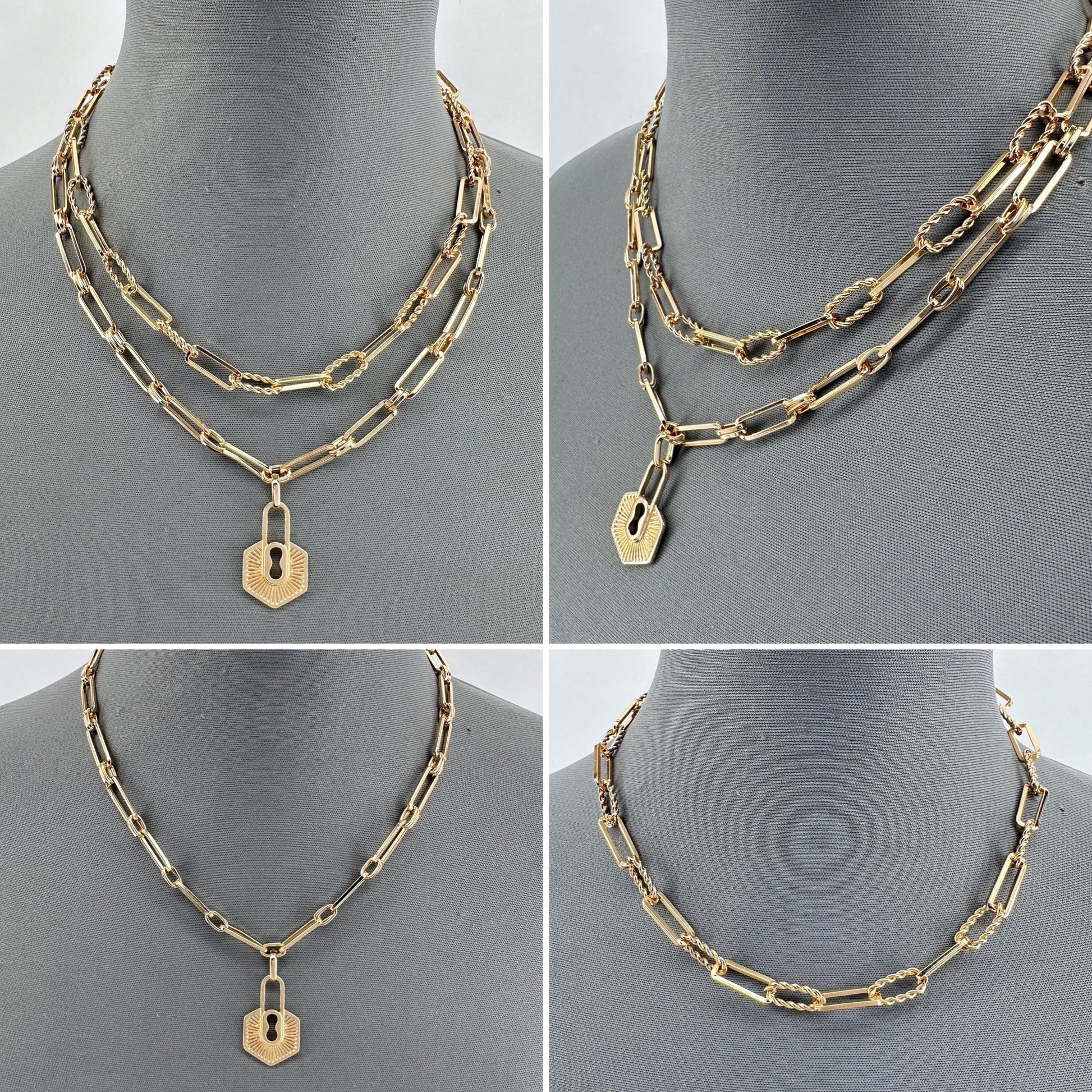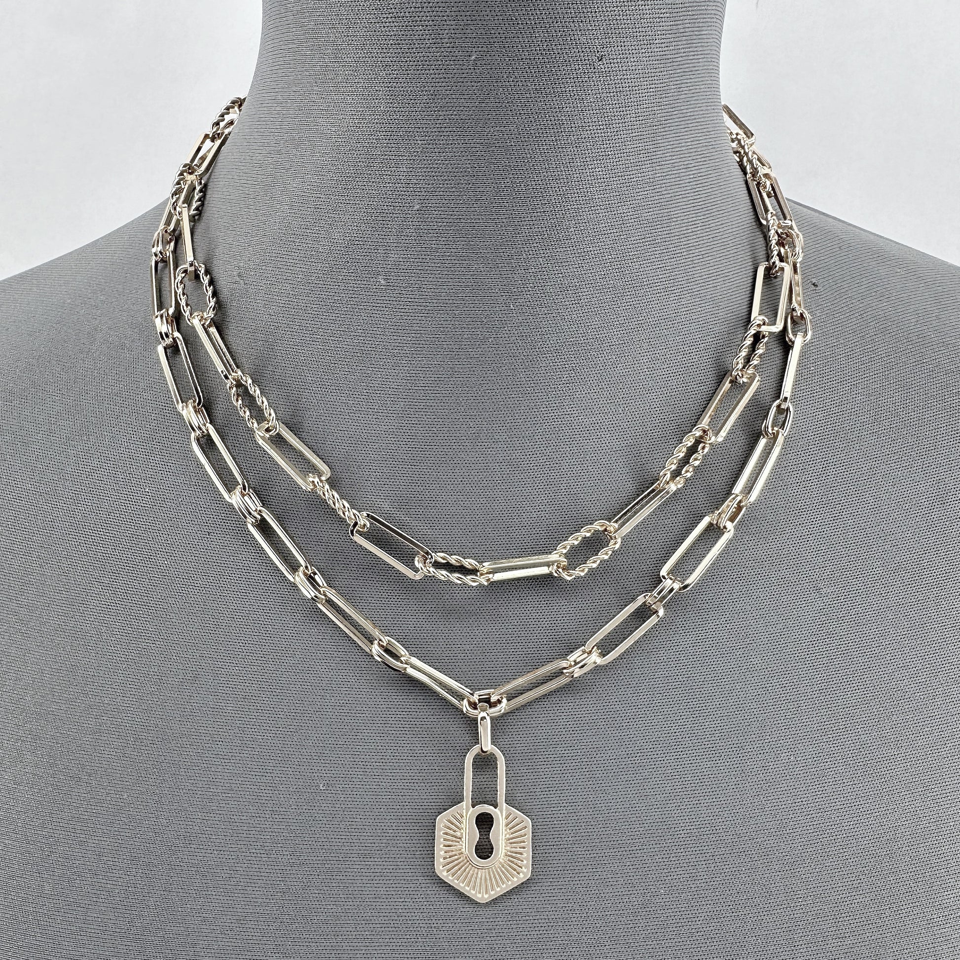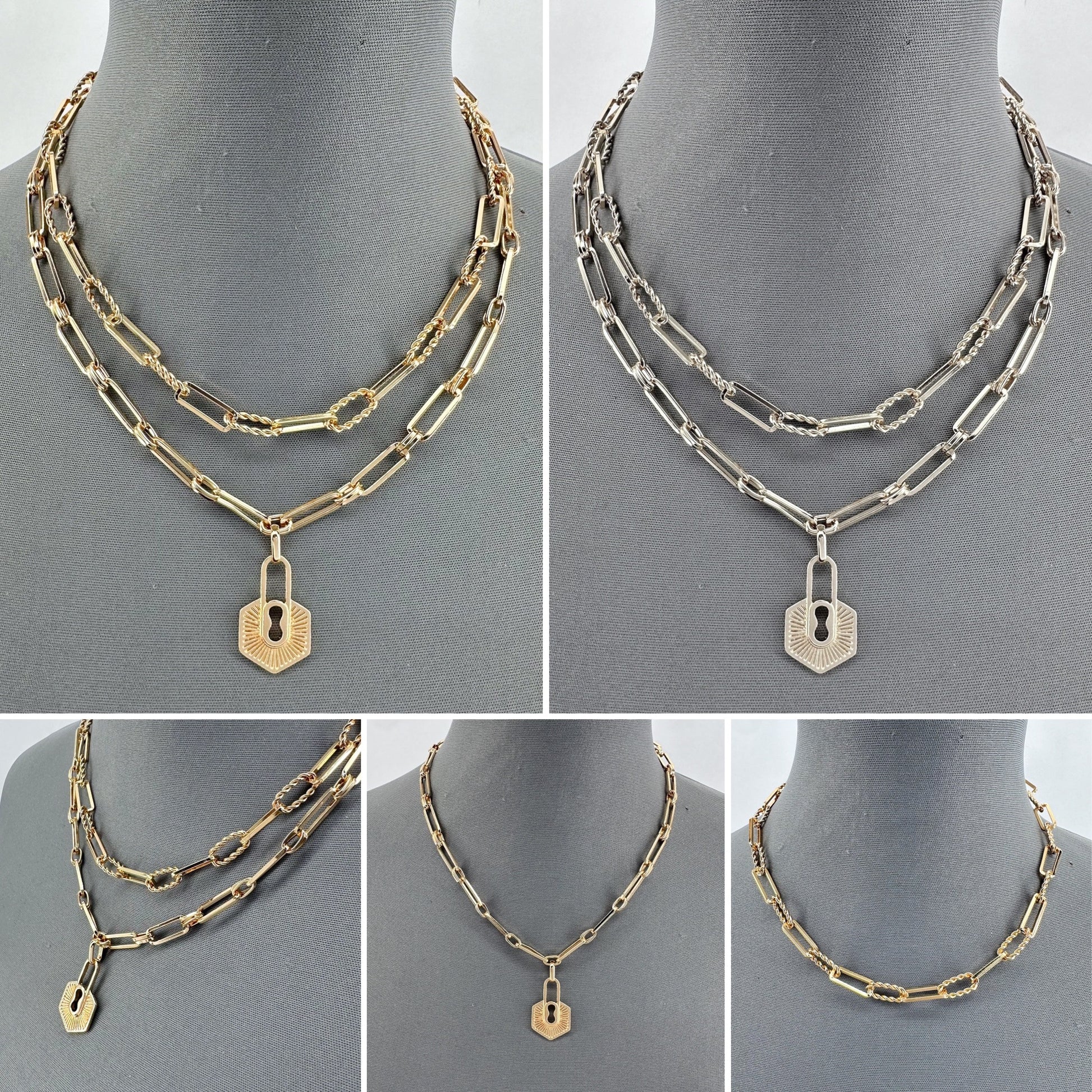 Rev up your style with the Double Paperclip Chain Necklaces and Lock Pendant, available in gold or silver finish.