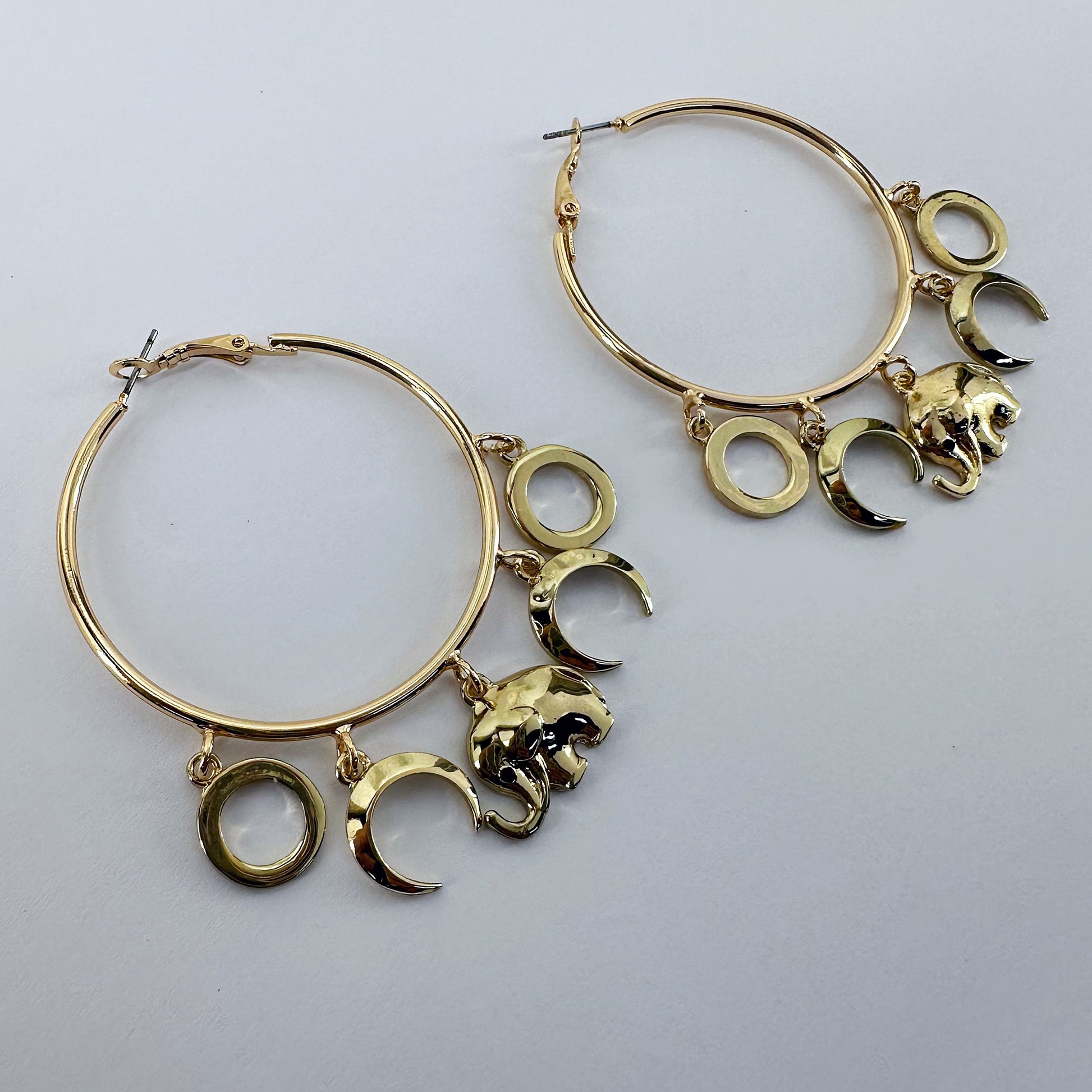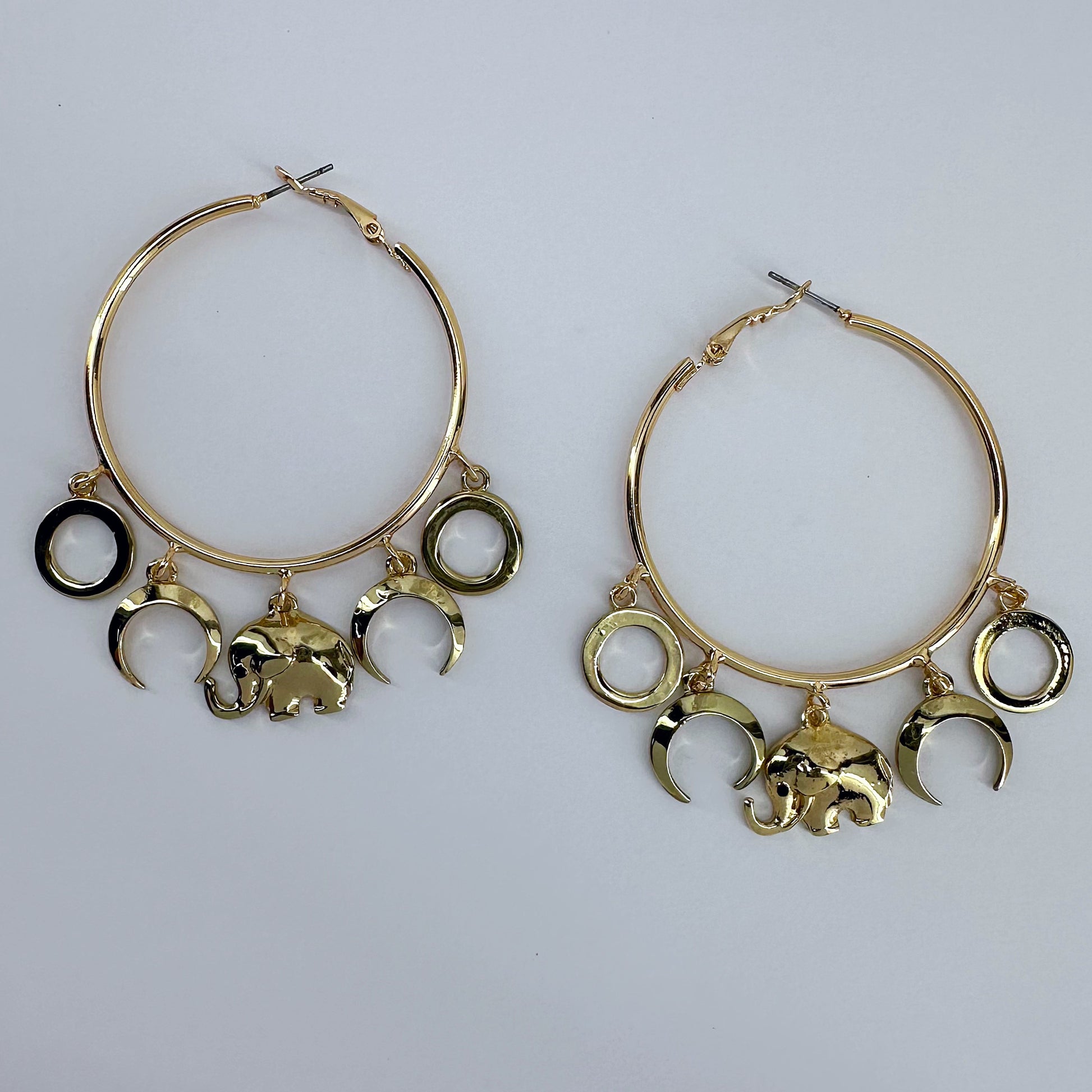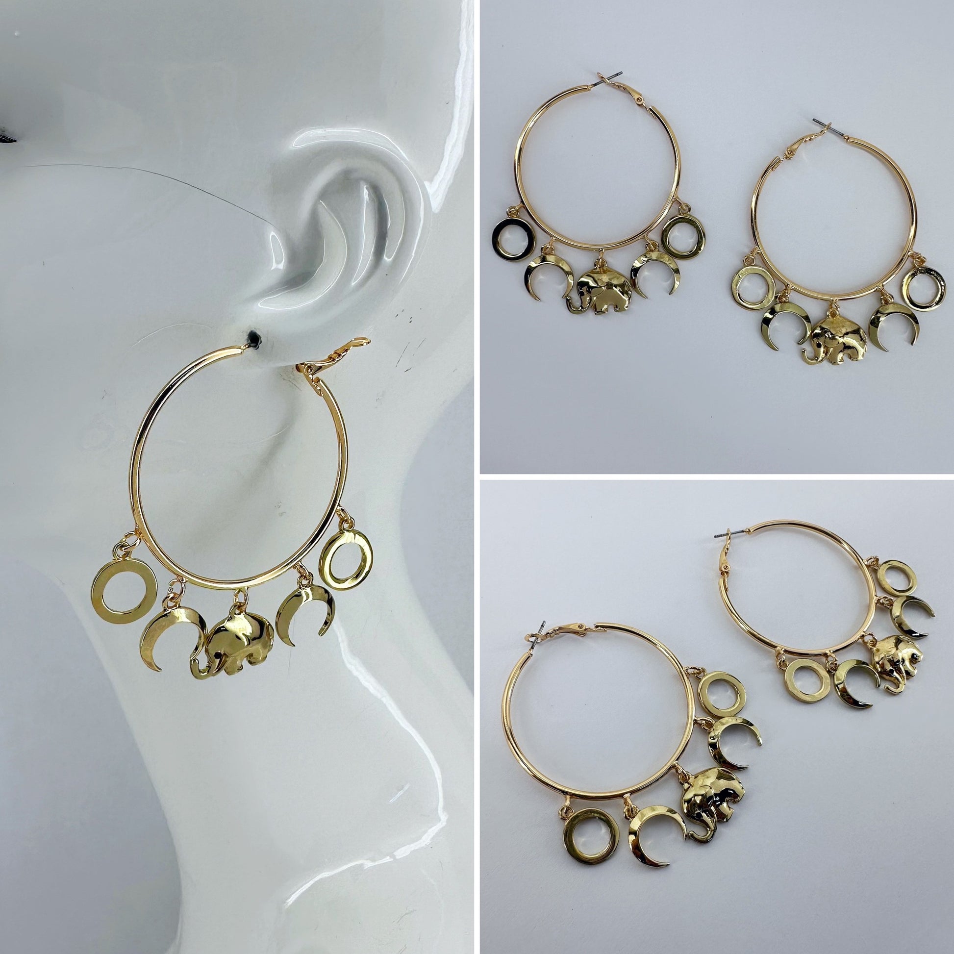 Experience the luxurious elegance of our Gold Finish Hoop Earring With Circle, Moon, And Elephant Dangles. Perfectly crafted to add a touch of glamour to any outfit, these earrings feature delicate dangles that will catch the eye and inspire a sense of wanderlust. Don't miss out on this stunning accessory - order now!