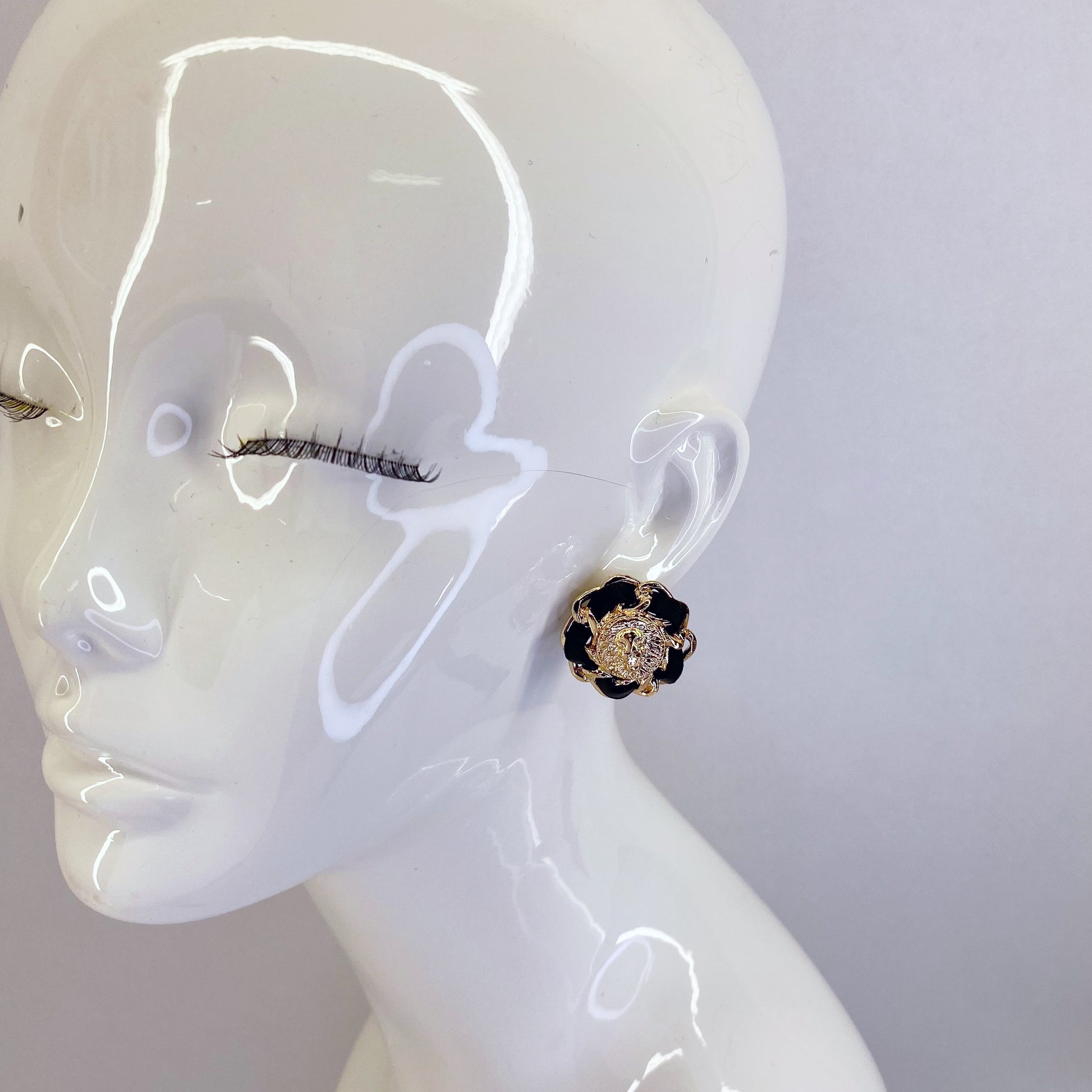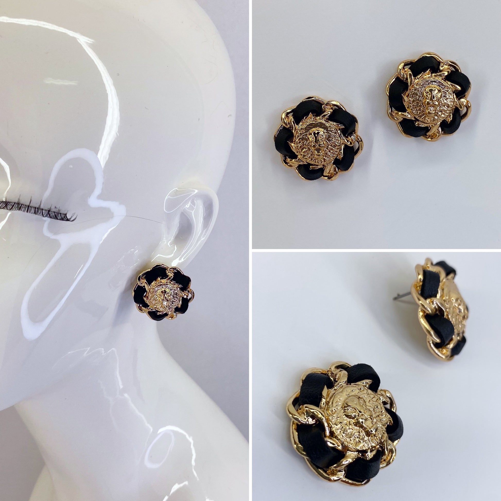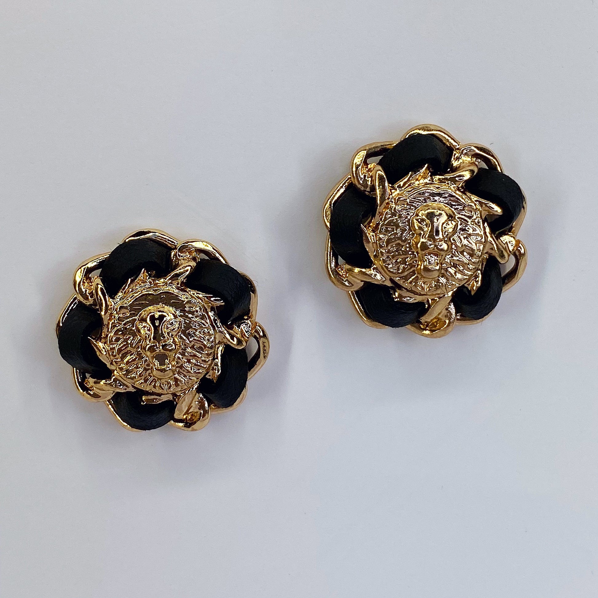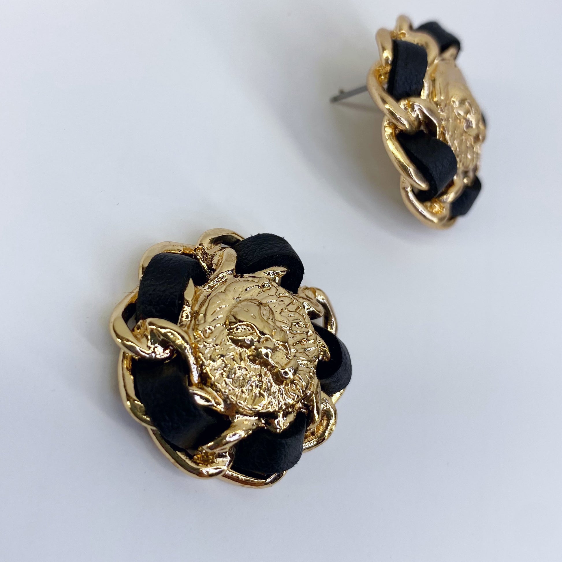 Gold Post Back CC Chain Lion With Black Leather Breaded