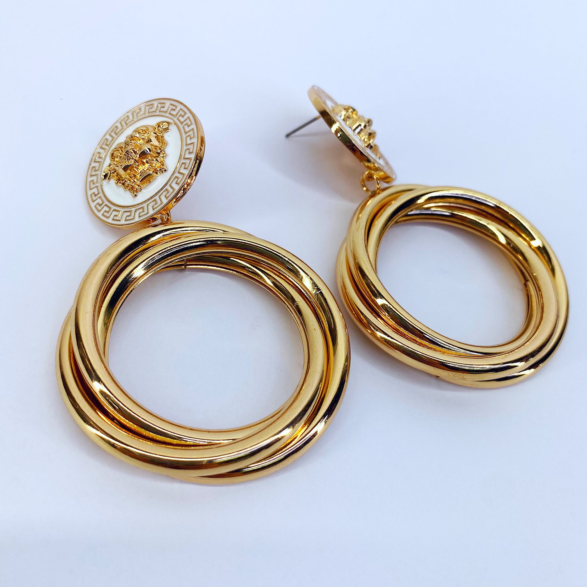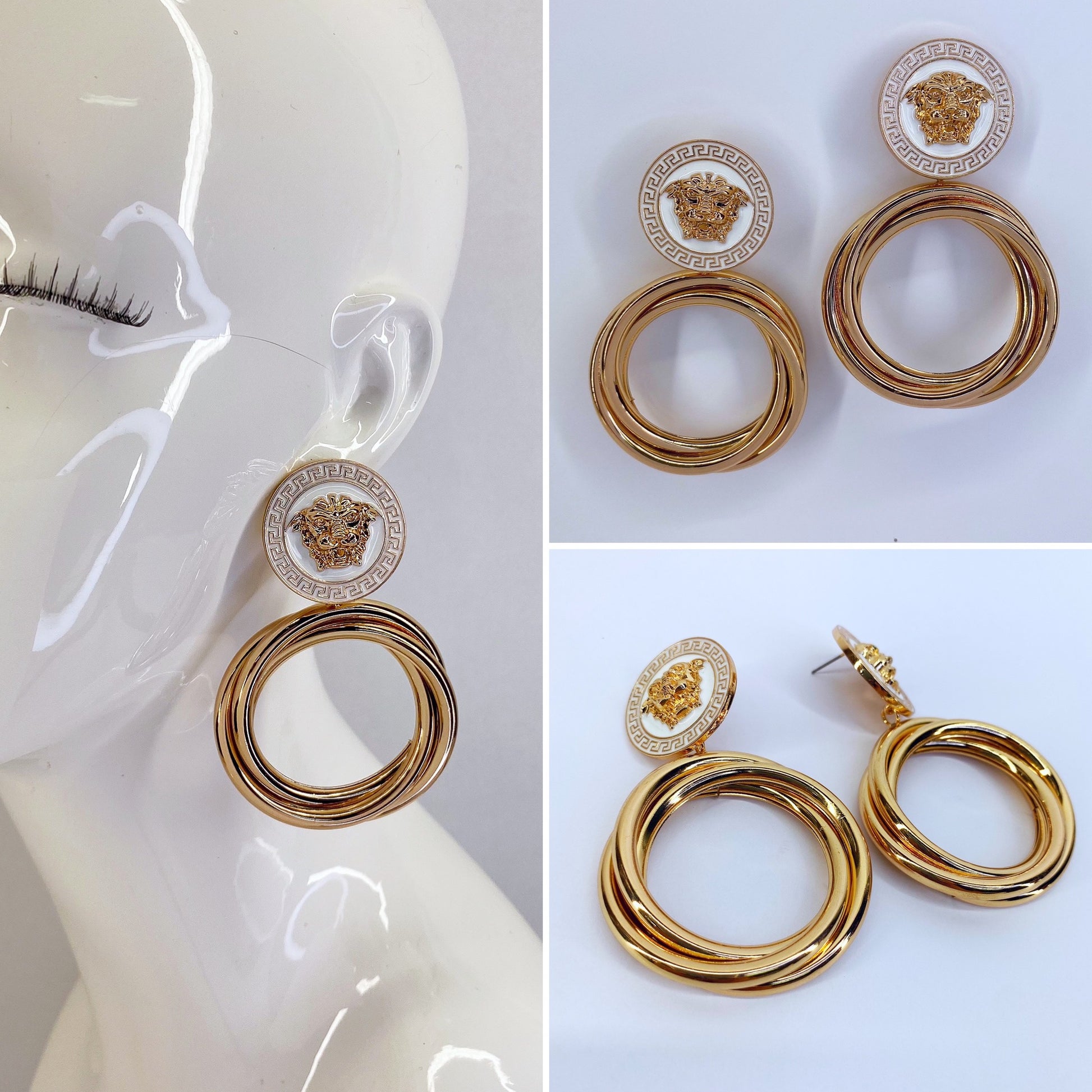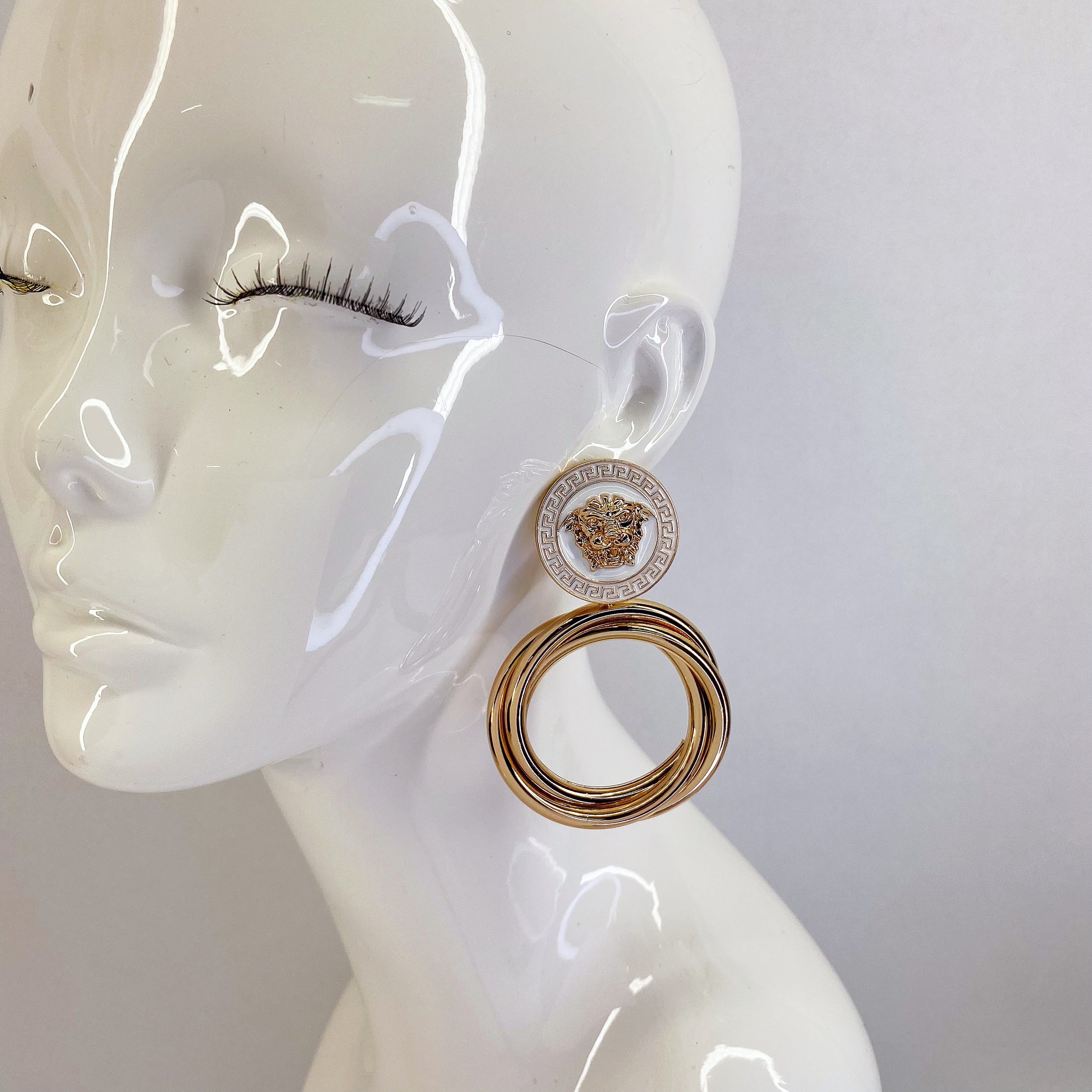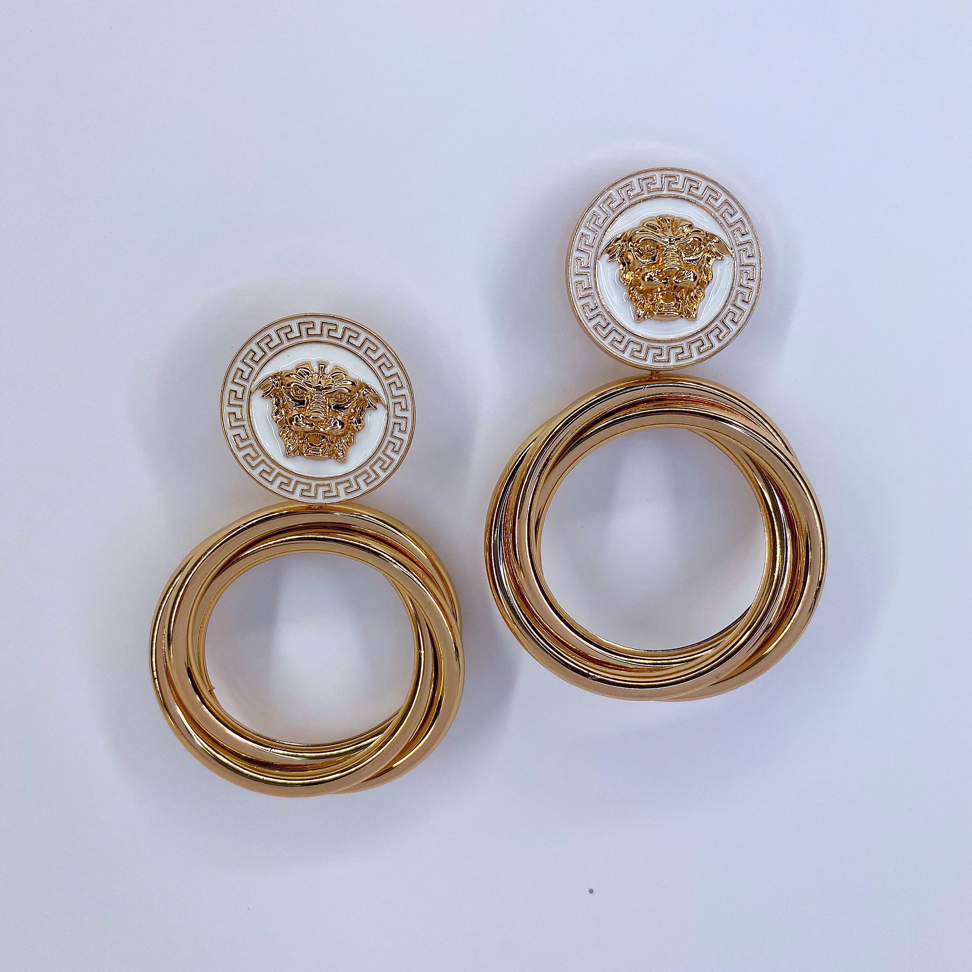Gold Post Earring With White Expoxy Coin Gold Lion And Multi Rings
